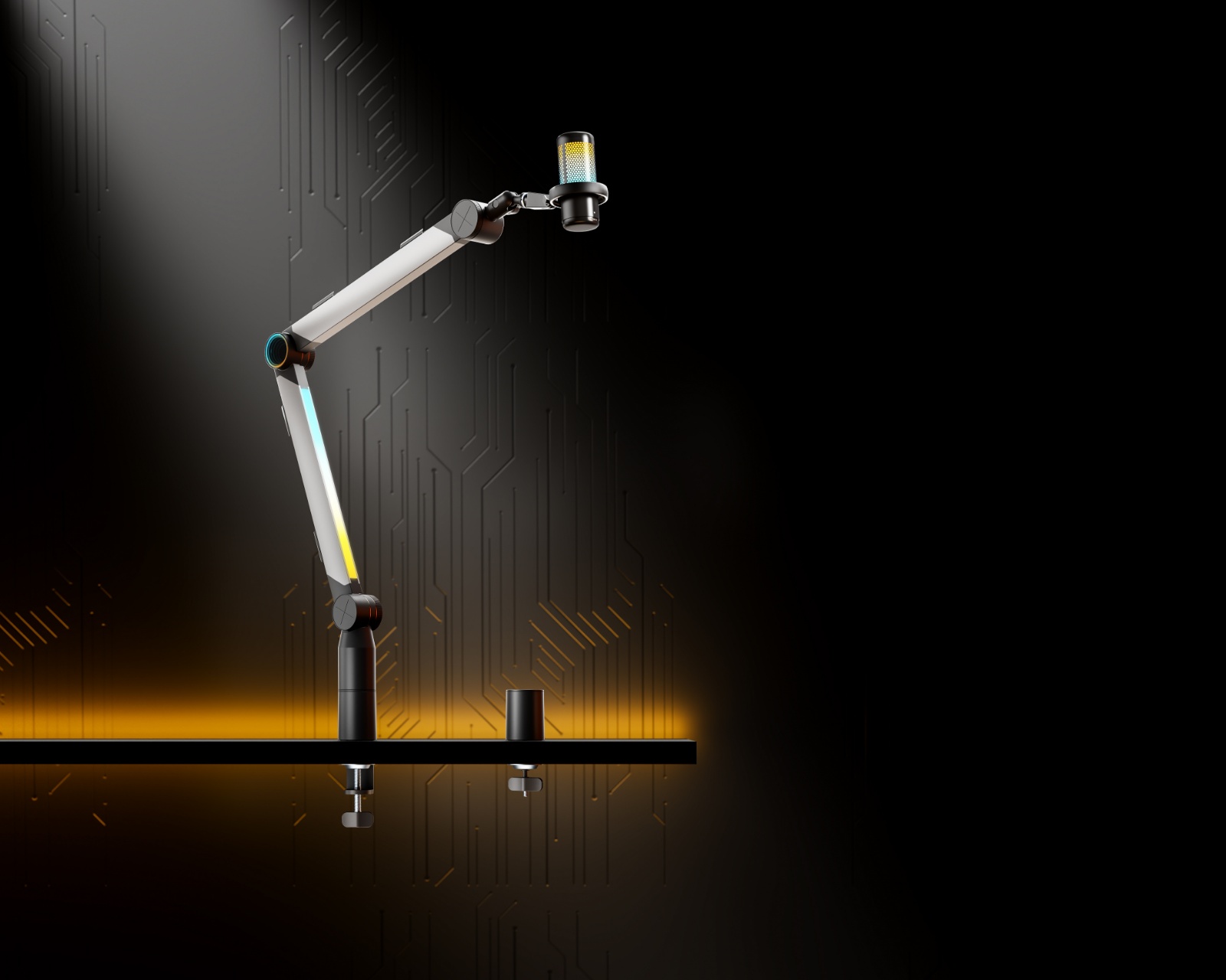 Aluminium Dynamisk RGB Mikrofonarm er en premium mikrofonarm fra MaxMount, utformet for å forbedre både profesjonelle gaming- og streamingmiljøer. Den integrerte volumkontrollen gir brukeren mulighet til å enkelt justere systemvolumet, mens det unike designkonseptet med et uendelig speil ved leddet og RGB-striper langs den nedre armen skaper en iøynefallende visuell effekt. Mikrofonarmen er bygget for holdbarhet og stabilitet, som kombinerer pålitelig ytelse med en modern estetikk for å tilby en høyverdig løsning for innholdsskapning og liveproduksjon.Mikrofonarmen er laget av kvalitetsmaterialer som aluminium, plast og stål, som gir en holdbar konstruksjon. Med sin maksimale vektkapacitet på 1,5 kg og en justerbar høyde på opptil 1028 mm kan brukeren enkelt tilpasse armens posisjon for å oppnå optimal komfort under livestreaming. Den dynamiske RGB-belysningen skaper levende fargeeffekter som kan tilpasses etter stemningen. Kabelhåndteringen holder alt organisert og fritt fra uorden, og takket være 3/8" og 5/8" adaptere er mikrofonarmen kompatibel med de fleste standardmikrofoner.