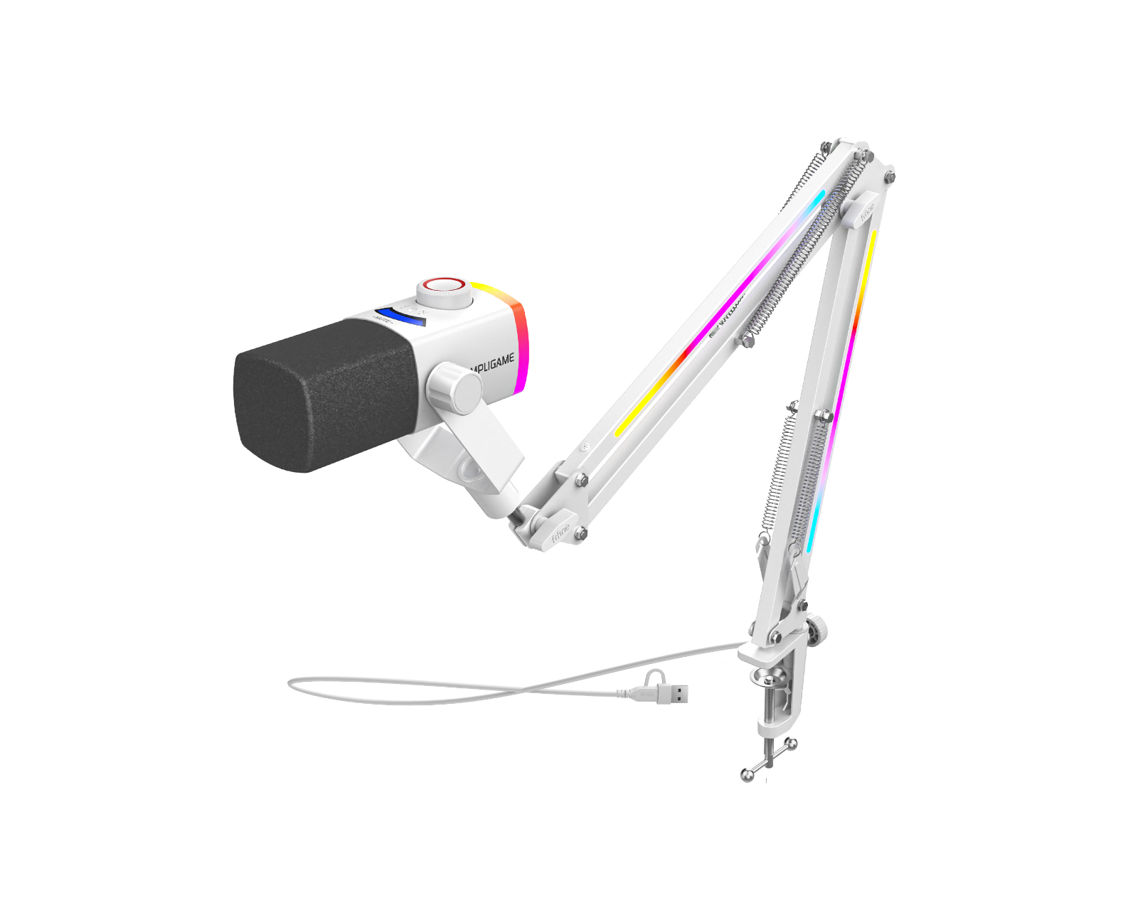 AmpliGame AM8PROT er en mikrofon med boom arm fra Fifine, designet for å levere høykvalitets lydopptak. Den støtter både USB- og XLR-tilkoblinger for fleksibilitet. Med et dynamisk mikrofonelement og en kardioid polaroppsett fokuserer den på lyd fra kilden og minimerer bakgrunnslyd.AmpliGame AM8PROT er bygget med høykvalitets komponenter og tilbyr et signal-til-støyforhold på 75 dB. Den har en maksimal lydtrykknivå på 115 dB og støtter både 16 og 24 bit bitrate, noe som gir klar og detaljert lydgjengivelse. Den er forsynt med en 3-i-1 kontrollknapp for justering av mic gain, hodetelefonvolum og miks mellom mikrofon og datalyden. RGB-belysningen med over 240 alternativer bidrar til en visuell opplevelse som kan synkroniseres med lyden.