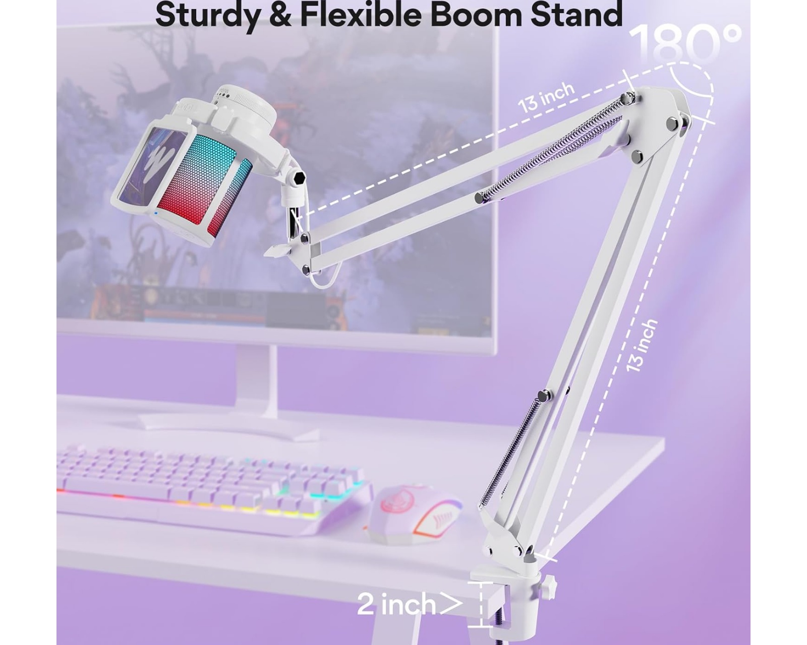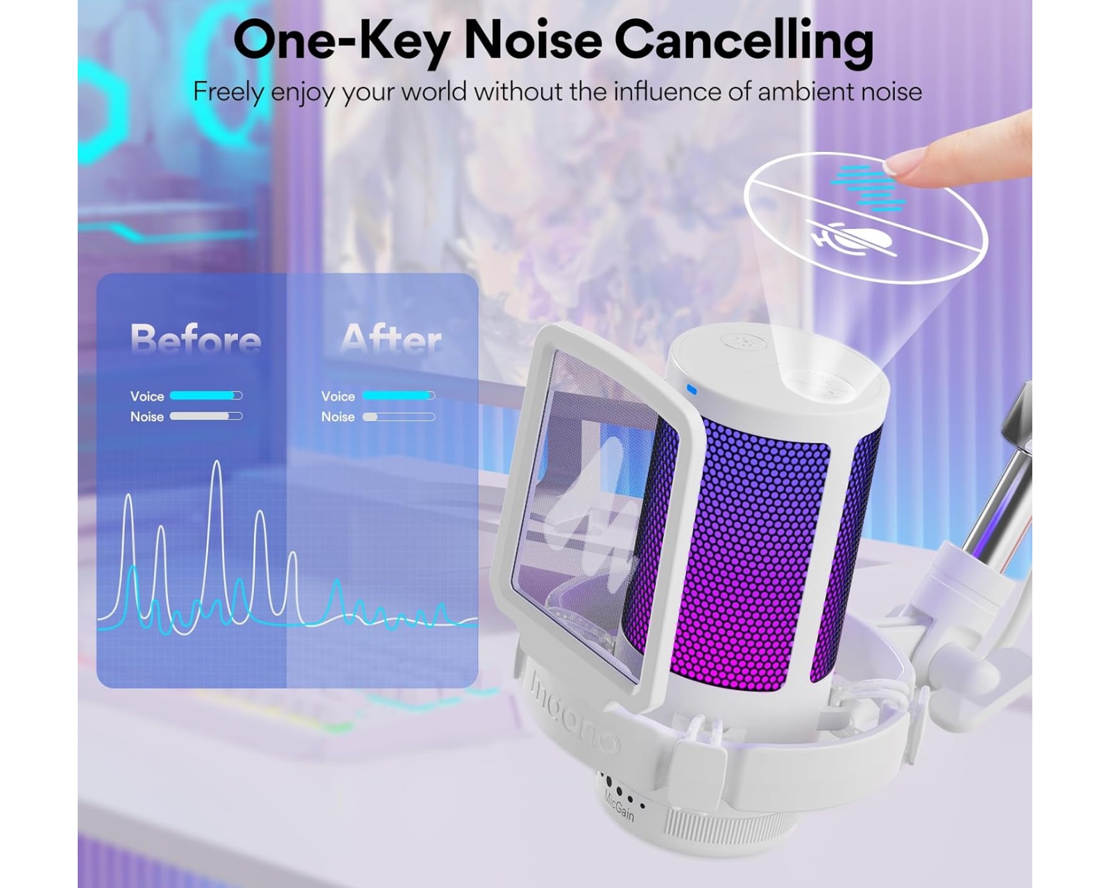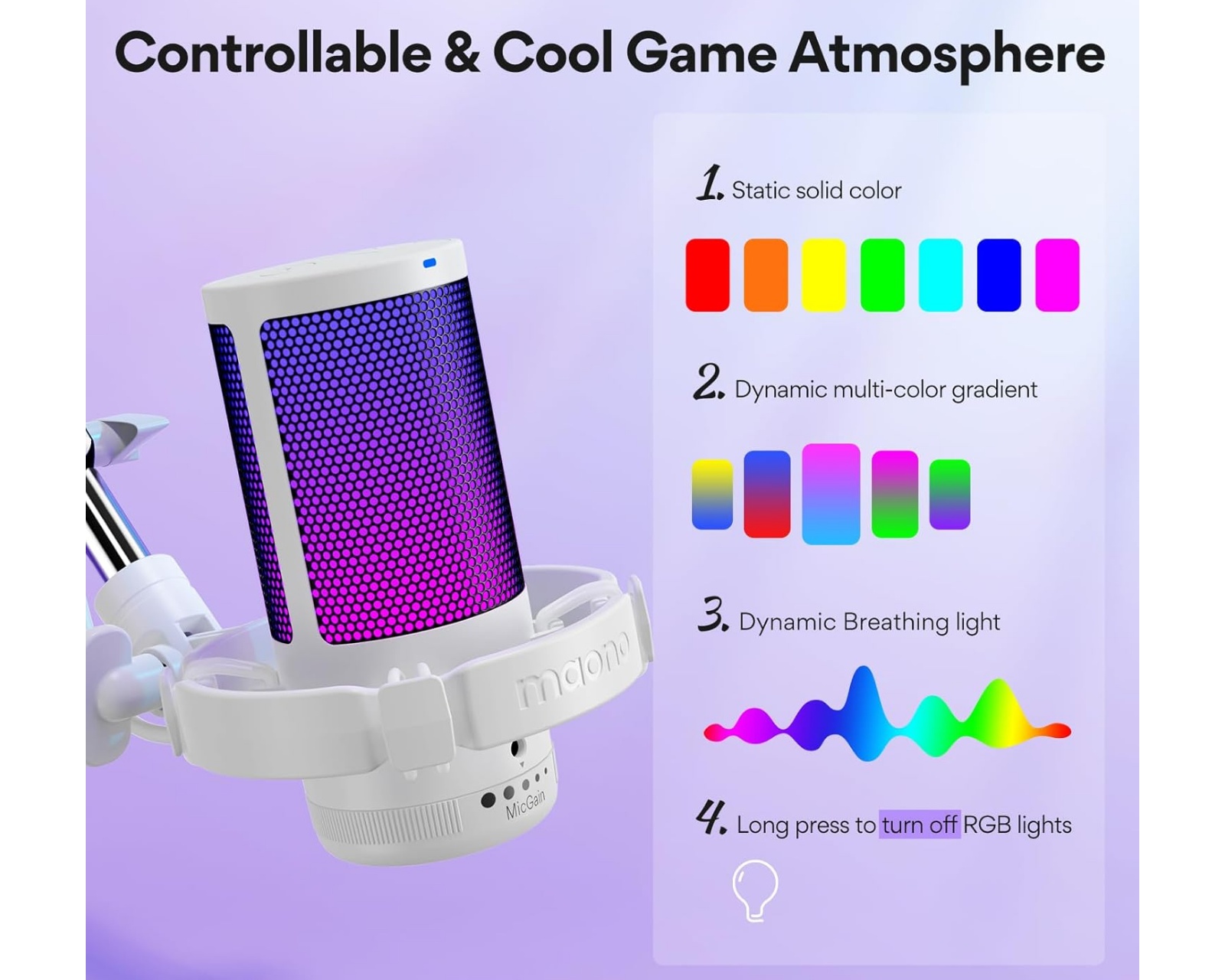 DGM20S er en gamingmikrofon fra Maono som tilbyr støyreduksjon og sanntidsovervåking. Den har en unidireksjonal polaritet som fokuserer på å fange lyden foran mikrofonen, noe som gir bedre lydkvalitet og nøyaktighet ved streaming eller stemmeopptak. Mikrofonen er utstyrt med RGB-belysning som kan tilpasses til ni ulike moduser, slik at gamere kan justere lysfargen for å matche spillmiljøet. Mikrofonen er laget av holdbare materialer og har en stabil konstruksjon.Den leveres med en metallarm som kan justeres på forskjellige måter for å passe din oppsett, samt en støtdempende feste og et popfilter. Den kobles til via USB og USB-C, noe som gjør den kompatibel med Windows, Mac, PS4 og PS5. En dedikert knapp for lydoff og lydkontroll gir enkel bruk under streaming eller opptak. Mikrofonen er plug & play, noe som betyr at den er klar til bruk rett etter tilkobling.