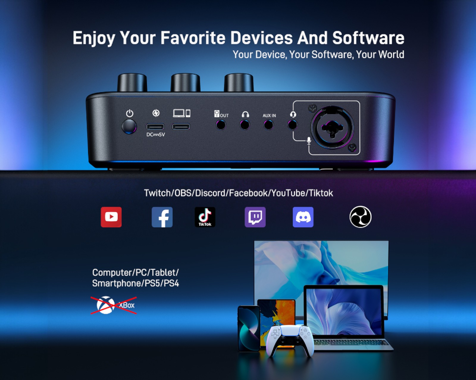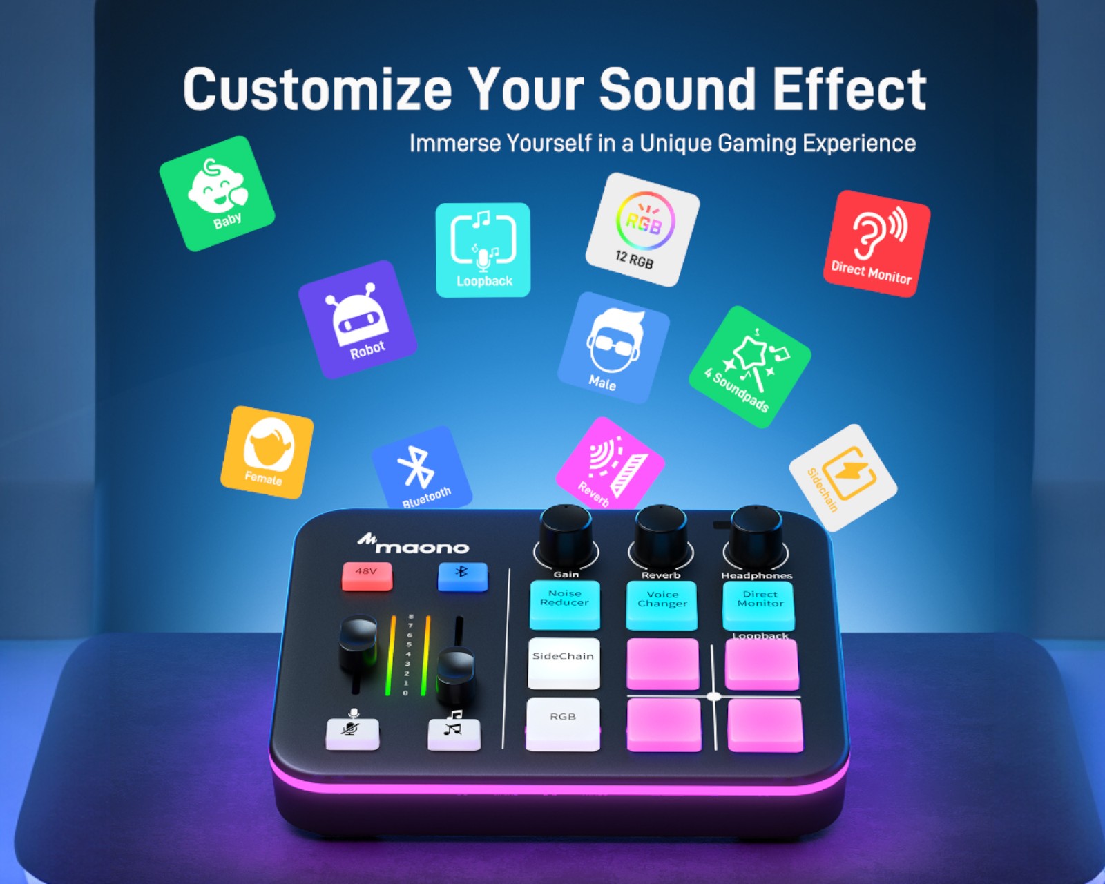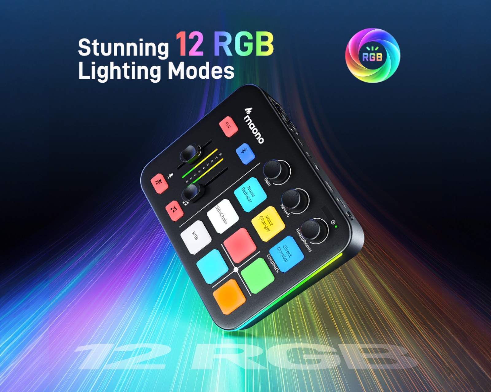 MAONOCASTER G1 NEO er en lydmikser fra MAONO, spesialisert for live-streaming, podcasting og innholdsskaping. Med en pro-preamp og 48 V fantomstrøm er denne mikseren ideell for bruk med XLR-mikrofoner, noe som gir studiokvalitet til lydopptak. Den har fire kanaler og støtter tilkobling via AUX, Bluetooth, USB-C og XLR, noe som gjør den allsidig for forskjellige lydkilder.Den kompakte designen måler 16D x 5,1B x 13,2H centimeter og veier 558 gram, noe som gjør den lett å håndtere og transportere. Det intuitive grensesnittet forenkler bruken, og den innebygde Bluetooth-funksjonen muliggjør smidig tilkobling til ulike lydkilder. RGB-belysningen tilbyr 11 fargevariasjoner og skaper en dynamisk atmosfære for streaming. Lydinnførselen skjer via XLR og utgangene støtter Bluetooth- og USB-C-tilkoblinger for fleksibilitet.