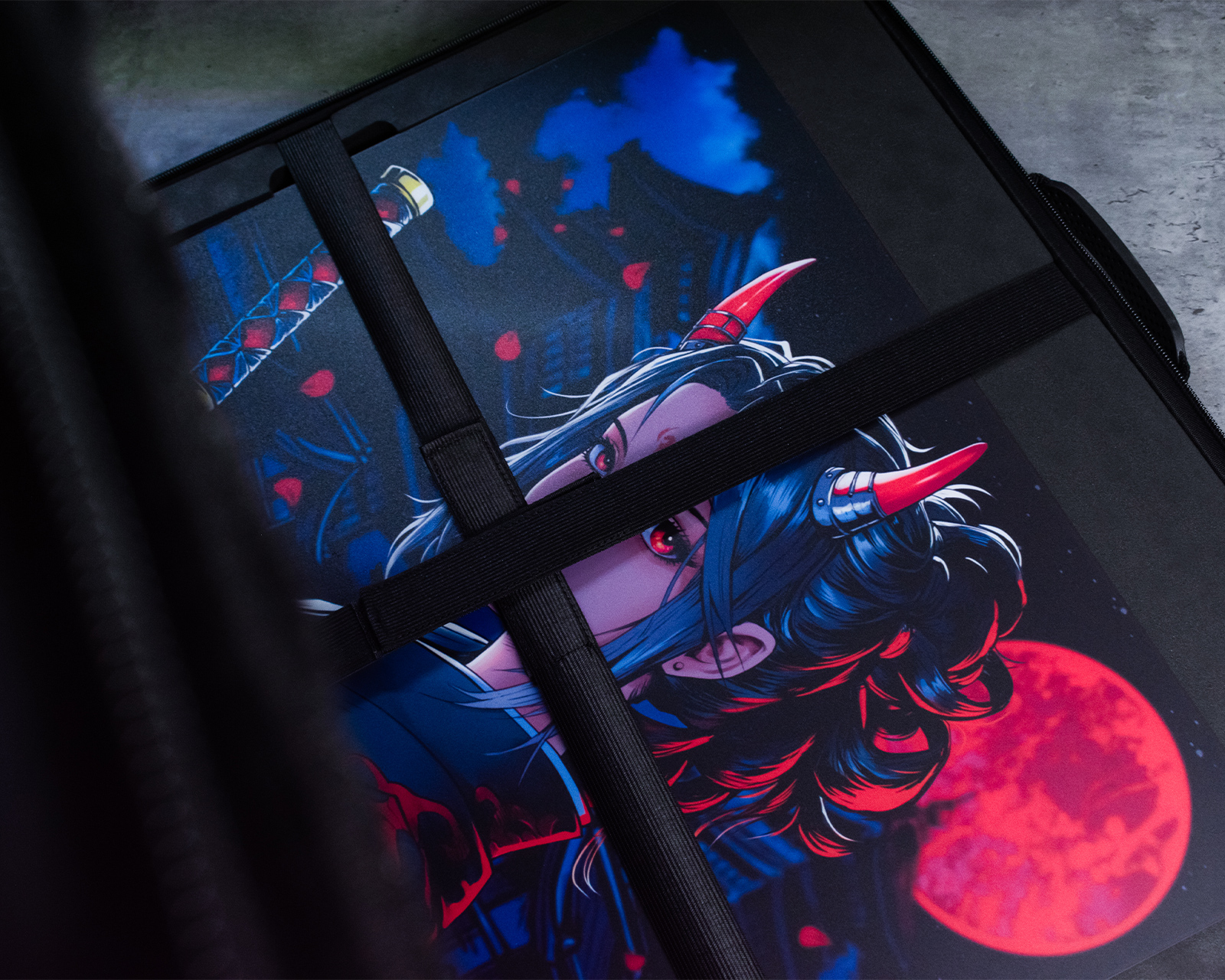 Vault-X inkluderer et bæreetui til musematten, som beskytter den under transport. I tillegg til en Oni's Oath-kortstokk i begrenset opplag.