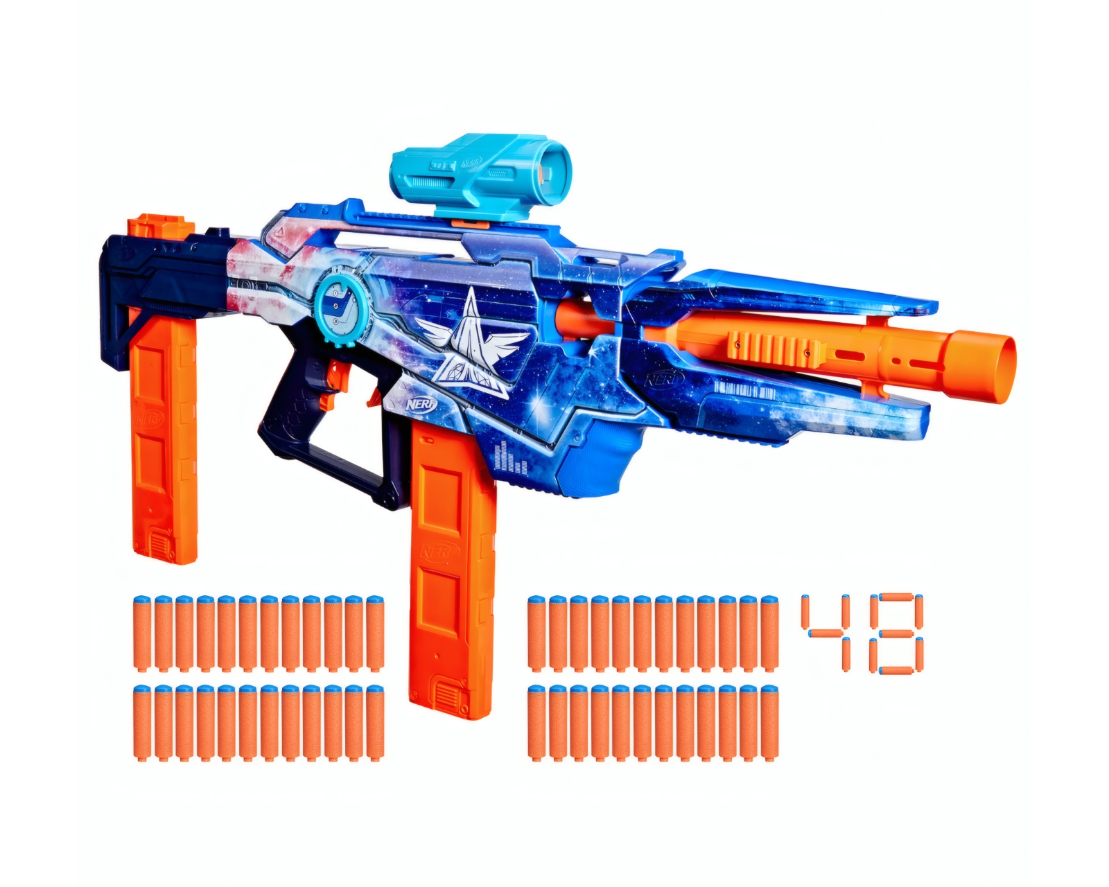 N-Series Blaster Utstyr - Galaktisk Kommandant er en NERF-blaster som tilbyr tilpasningsmuligheter med over 1000 kombinasjoner. Denne blasteren har tre avfyringsmoduser: halvautomatisk, 3-dart burst og helautomatisk. Den inkluderer 48 N1-darts samt et sikte, kolbe og løp. Blasteren er spesielt egnet for spillere som ønsker å etterligne sine favorittvideospill. Blasteren er laget med materialer av høy kvalitet som sikrer holdbarhet og langvarig bruk. De utskiftbare tilbehørene gjør at brukeren kan bytte komponenter for å optimalisere ytelsen.N1-darts er designet for å gi maksimal presisjon og hastighet, noe som forbedrer brukerens spillopplevelse. Siktet er konstruert for å gi godt sikte under forskjellige forhold. Takket være designet er Galactic Commander-blasteren kompatibel med andre N1 dartblastere, noe som øker dens allsidighet og anvendbarhet.