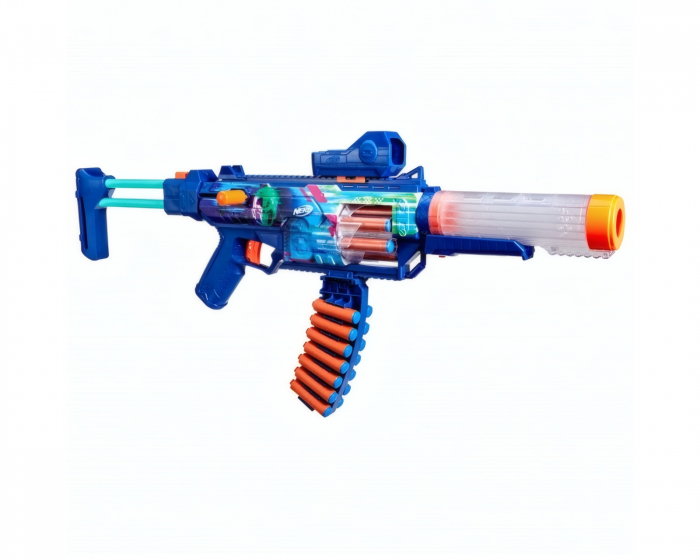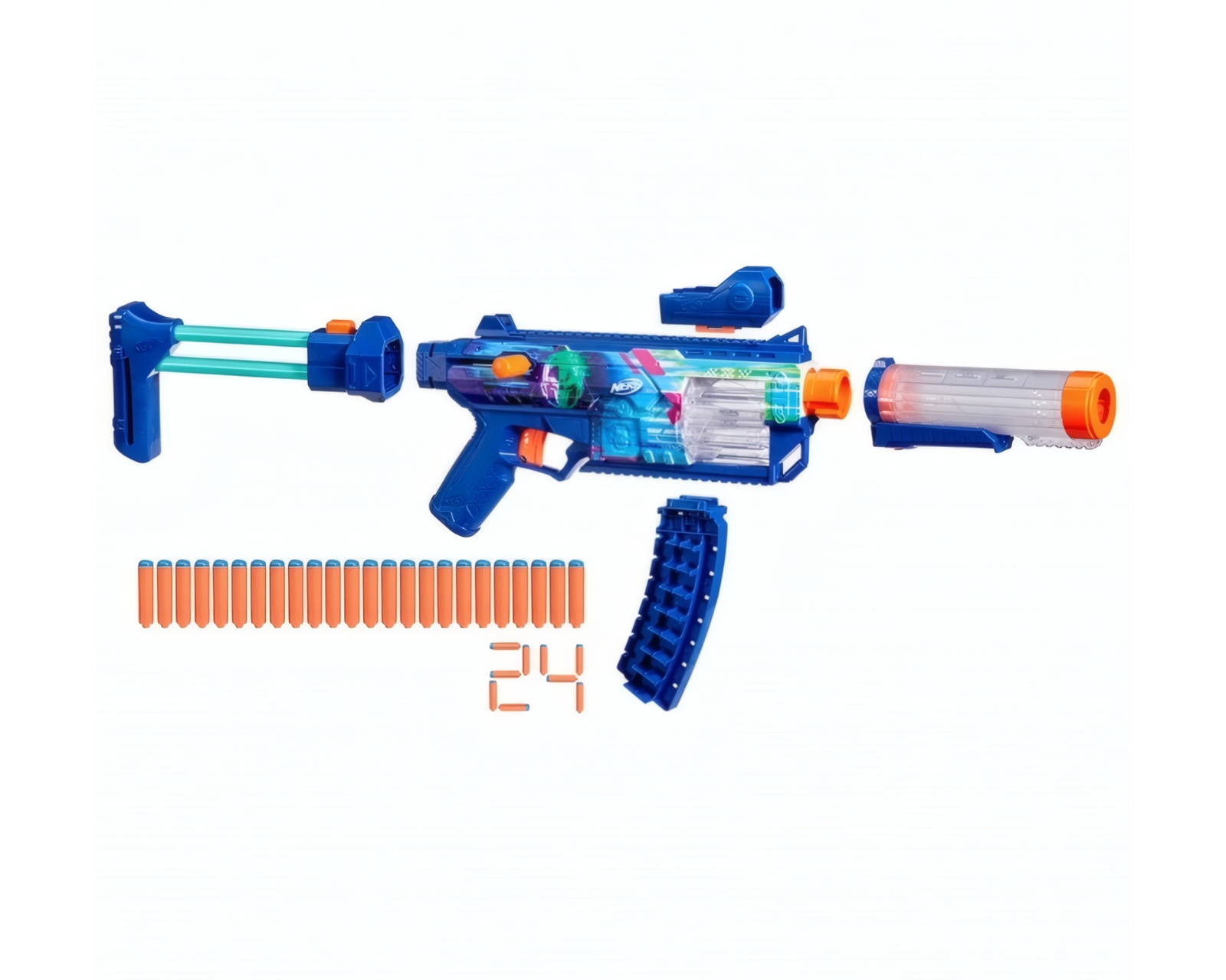 Nerf LoadOut Cyberlight Ghost er en boltmekanisme-blaster fra Nerf som tilbyr tilpasningsmuligheter med over 1000 kombinasjoner av utskiftbare deler. Denne blasteren er designet for gamere som søker en dynamisk og trygg opplevelse i blasterkriger. Det LED-baserte lysystemet lyser opp løpet og sylinderen for å gi en unik visuell effekt under bruk.Cyberlight Ghost-blasteren er konstruert med en roterende sylinder som rommer 6 NERF N1-piler, noe som bidrar til en rask og effektiv avfyring. Den har en kolbe og pipe samt et oppbevaringsrom for piler, noe som letter håndtering og oppbevaring. Sluttstykket er monterbart på begge sider av blasteren, noe som gjør det mulig å bruke både høyre- og venstrehendte gamere. NERF N1-piler er spesifikt designet for å gi høy presisjon, hastighet og rekkevidde, og er kun kompatible med NERF N1-pilblaster.