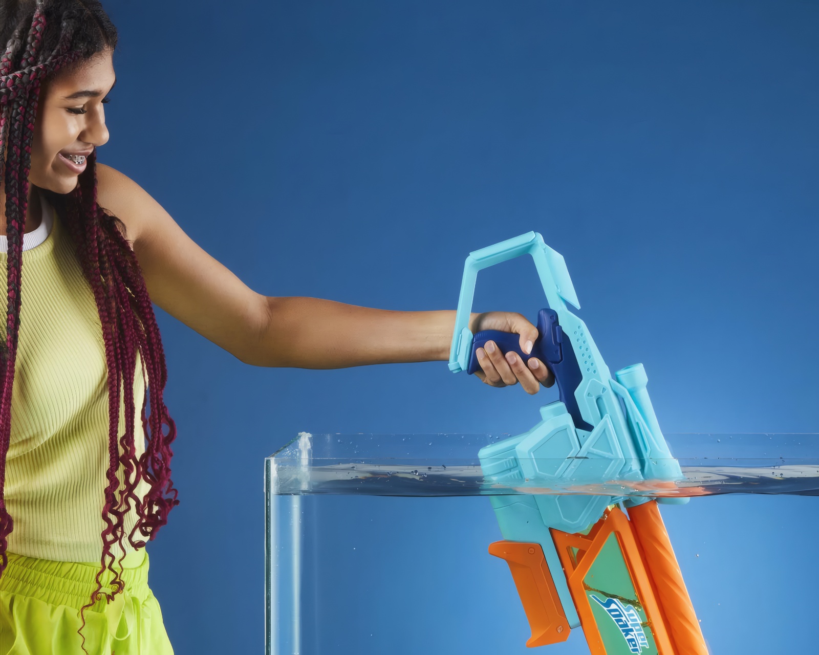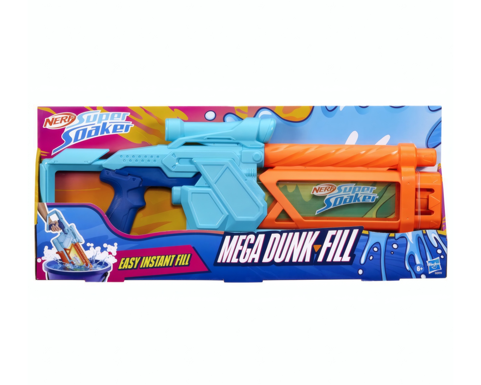 Super Soaker Dunk Fill Mega er en vannblaster fra Nerf som tilbyr rask påfylling og en kapasitet på 1005 ml. Den er designet for å fremme vannlek utendørs. Enheten muliggjør umiddelbar påfylling ved å dyppe tanken i vann, noe som sparer tid under lek. Den er konstruert med en gjennomsiktig tank slik at brukeren kan holde oversikt over væskenivået.For å aktivere blasterfunksjonen brukes en pumpe mekanisme ved at håndtaket trykkes frem og tilbake, noe som gir en kraftig våtlegging. Utstyrt med et sikte, gir den presisjonsmålretning og er tilpasset for å brukes av barn, noe som fremmer aktiv og fysisk lek.