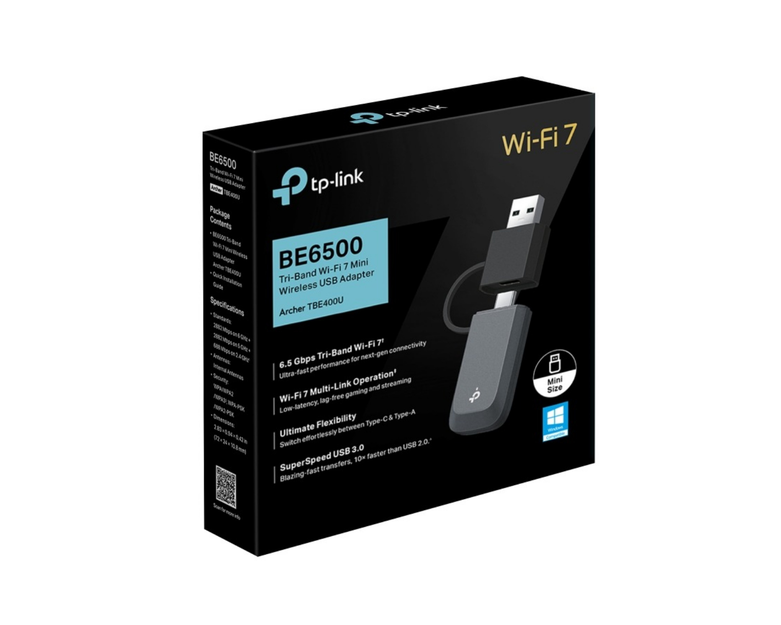 Archer TBE400U BE6500 Tri-Band Wi-Fi 7 Mini er en trådløs USB-adapter fra TP-Link som kombinerer høy ytelse med avansert teknologi. Den er designet for å tilby en smidig og kraftfull trådløs tilkobling med hastigheter opptil 2882 Mbps på både 6 GHz og 5 GHz-båndet, mens 2.4 GHz-båndet leverer 688 Mbps. Adapterens støtte for Wi-Fi 7 sammen med Multi-Link Operation sikrer redusert latency og en stabil opplevelse for gaming og streaming.Archer TBE400U er utformet med både USB-C og USB-A porter, noe som gir brukerne fleksibilitet til å koble til en rekke forskjellige enheter uten å måtte bruke ekstra adaptorer. Med SuperSpeed USB 3.0 får brukere opptil 10 ganger raskere overføringshastigheter sammenlignet med USB 2.0, noe som gjør den perfekt for store filer og raskere tilkoblinger. Den nyeste WPA3-sikkerheten tilbyr ekstra beskyttelse mot uautorisert tilgang og sikrer at dataene dine er beskyttet. Installeringen er enkel og krever ingen CD, noe som gjør at den er plug-and-play-kompatibel med Windows 10 og 11.