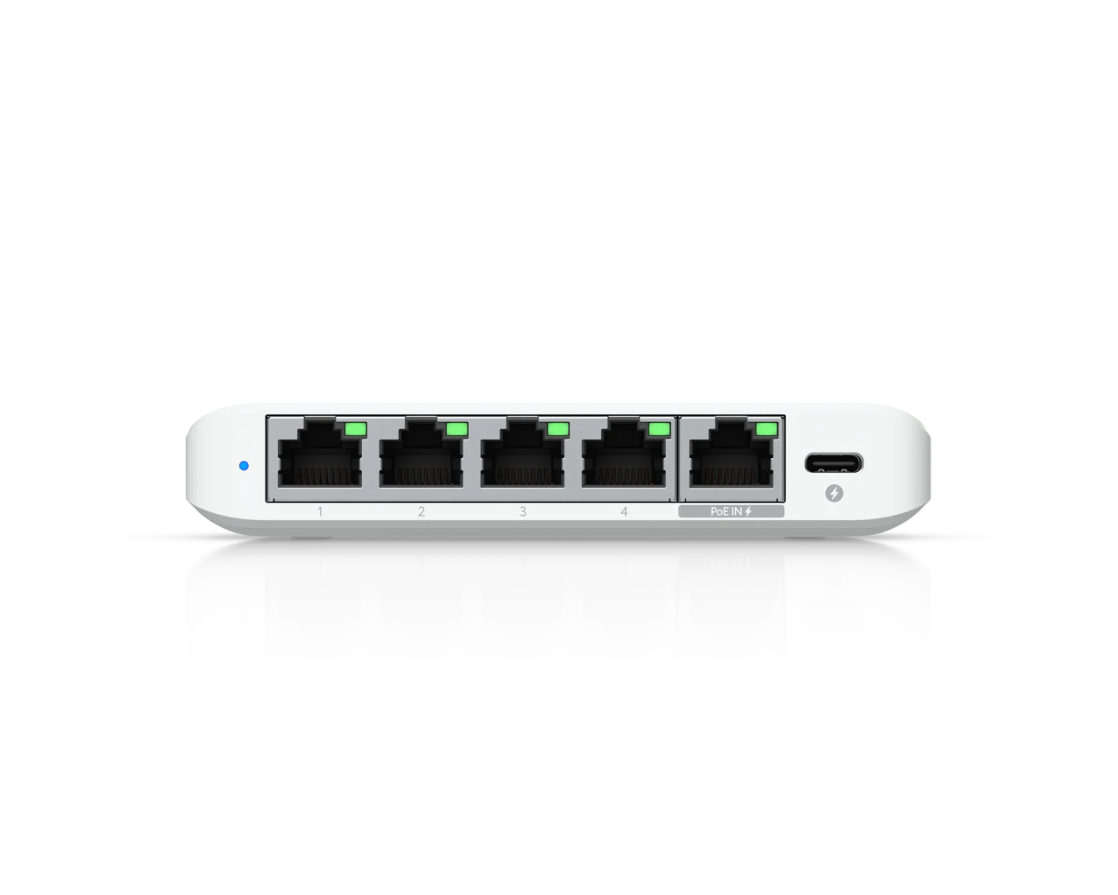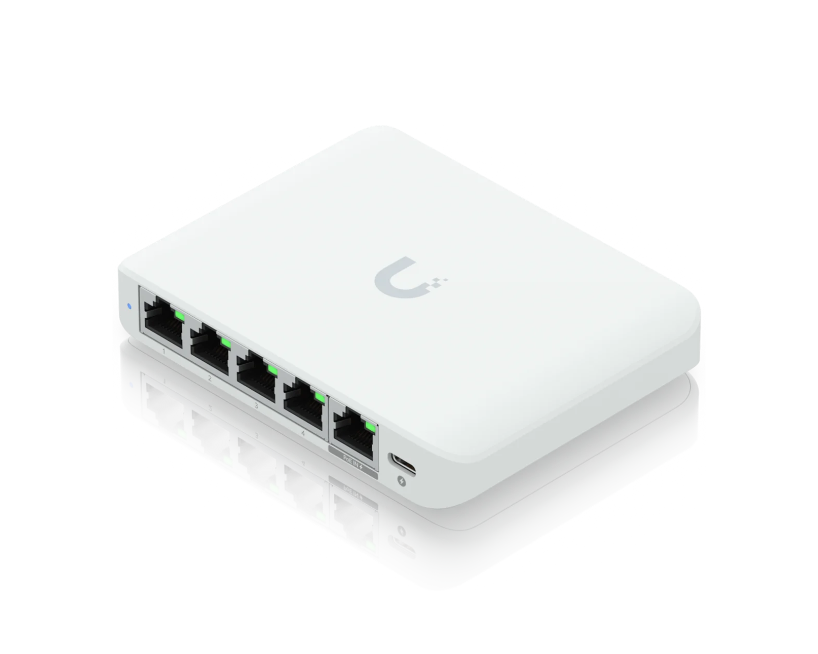 UniFi USW Flex er en 5-porters 2,5G-nettverkssvitsj fra Ubiquiti som tilbyr avansert Ethernet-tilkobling med en kapasitet på opptil 2,5 Gbps. Denne svitsjen inkluderer fire 2,5 Gbps Ethernet-porter og én 2,5 Gbps Ethernet-port med støtte for Power over Ethernet (PoE). Den er ideell for bruk i hjemmemiljøer eller små kontormiljøer der høy hastighet og fleksibilitet er nødvendig.Enheten har et kompakt design som måler 117,1 mm (B) x 90 mm (D) x 21,2 mm (H) og veier 206 g. Strømforsyningen kan forsynes via PoE eller den medfølgende USB-C-adapteren. Med en total båndbredde på 12,5 Gbps og et strømforbruk på 5 W, forbedres funksjonaliteten ytterligere av muligheten til å administrere nettverksinnstillinger. Den interne PoE-innsatsen opererer med en spenning mellom 44-57 V DC for effektiv strømforsyning.