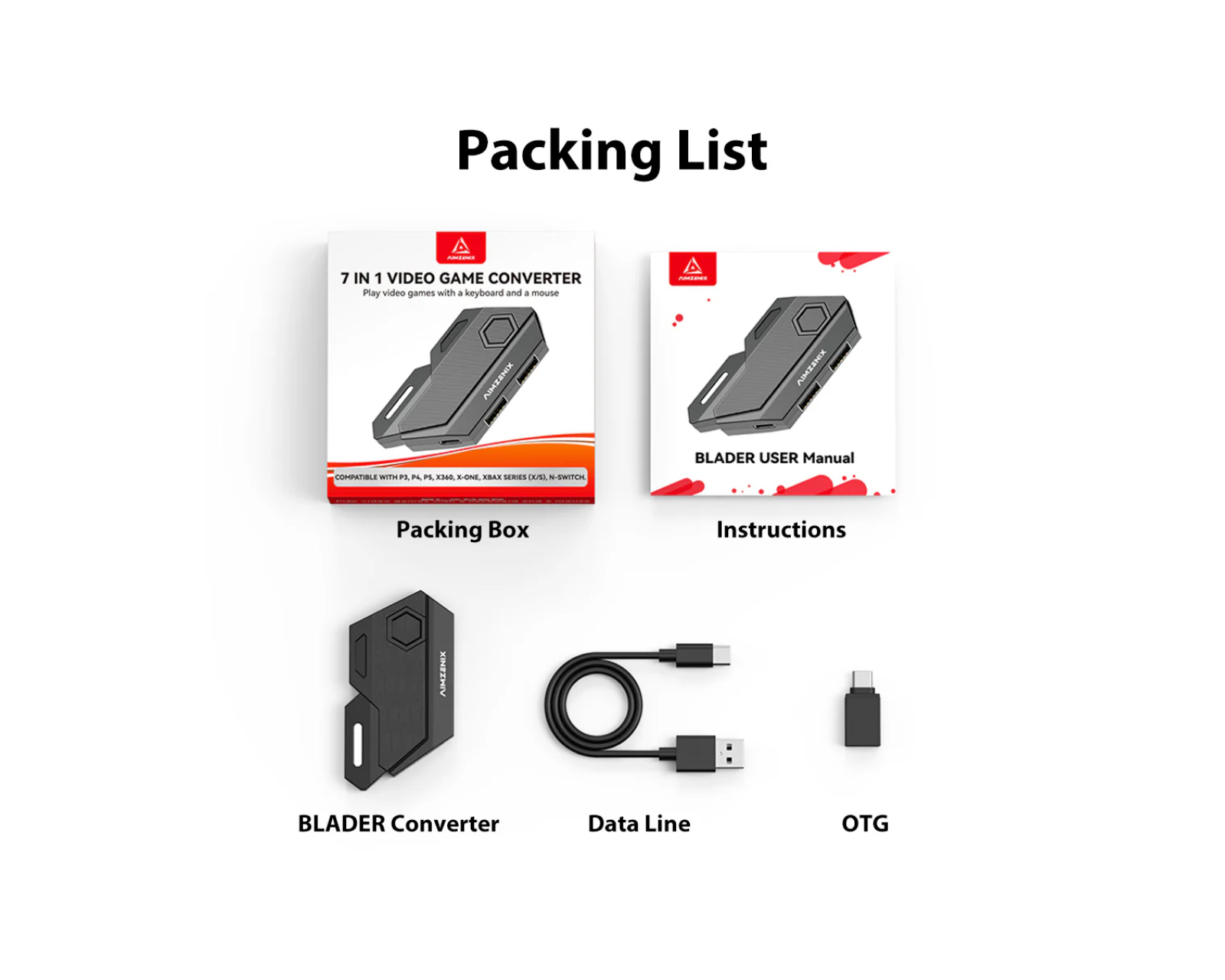 Blader Adapter er en mus- og tastaturadapter fra Aimzenix som gir gamere mulighet til å bruke sine foretrukne enheter på konsoller som Xbox, Nintendo Switch og PlayStation. Adapterens hovedfunksjoner inkluderer simulering av tastatur- og musinputs som kontrollsignaler, noe som øker spillkontrollen. Den tilbyr også tilpassbare hurtigtaster og følsomhetsinnstillinger for å forbedre spillpresisjon og hastighet i ulike spillsituasjoner.Adapterens design gjør den lett å bruke med en plug-and-play-innstilling, noe som innebærer at tilkoblingen til konsollen er rask og enkel uten behov for kompleks installasjon eller ekstra programvare. Adapteren støtter ikke mus som krever driverinstallasjon, og vær oppmerksom på at 3.5 mm hodetelefonuttaket på kontrollen blir inaktivt når den tilkobles via Blader. Inkludert i pakken er Blader-adapteren, en TYP-C datakabel, en OTG-adapter og en bruksanvisning.