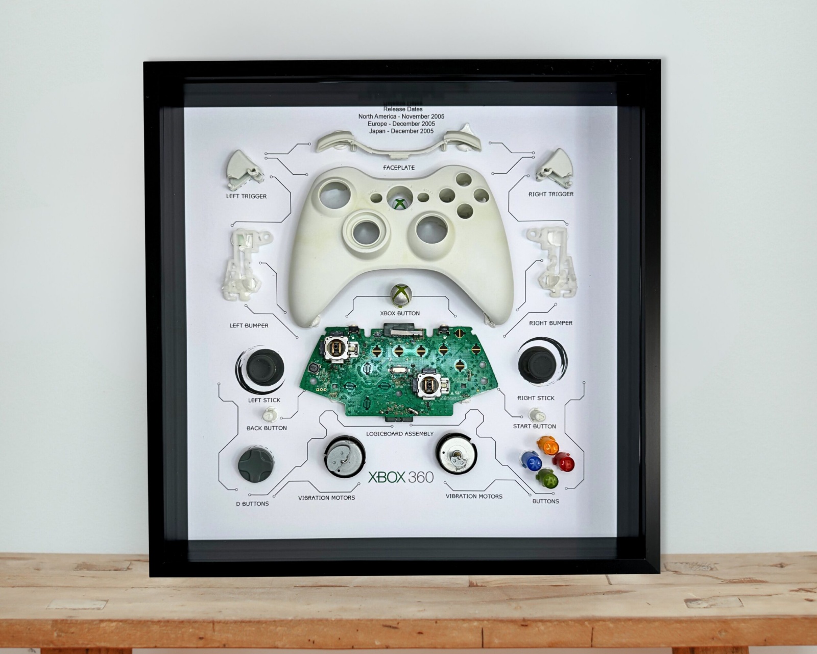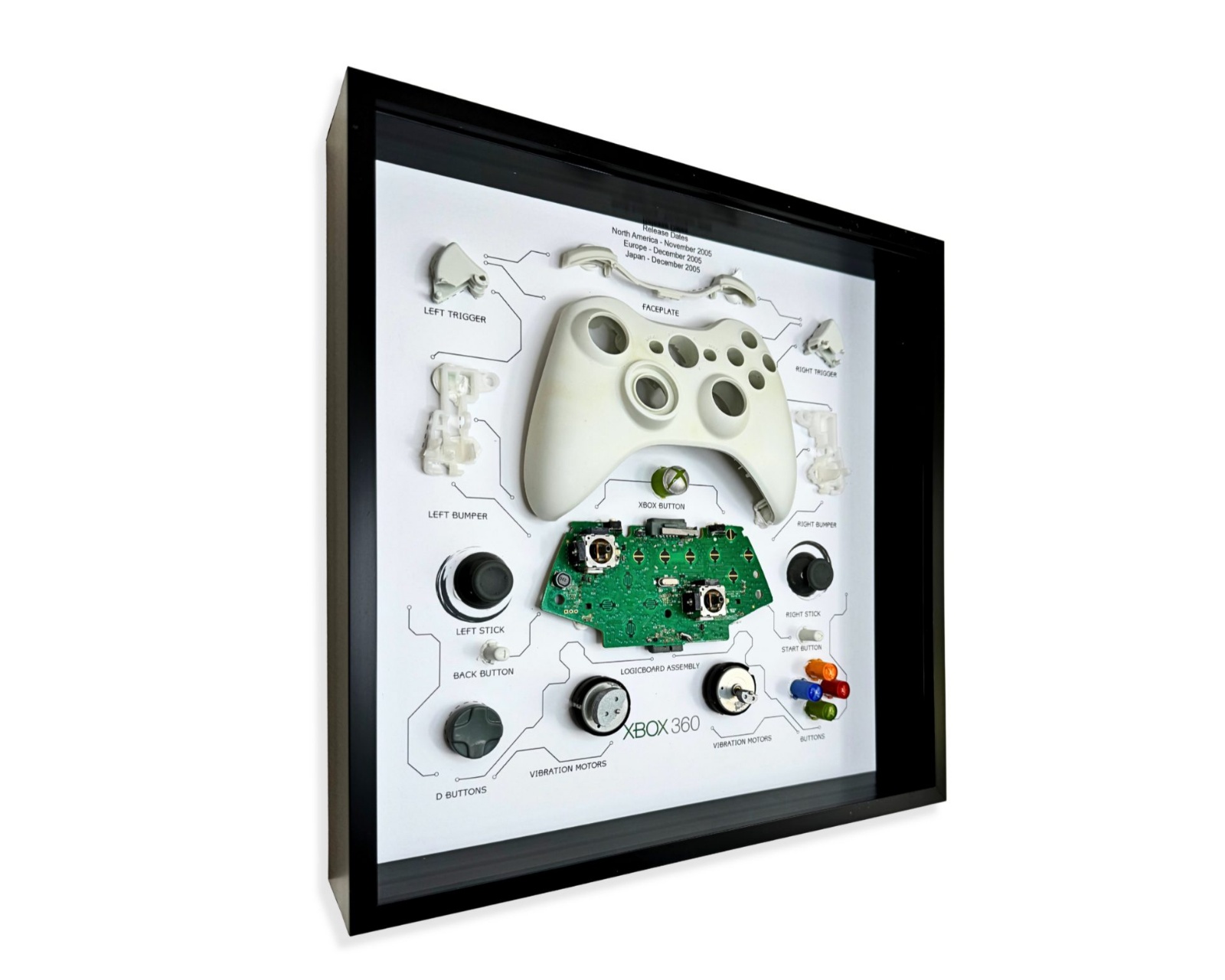 Retro Art Microsoft Xbox 360 Trådløs Kontroller Utstilling er et produkt fra GRC som fungerer som en visuell presentasjon av den trådløse Xbox 360-kontrollen. Den er håndlaget med autentiske originale deler fra Xbox 360, noe som gir et unikt og retroinspirert design.Hver del er nøye plassert i en harmonisk layout og kommer med en informativ etikett som beskriver hver komponents opprinnelse og relasjonsdato. For sitt vern er utstillingen utstyrt med et robust glass og montert i en metallramme.