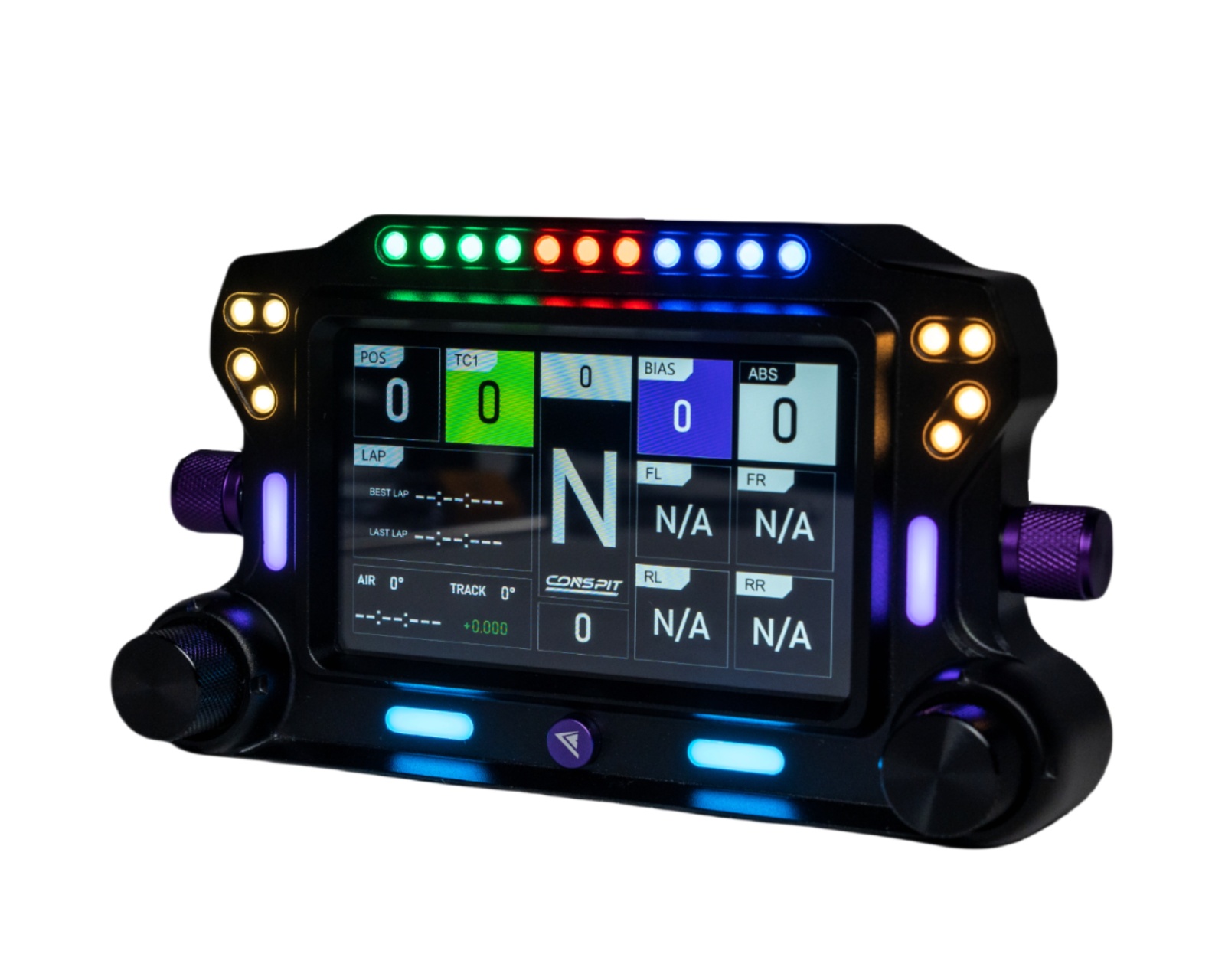 CSD Simhub Dashboard er en 5" IPS berøringsskjerm fra Conspit som er designet for sim-racing. Produktet tilbyr plug-and-play simulering med SimHub for å enkelt vise rundetider, flagg og turtallampe. Den knivskarpe skjermen har en oppløsning på 854x480 og en lysstyrke på 350 lumen, noe som gir optimal lesbarhet under varierende lysforhold. CSD Dashboard henvender seg til gamere som søker en pålitelig og funksjonell skjerm i sin simracing-setup.Skjermens konstruksjon inkluderer et CNC-bearbeidet skall i 6061-T6 aluminium, som gir høy holdbarhet og en profesjonell finish. Forinstallerte SimHub-profiler og eksklusive Dash Pages fra Conspit sikrer at brukeren får tilgang til tilpassede layouter uten å manuelt konfigurere systemet. Med 31 segmenterte RGB LEDs får brukeren også visuell tilbakemelding på avgjørende data som turtallsområder og flaggvarsler. Fire taktile kodingsknapper og berøringsskjermfunksjonalitet forbedrer brukeropplevelsen og gjør det mulig å justere innstillinger uten å ta fokus fra kjøringen. Enheten er designet for å lett kunne integreres i ulike simcockpiter og har doble dataporter for enkel installasjon.