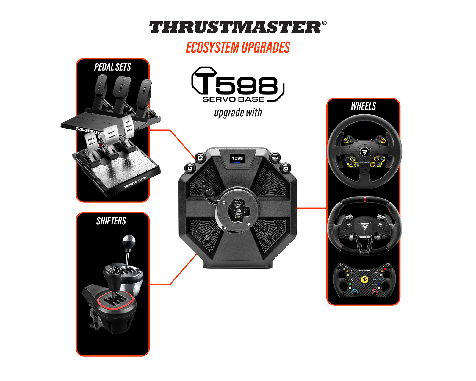 T598P Servo Base er en direkte drevet base fra Thrustmaster designet for PC samt konsollene PS4 og PS5. Den tilbyr nøyaktig rattbevegelse uten hakk gjennom sin ekte Axial Flux-motor, som muliggjør høy kvalitet på Force Feedback. Med en konstant dreiemomentkapasitet på 5 Nm som kan dobles i spennende situasjoner, er denne enheten spesifikt designet for entusiaster innen simracing.Enheten er konstruert med nøye utvalgte materialer for å sikre holdbarhet og ytelse. T598Ps teknologi, inkludert HARMONY, genererer høyfrekvent dreiemoment for å gjengi subtile detaljer fra spillet, som rumblestriper og dekksladd. Den har en ultra-lav latens på 5 ms for umiddelbar respons. Innstillinger kan justeres og profiler lagres direkte gjennom Race Dash-skjermen, som viser over 10 racinginformasjoner under spill.