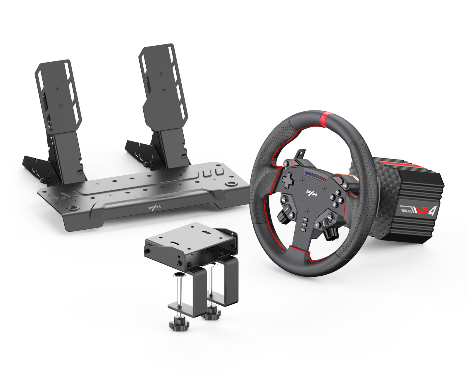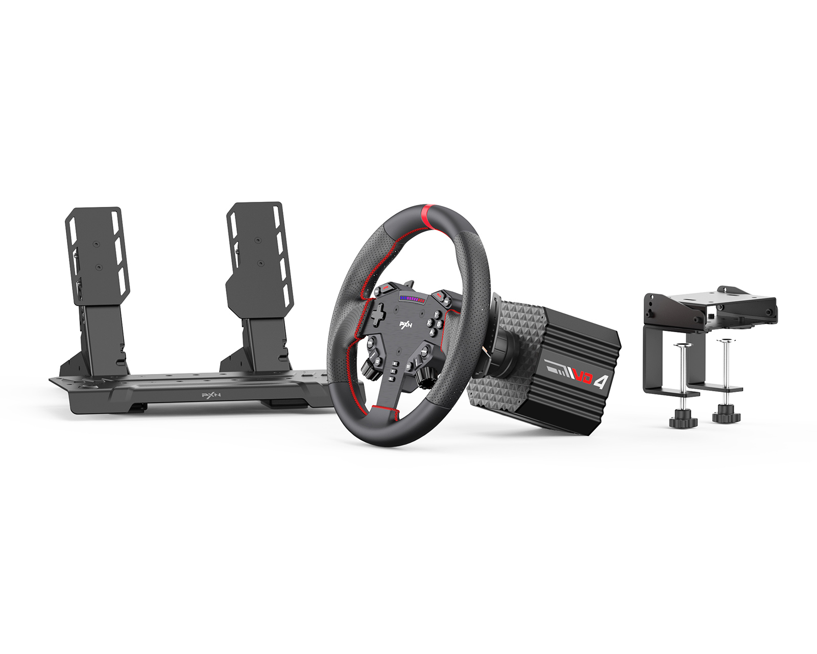 W AS racinghjul har en ramme av aluminiumlegering dekket med mikrofiberlær, som gir godt grep og komfort. Dette rattanlegget inneholder 19 programmerbare knapper, 2 vridbare håndtak og 4 paddle shifters for høy funksjonalitet. PD HM pedalene er helt i metall og bruker Hall-effekt sensorer for høy presisjon. Pedalenes høyde og vinkel er justerbare, noe som gir en tilpasset kjøreopplevelse. Modulen tillater enkel demontering og PXN-programvaren tilbyr kalibrering for pedalrespons.