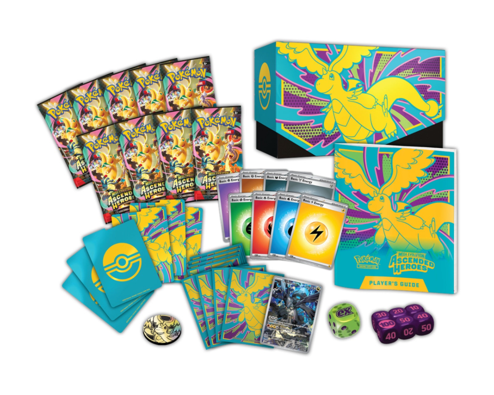 Esken er konstruert av slitesterke materialer med et design som letter organisasjonen. Inni finnes 65 kortlommer for å beskytte kortene samt 40 energikort for spill. For å forbedre spillopplevelsen følger det også med en spillguide til utvidelsen, 6 skadesiffrer og en turneringslovlig terning for myntkast, noe som gjør den passende for både casual og turneringsspillere. I tillegg inngår en plastmynt og en samleske med 6 avdelere for å holde alt organisert. Produktet inneholder også en kode for Pokémon Trading Card Game Live.
