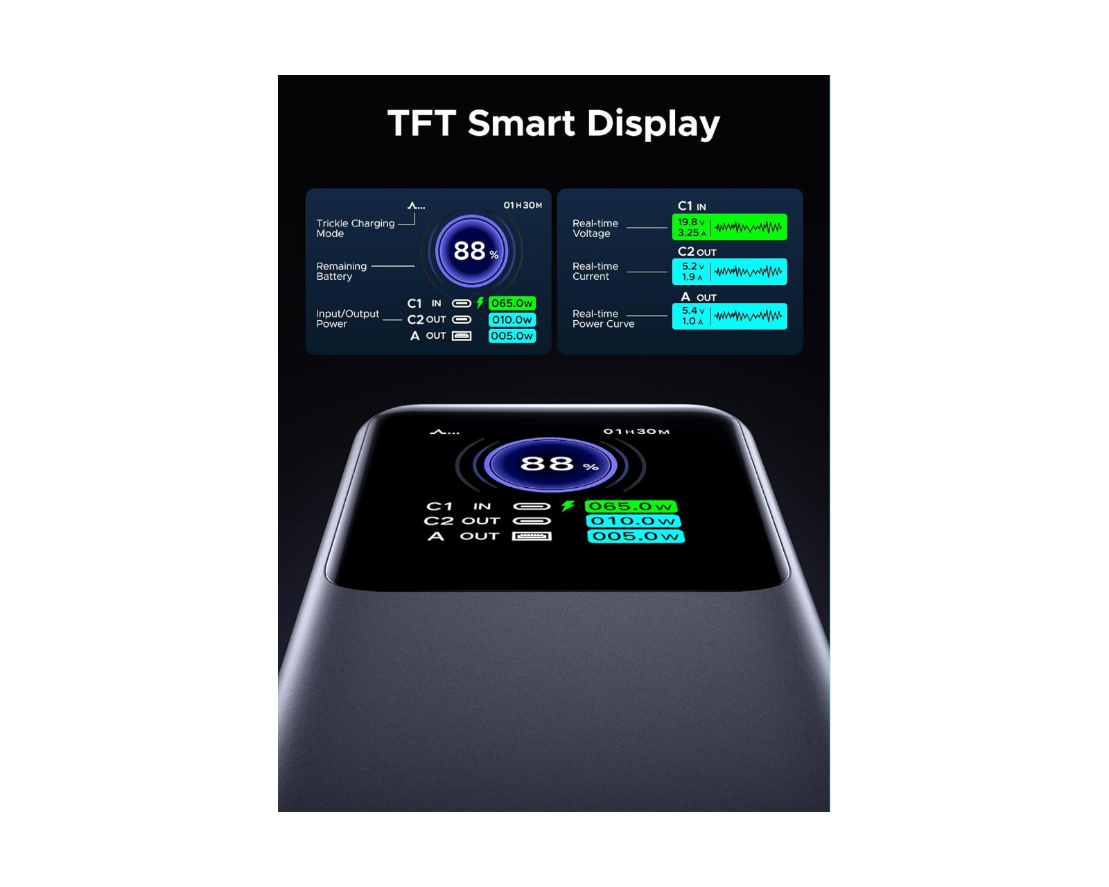 Powerbank med hurtiglading som har en imponerende kapasitet på 130W og 20000 mAh, noe som gjør den perfekt for å holde enhetene dine ladet hele dagen. Den har to USB-C-porter og én USB-A-port, slik at du kan lade flere enheter samtidig. I tillegg er den utstyrt med en TFT-skjerm som viser gjeldende batterinivå og ladestatus, og gir deg en klar oversikt over hvor mye energi som er igjen.Den lette designen til powerbanken gjør den ideell for både reise og daglig bruk. Med sin kompakte størrelse finner du enkelt plass til å ta den med deg uansett hvor du går, noe som gjør den til den perfekte følgesvennen for både forretningsreiser og fritidseventyr. Enten du er på vei til jobb, på helgetur eller bare trenger å lade enheten din i løpet av dagen, tilbyr denne strømbanken en praktisk og praktisk løsning for å holde enhetene dine ladet og klare til bruk.