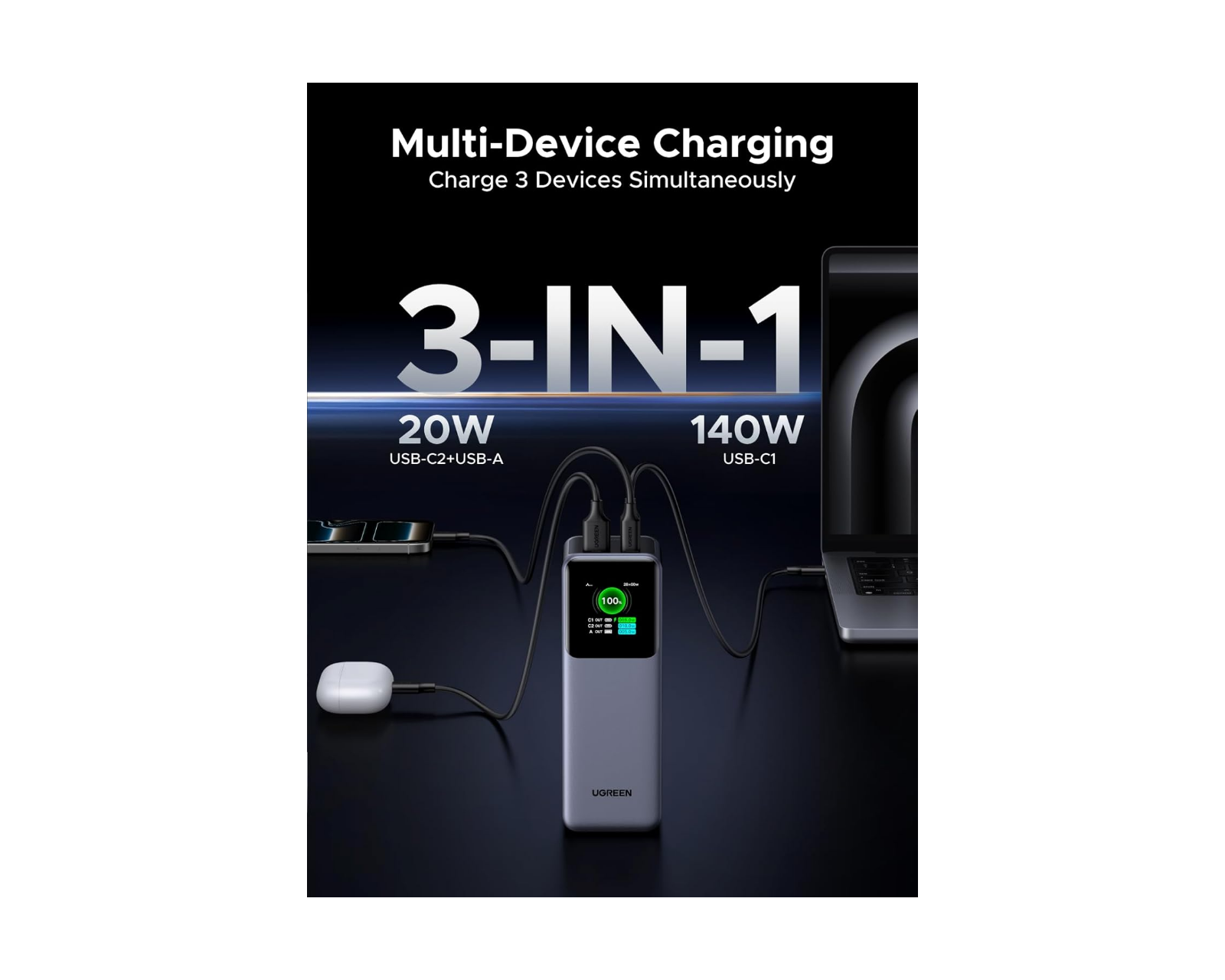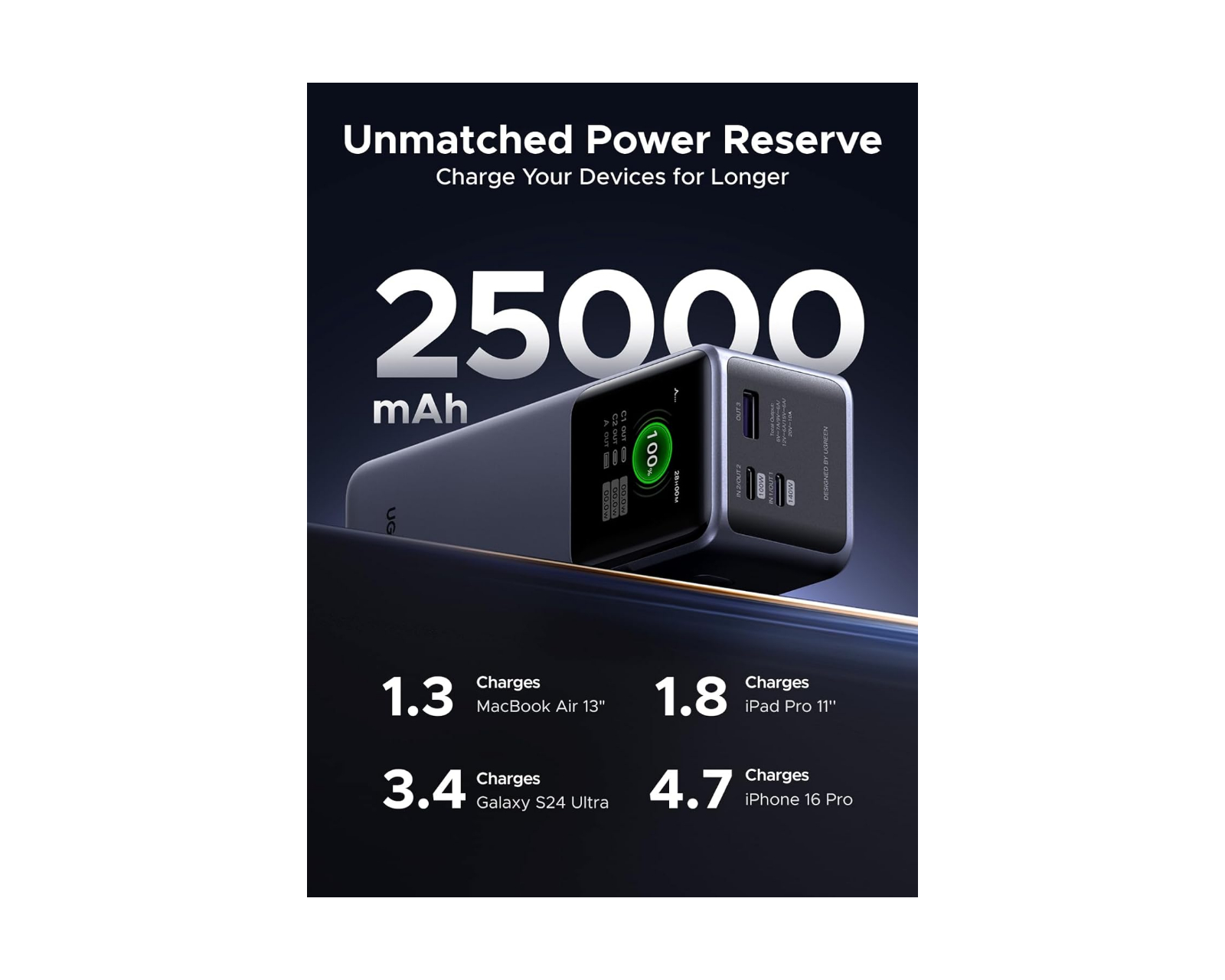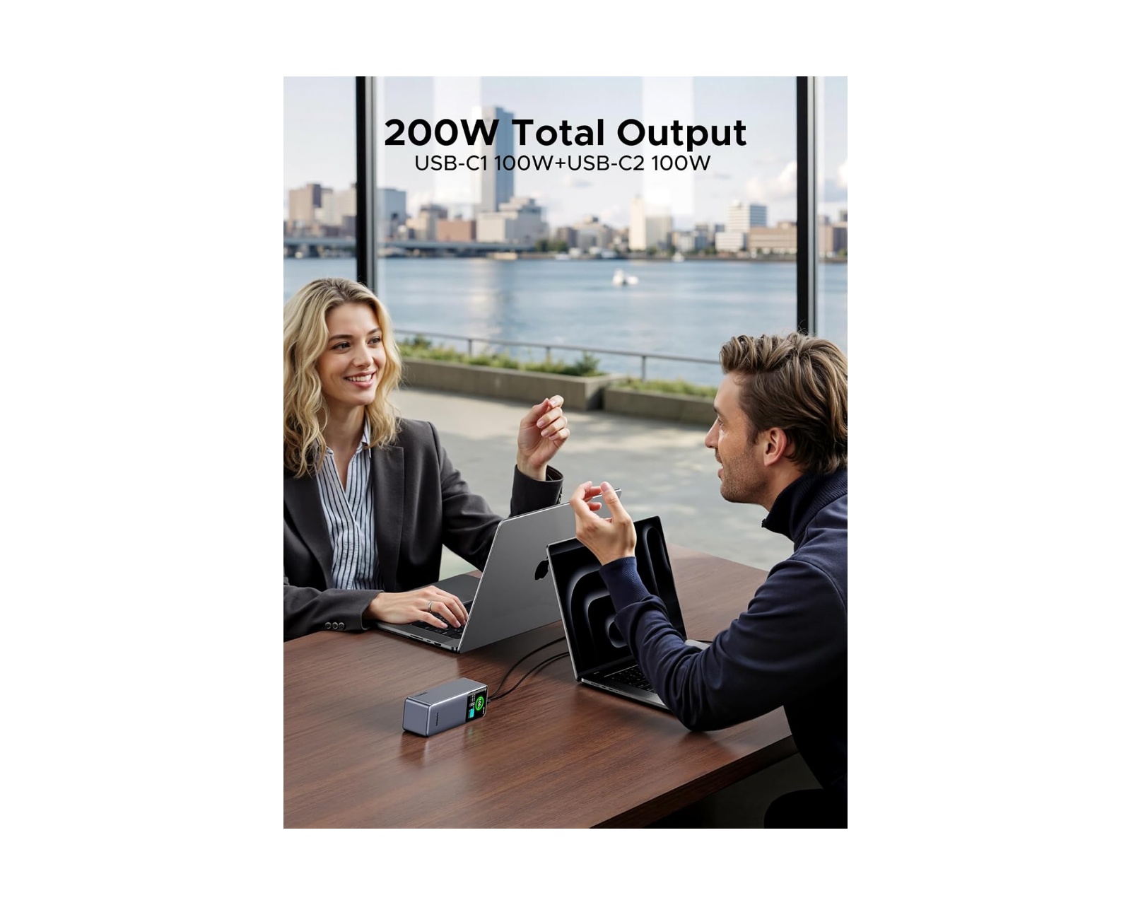 Powerbank med hurtiglading som har en imponerende kapasitet på 200W og 25000 mAh, noe som gjør den perfekt for å holde enhetene dine ladet hele dagen. Den har to USB-C-porter og én USB-A-port, slik at du kan lade flere enheter samtidig. I tillegg er den utstyrt med en TFT-skjerm som viser gjeldende batterinivå og ladestatus, og gir deg en klar oversikt over hvor mye energi som er igjen.Den lette designen til powerbanken gjør den ideell for både reise og daglig bruk. Med sin kompakte størrelse finner du enkelt plass til å ta den med deg uansett hvor du går, noe som gjør den til den perfekte følgesvennen for både forretningsreiser og fritidseventyr. Enten du er på vei til jobb, på helgetur eller bare trenger å lade enheten din i løpet av dagen, tilbyr denne strømbanken en praktisk og praktisk løsning for å holde enhetene dine ladet og klare til bruk.