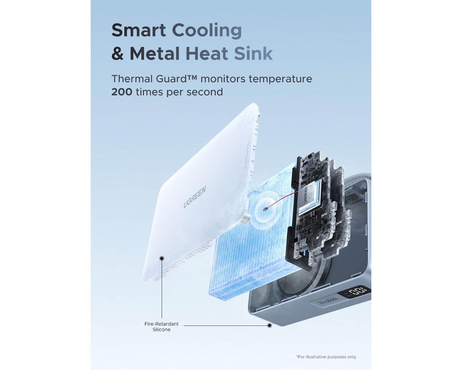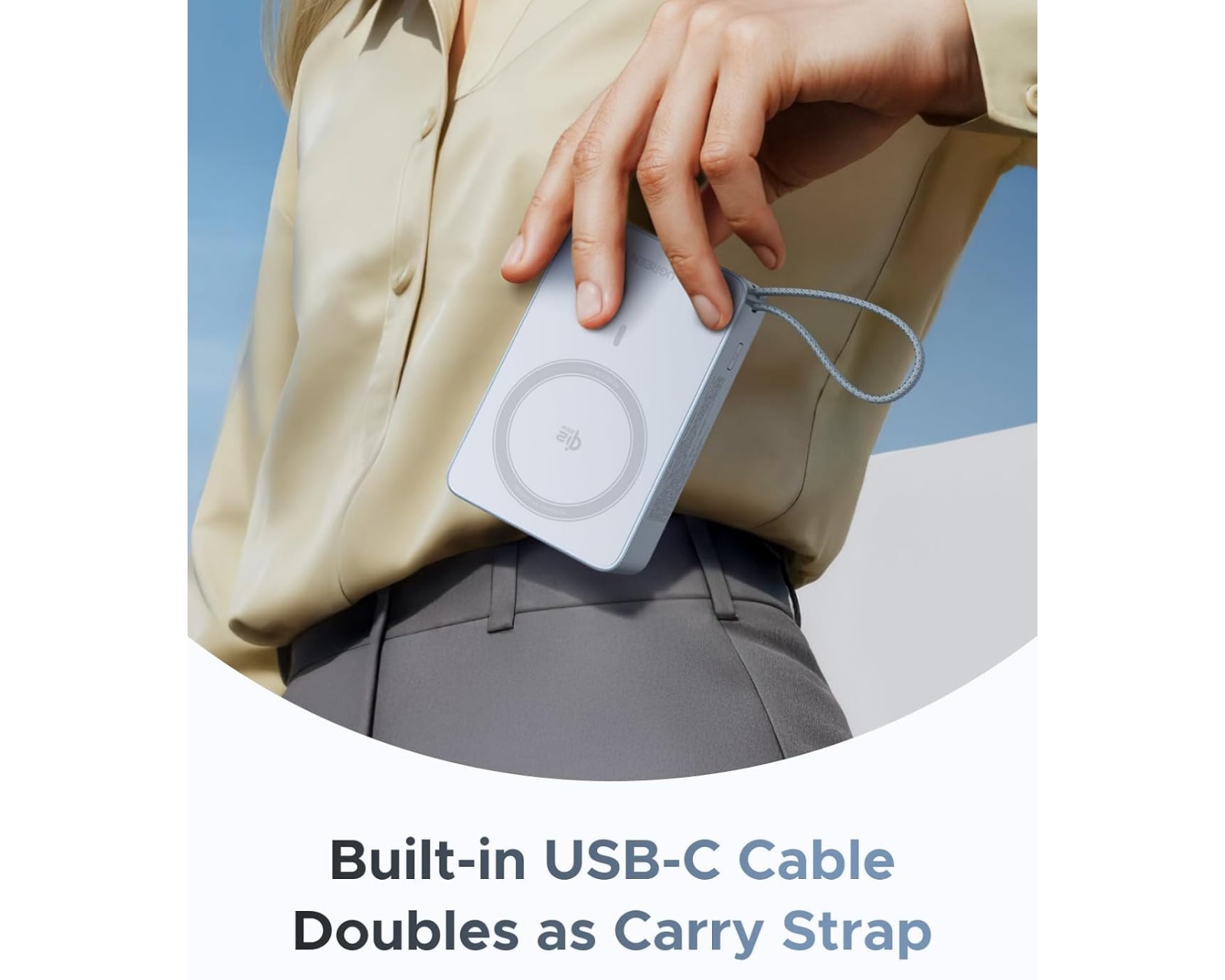 MagFlow Qi2.2 25W er en multifunksjonell powerbank fra UGREEN med en kapasitet på 20000mAh. Den tilbyr trådløs lading med en maksimal effekt på 25W, noe som gjør den kompatibel med MagSafe og Qi2-standarden. En innebygd USB-C-kabel muliggjør både lading og strømforsyning, med en maksimal utgang på 100W. Powerbanken er utstyrt med N52-magneter som gir en sterk og presis magnetisk festing, noe som sikrer at enheten sitter godt under lading.Den har flere ladeløsninger, inkludert både trådløs og kablet lading, og er designet for å være allsidig, noe som gjør den passende for både smarttelefonbrukere og databrukere. Med støtte for hurtiglading via USB-C-portene, kan den lade enheter som MacBook, iPad og iPhone effektivt. Sikkerhetsfunksjoner som beskyttelse mot overstrøm, overspenning og kortslutning gjør den til et trygt valg for reise.