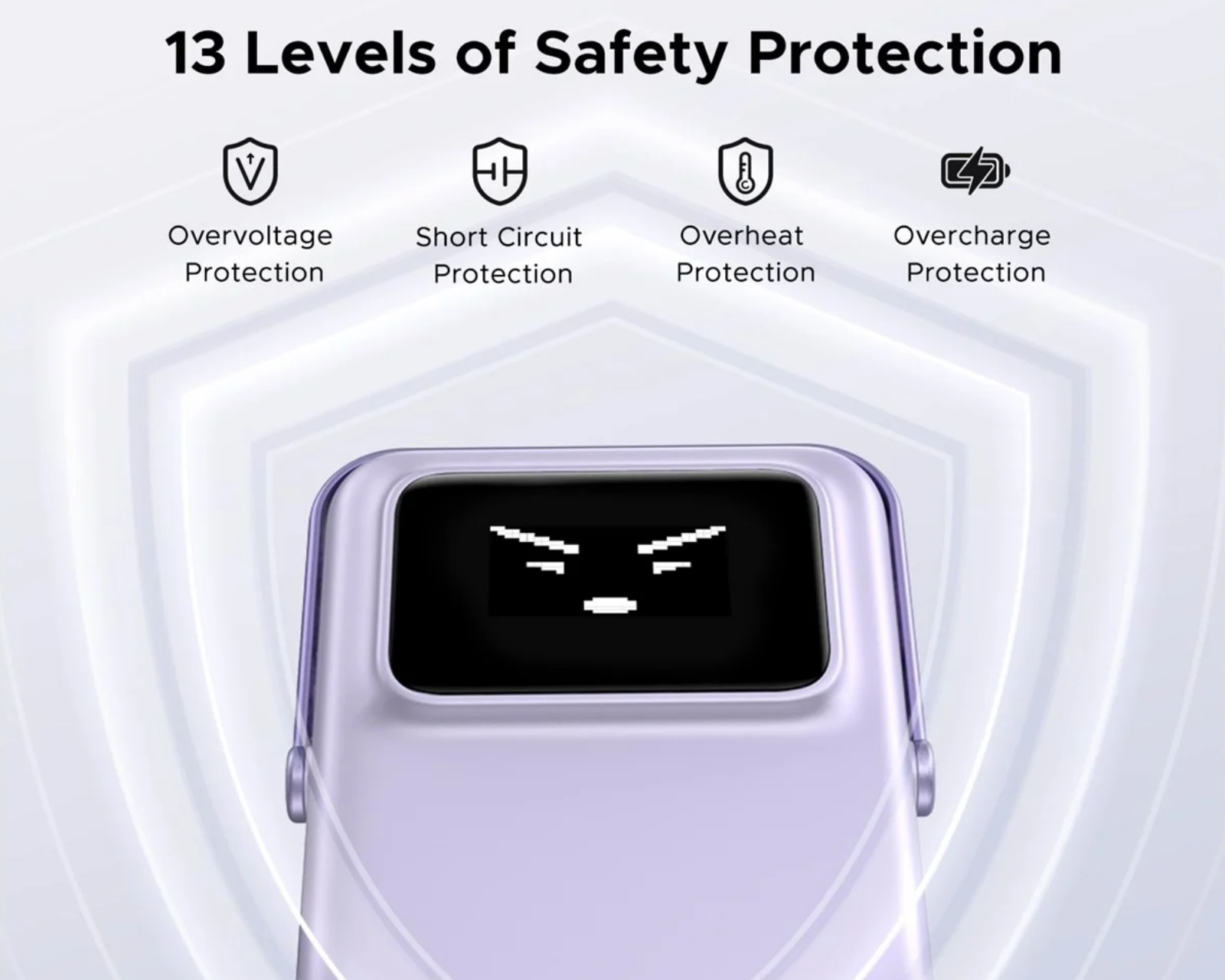 I tillegg er kraftbanken designet med tanke på sikkerhet. Den har overopphetingsbeskyttelse og sikker lading for å sikre at både strømbanken og enhetene dine er trygge under bruk. Perfekt for reiser, jobb eller hverdagssituasjoner der du trenger pålitelig og praktisk lading.