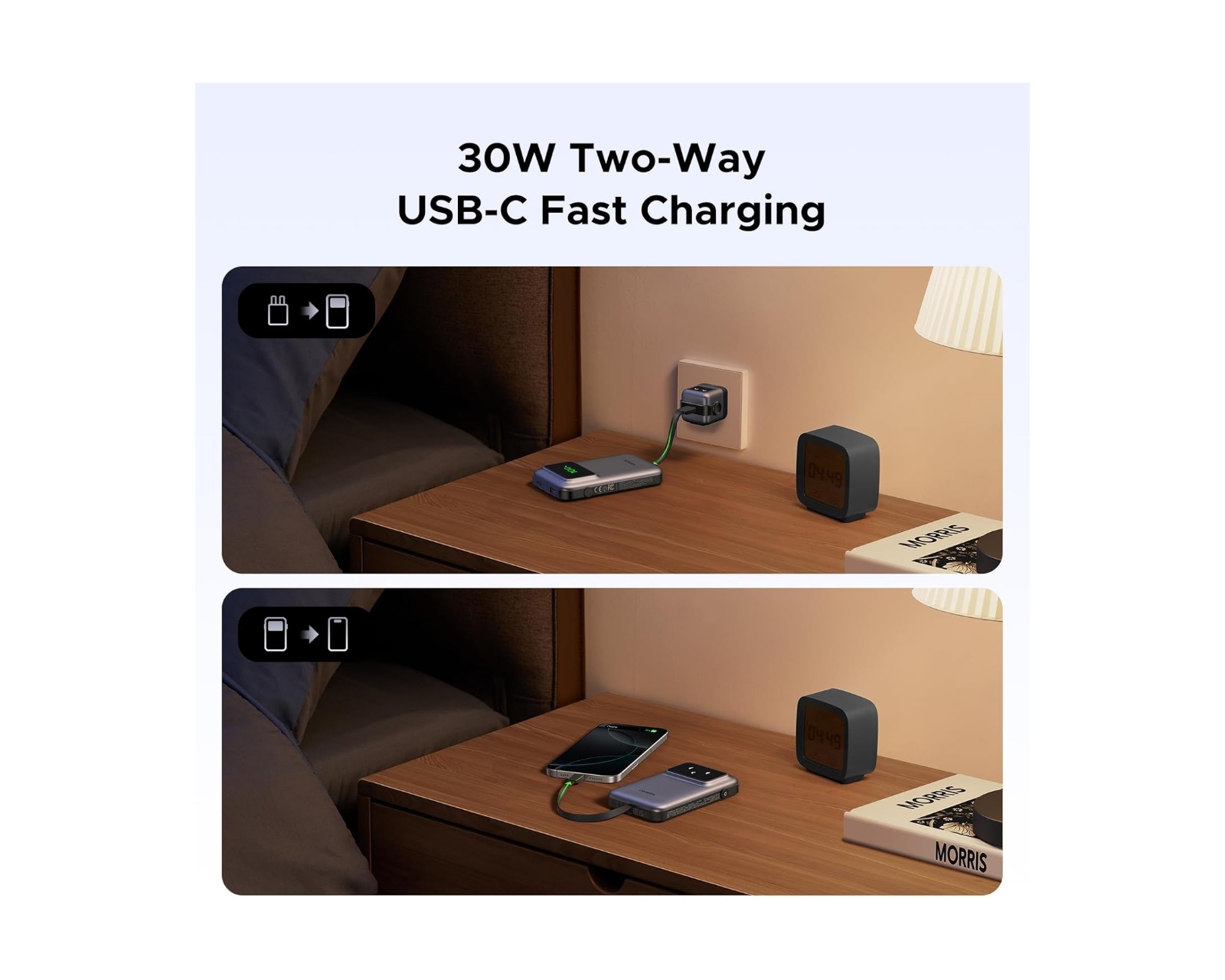 USB-C-inngang/utgang støtter 5V/3A, 9V/3A, 12V/2,5A og 15V/2A opp til 30W, mens USB-A-utgang tilbyr 5V/3A, 9V/2A og 12V/1,5A opp til 22,5W. Den innebygde USB-C-kabelen har samme kraftige kapasitet som porten, med støtte for opptil 30W. Total utgang er 5V/3A med en maksimal effekt på 15W, noe som gjør den perfekt for å lade smarttelefoner, nettbrett og andre USB-enheter raskt og effektivt.