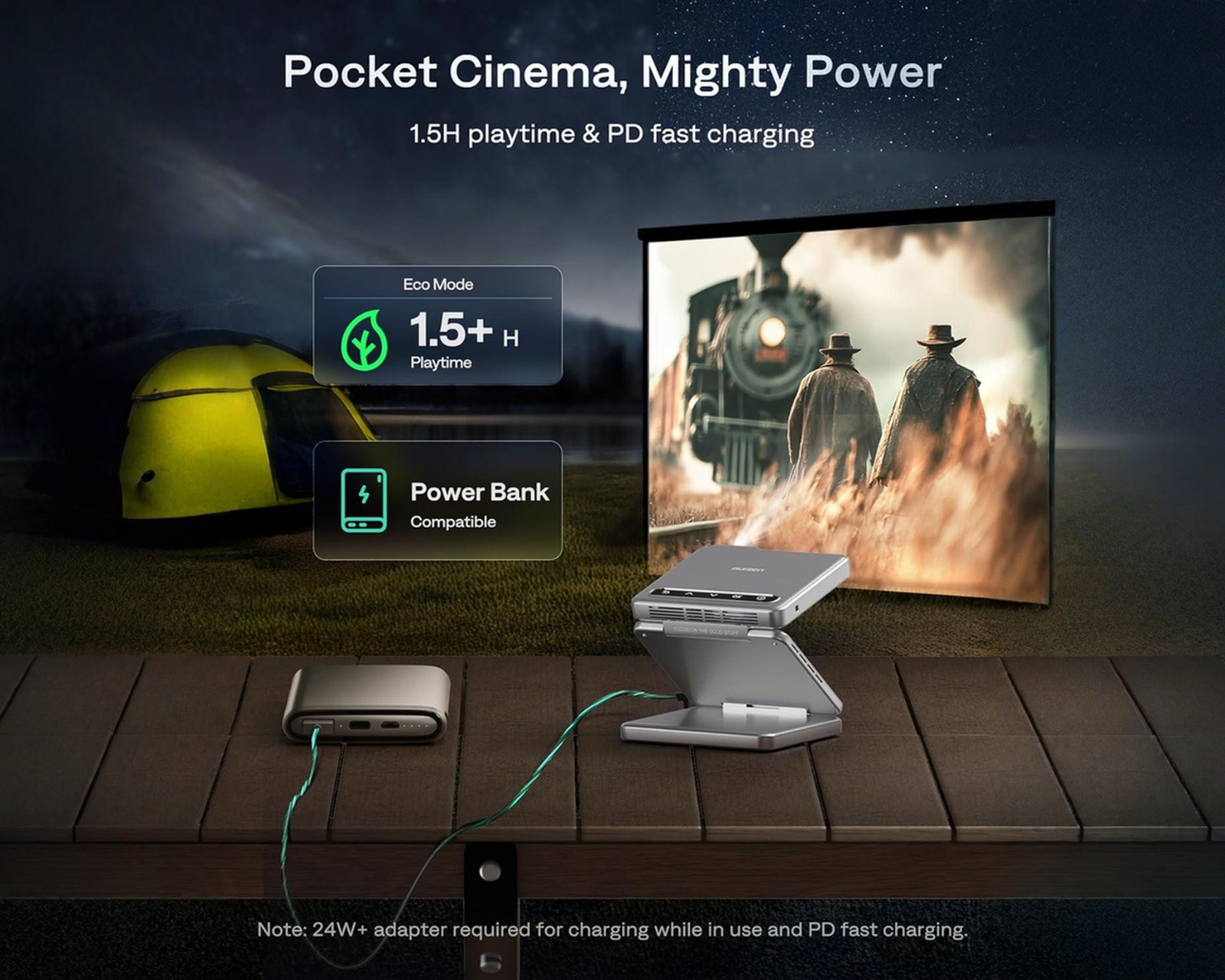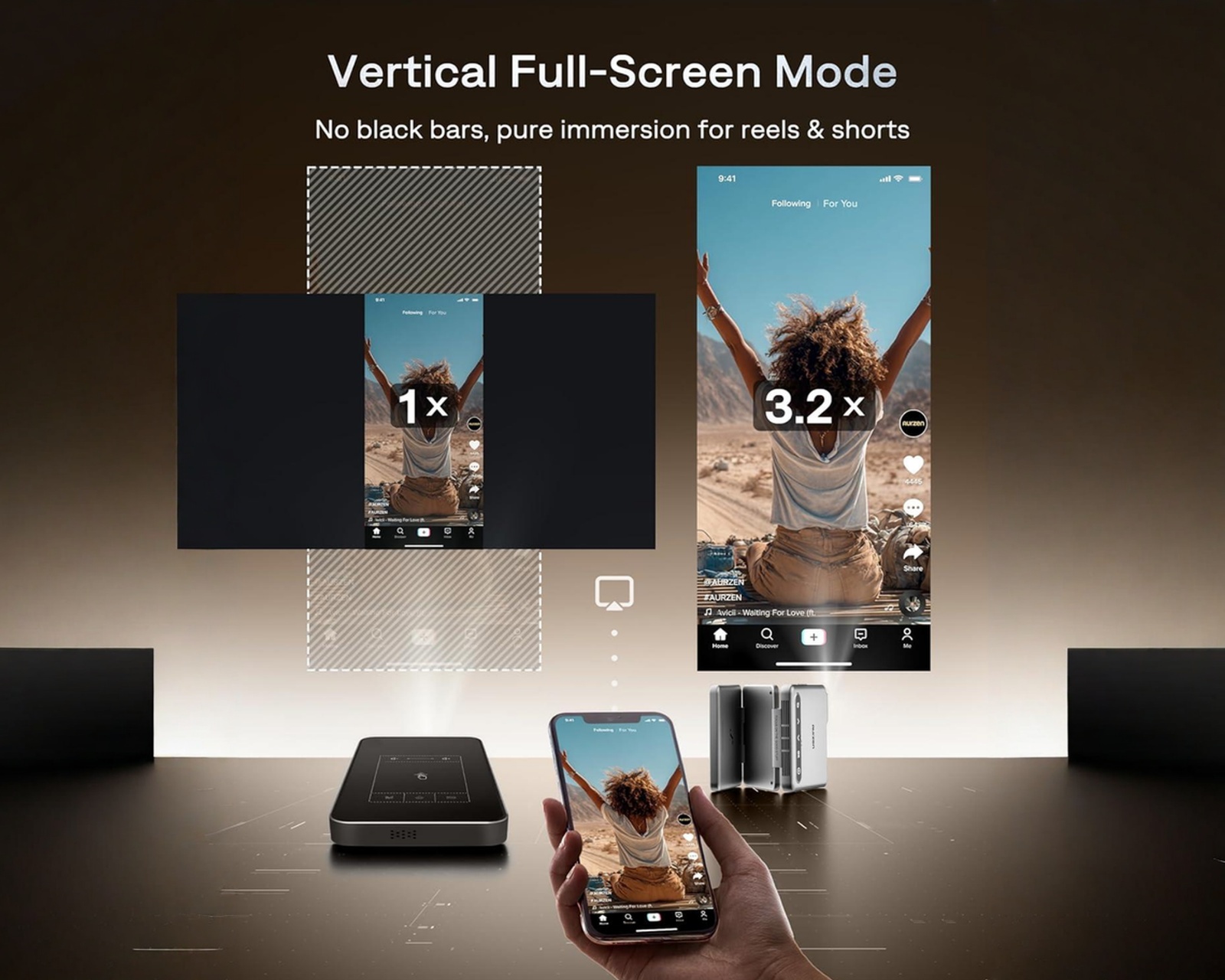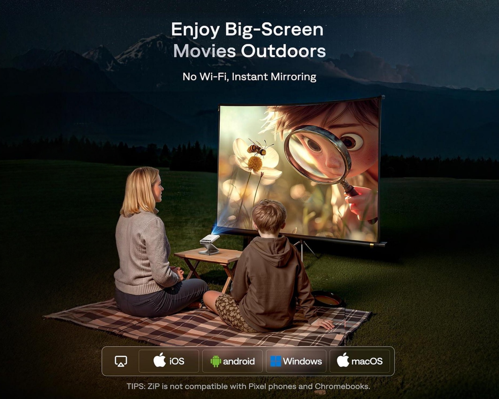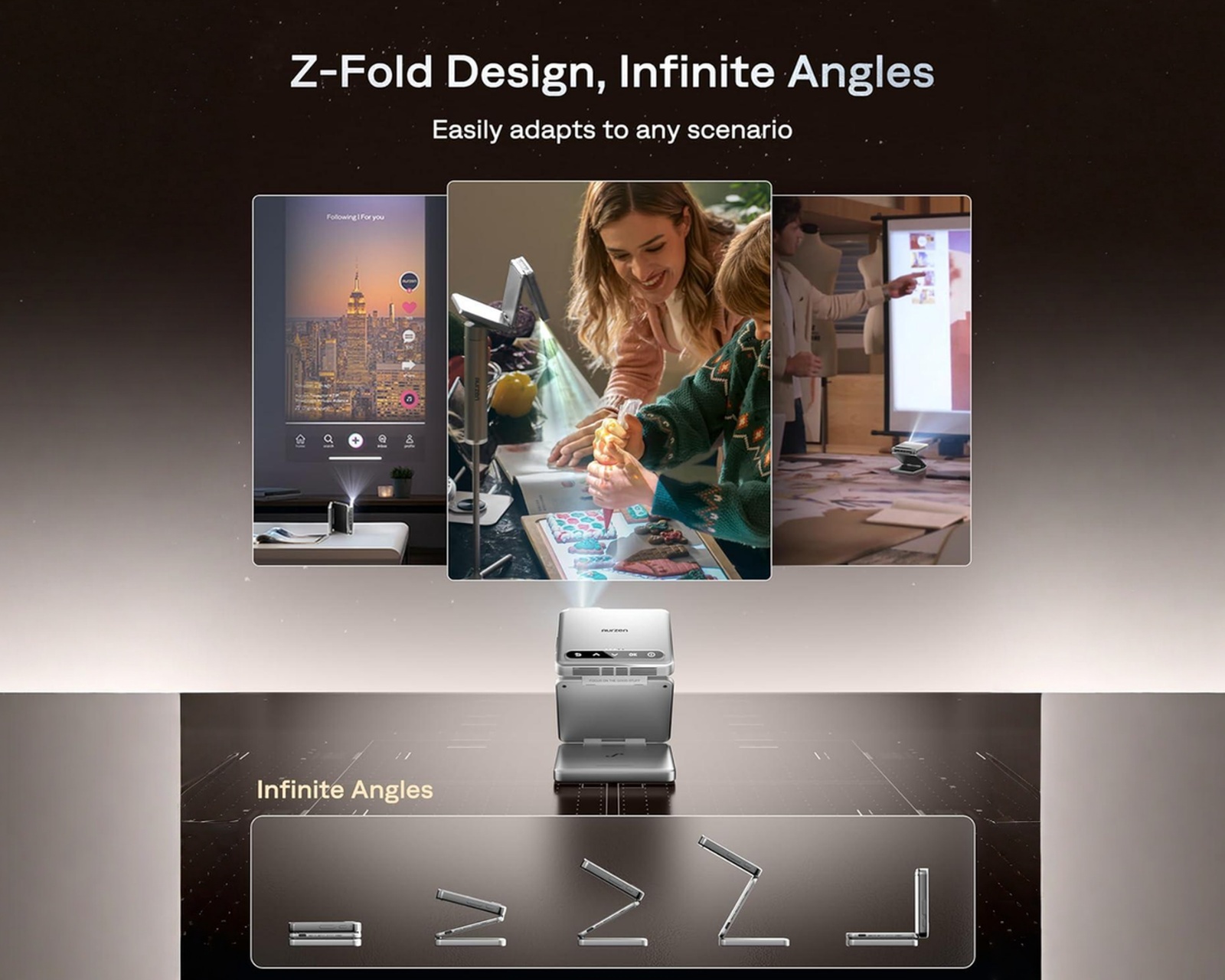 Aurzen ZIP Tri-Fold Bærbar Mini Projektor er en unik og allsidig prosjektor fra Aurzen som kombinerer portabilitet og høy kvalitet. Denne tri-fold prosjektoren tilbyr en oppløsning på 720p og er designet for å kunne foldes sammen til en kompakt størrelse, noe som gjør den enkel å ta med seg overalt. Dens innebygde batteri gir opptil 1,5 timers spilletid og støtter hurtiglading via USB-C, noe som gjør at du kan nyte filmer og presentasjoner på farten.Projektoren er bygget med avansert DLP-teknologi som gir levende farger og høy bildekvalitet, perfekt for å vise detaljerte bilder og videoer. Enheten bruker et 5000mAh batteri og tilbyr øyeblikkelig speiling uten behov for Wi-Fi, noe som gjør den kompatibel med ulike enheter som iOS, Android og Windows. ZIP Tri-Fold har dessuten en intelligent automatisk fokusering som fungerer uten forsinkelse, noe som innebærer en smidig brukeropplevelse. Den er perfekt for både hjemmebruk og profesjonelle presentasjoner.