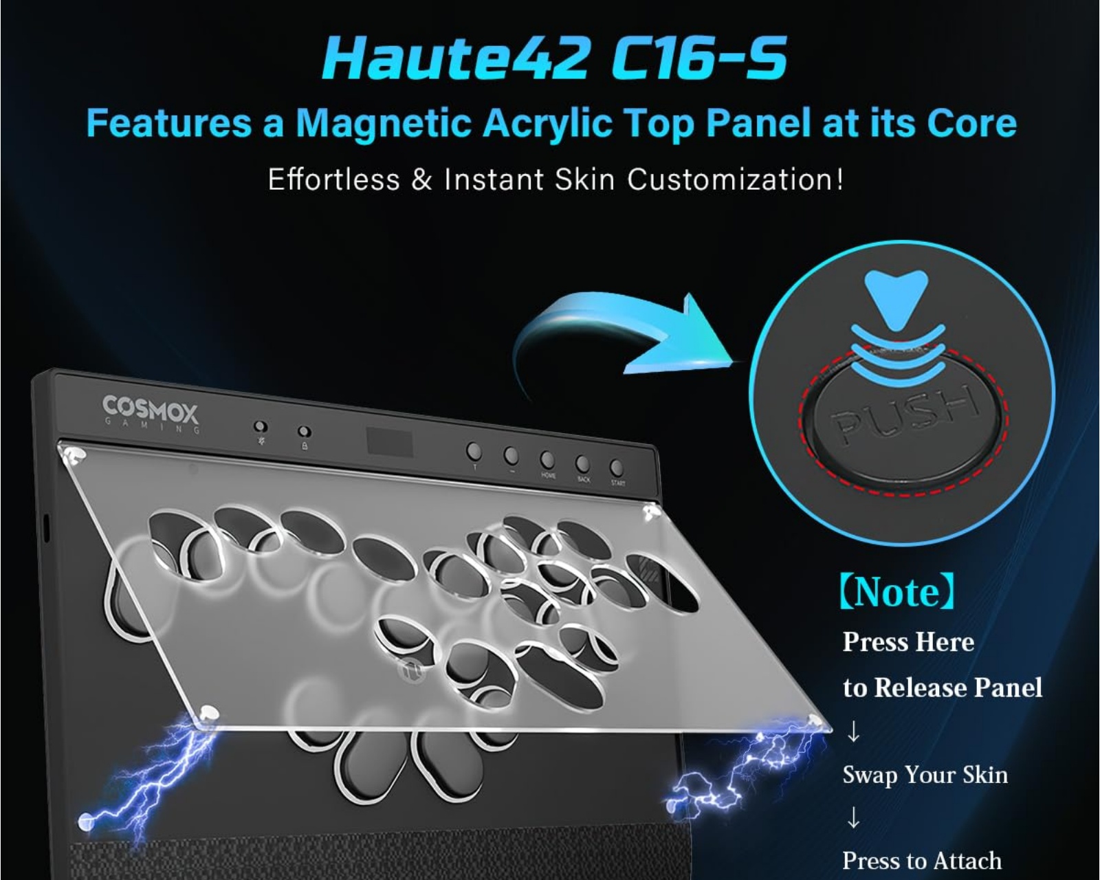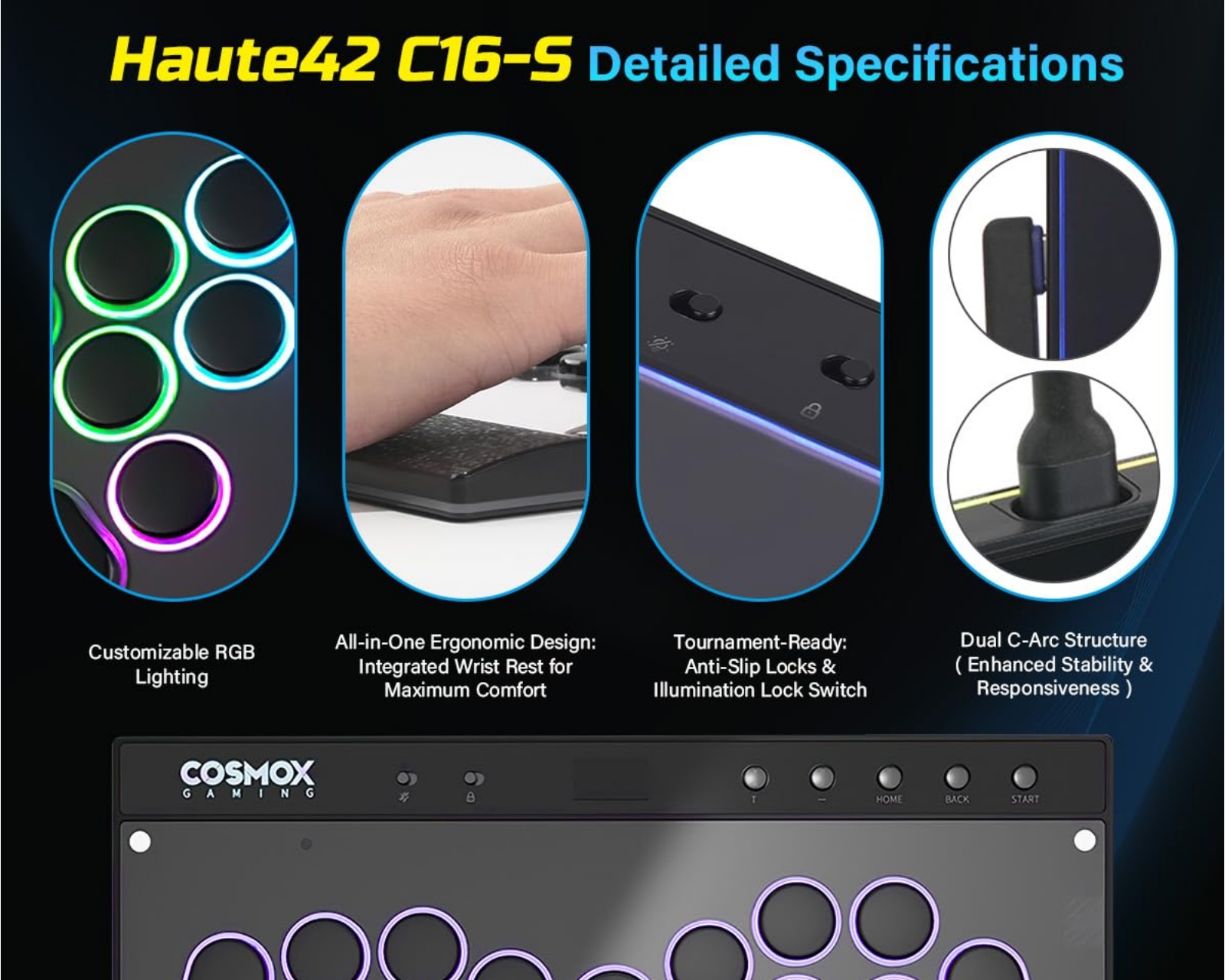 Haute42 C16-S Arcade Controller er en revolusjonerende spillkontroll som kombinerer moderne design med avansert teknologi. Med et unikt magnetisk panelkonsept kan brukeren enkelt tilpasse sin spillopplevelse uten behov for skruer.C16-Ss ergonomiske design og RGB-ringsbelysning rundt knappene gir både visuell appell og praktisk funksjonalitet. I leveransen inngår også kunstmaler for personlig tilpasning samt et turneringslås for å forhindre uønsket trykk under intens spilling. Med en ultra-lav latens på mindre enn 1 ms og med støtte for firmwareoppdateringer, garanterer den en stabil og pålitelig spillopplevelse.