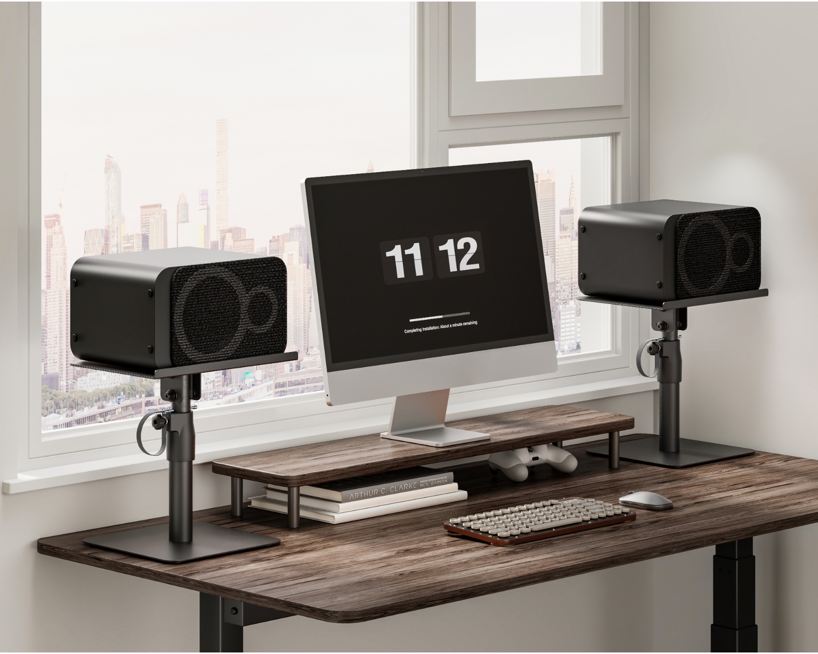 Justerbare høyttalerstativ er et par frittstående høyttalerstativ fra MaxMount designet for å muliggjøre en nøyaktig og fleksibel posisjonering av høyttalere. Med fullt justerbare vinkler og vibrasjonsdempende puter sikres optimal lydklarhet. Høyttalerstativet har også innebygd kabelhåndtering som hjelper til med å holde arbeidsflaten ren og organisert. Den frittstående basen tilbyr stabilt støtte og et elegant, stilrent design som kombinerer pålitelighet med estetisk tiltalende utseende.Materialvalget og byggkvaliteten er av høy standard, noe som gir stabilitet og holdbarhet i bruk. Anti-vibrasjonsputene minimerer uønskede vibrasjoner og lyd fra høyttalerne, noe som bidrar til en bedre lytteopplevelse. Den store, solide basen sørger for at stativene står stabilt uansett om de brukes i hjemmet eller i profesjonelle miljøer.