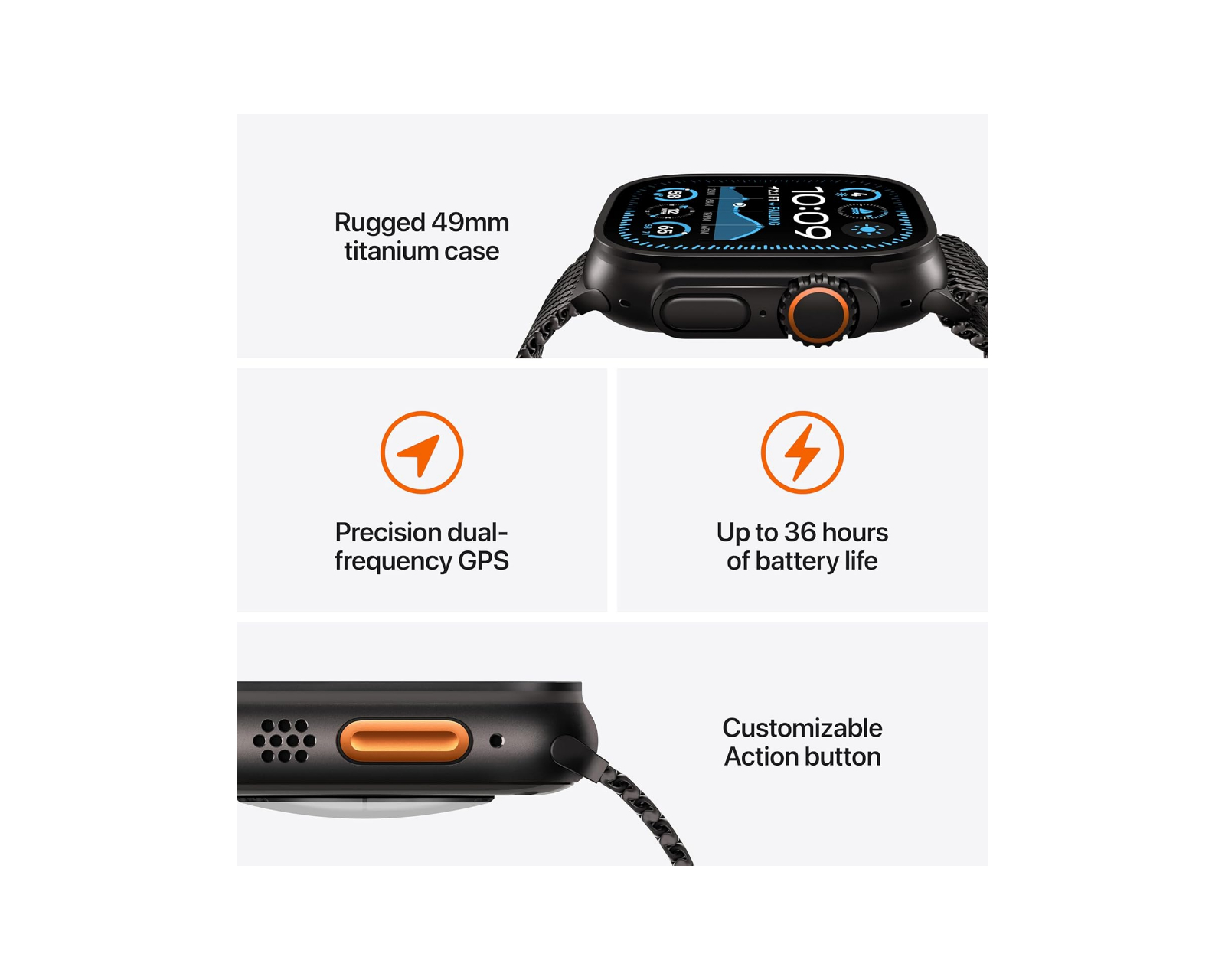 Apple Watch Ultra 2 er et smartur som kombinerer robust design med avanserte helse- og treningsfunksjoner. Den er utstyrt med en Retina OLED-skjerm og fungerer i både 4G LTE- og Bluetooth 5.3-nettverk. Med mer enn tre mikrofoner og doble høyttalere er lyden krystallklar for alle samtaler og meldinger.Bygget av titan og designet for å motstå ekstreme forhold, har Apple Watch Ultra 2 vanntetthet opp til 100 meter og er også korrosjons- og støvtett. Den omfattende helseovervåkningen inkluderer sensorer for EKG, hjertefrekvens og temperatur, noe som gir et nøyaktig bilde av brukerens helse. Den alltid aktive skjermen, beskyttet av safirglass, sikrer at informasjon alltid er lett tilgjengelig og synlig selv under sterkt sollys.
