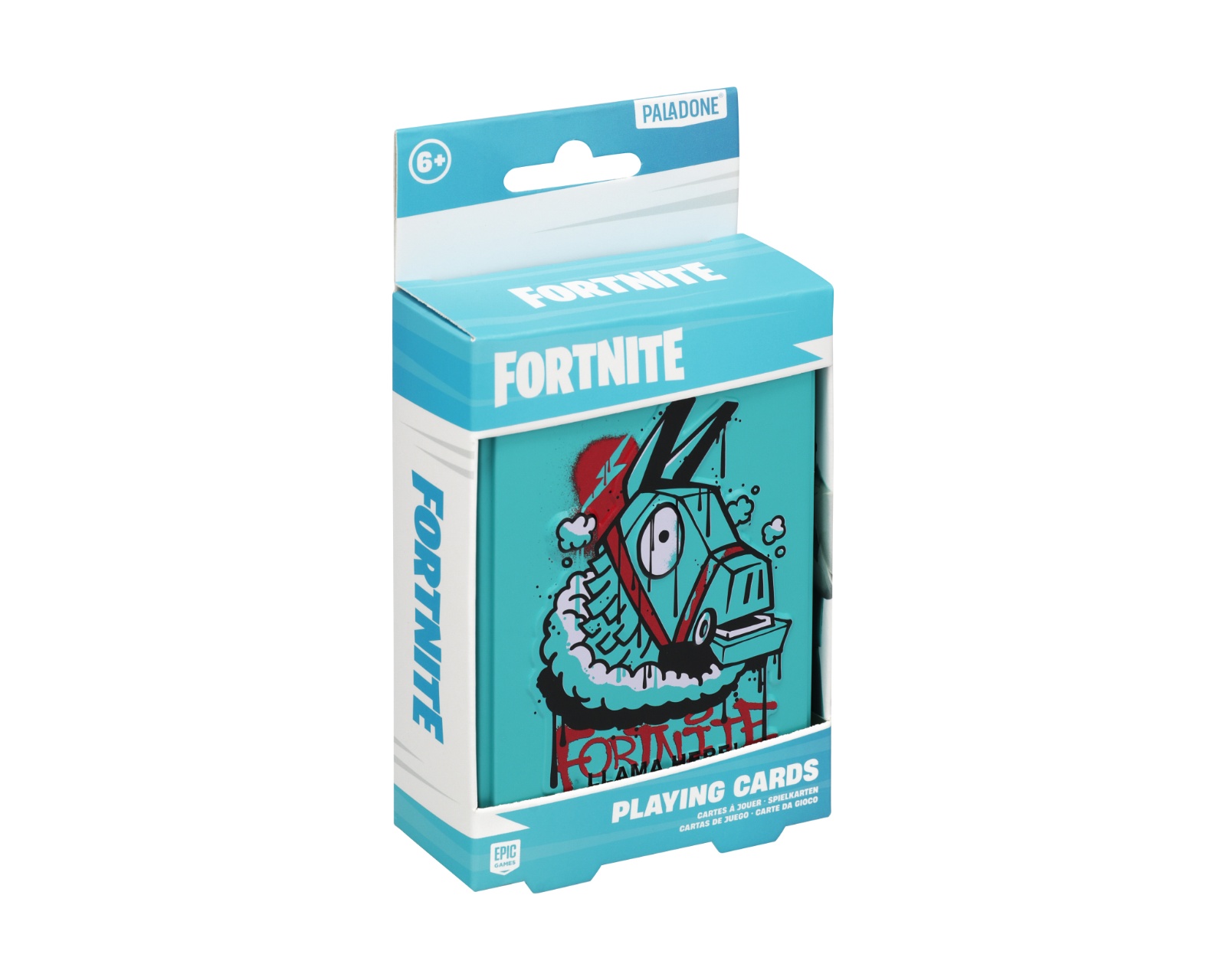 Fortnite Deck er en samling spillkort fra Paladone designet for Fortnite-fans. Kortstokken inneholder 52 spillkort og 2 jokere, alle med illustrasjoner av karakterer og elementer fra spillet. Den medfølgende metallboksen beskytter kortene og forenkler transport. Produktet er beregnet for kortspill eller som et samleobjekt.Kortstokken har kort i standardstørrelse med fargerike trykk som representerer forskjellige figurer, våpen og ikoner fra Fortnite. Kortene er laget av kraftig papir for økt holdbarhet og slitestyrke. Blikkboksen er designet for å være rektangulær og beskytte kortene mot fuktighet og skader. Kortene er offisielt lisensierte og derfor autentiske i designet. Spillere kan bruke kortstokken til tradisjonelle kortspill eller som en del av Fortnite-samlingen sin.