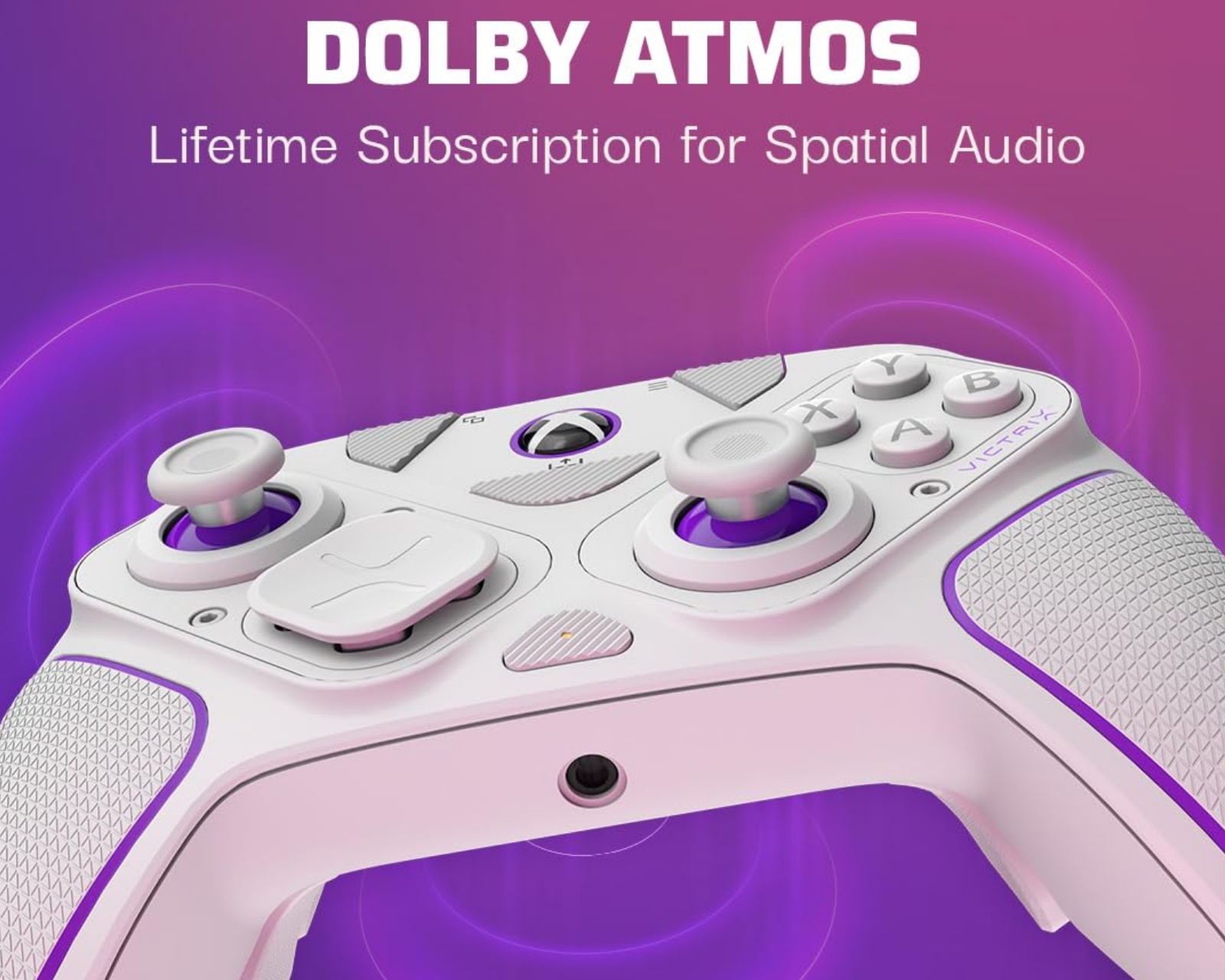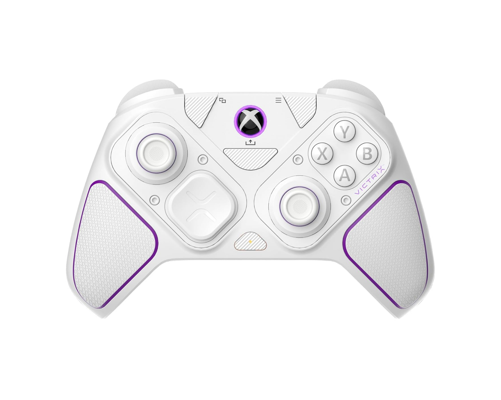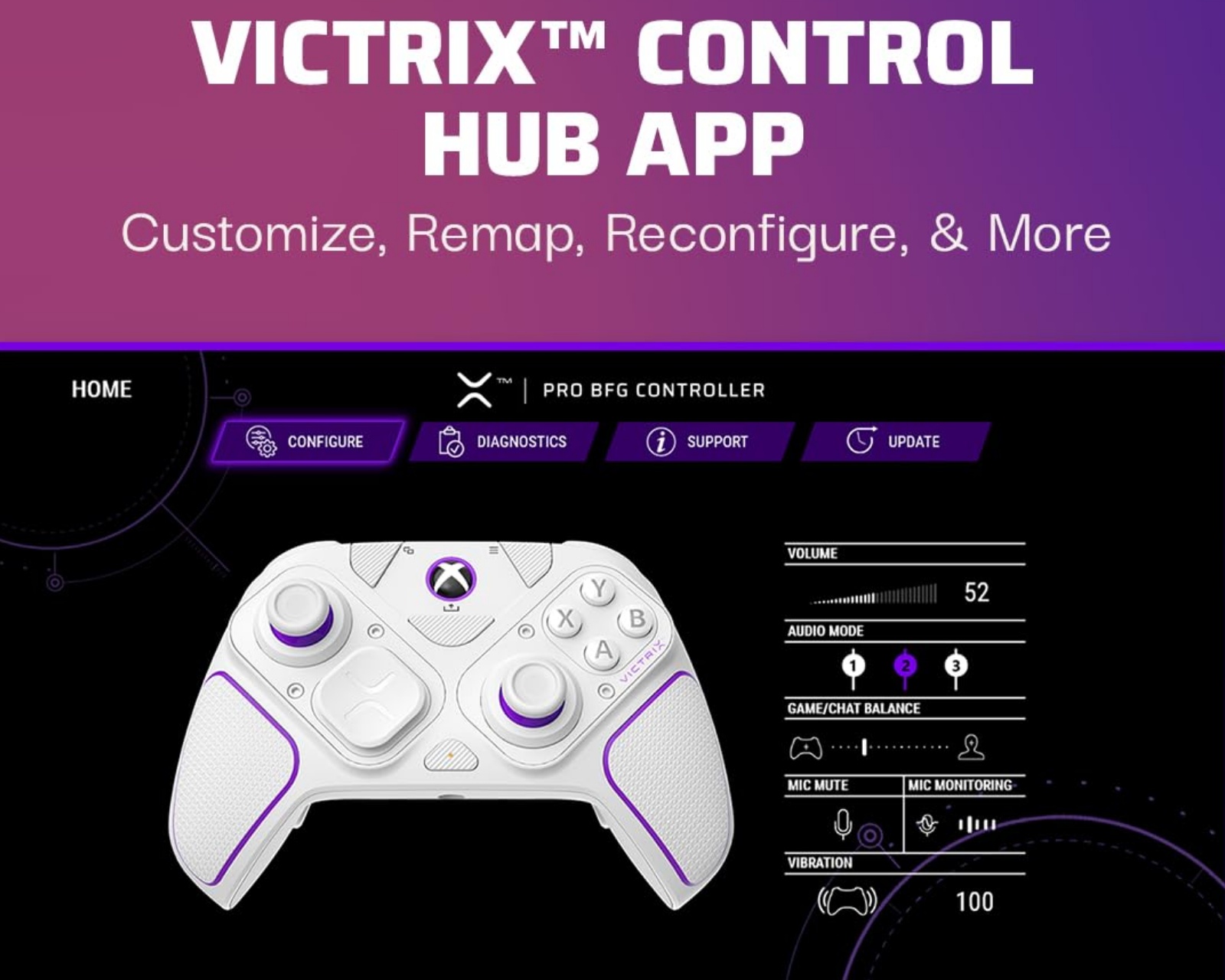 Victrix Pro BFG-kontrolleren er en håndkontroll fra PDP som tilbyr avanserte tilpasningsmuligheter og høy presisjon. Den er kompatibel med Xbox Series X, Xbox Series S, Xbox One samt Windows 10/11. Den kan brukes trådløst via USB-dongel eller Bluetooth, eller kobles til med den medfølgende kabelen for turneringsspill og raskere inngang.Den modulære designen lar brukeren konfigurere kontrollen etter egne preferanser med en gjentagende venstre moduler, en standard høyre modul, en 6-knapps kampplate og fire byttbare thumbsticks. Kontrollen inkluderer tre forskjellige D-Pader og fire forskjellige porter. Lydgjengivelse med lav latens og innebygd Dolby Atmos tilbyr en romlig surroundlydopplevelse for spillere. Patenterte Clutch Triggers med fem stoppunkter og en hardtrigger-modus samt fire mappable bakknapper gir ytterligere tilpasningsmuligheter via den gratis Victrix Control Hub-appen.