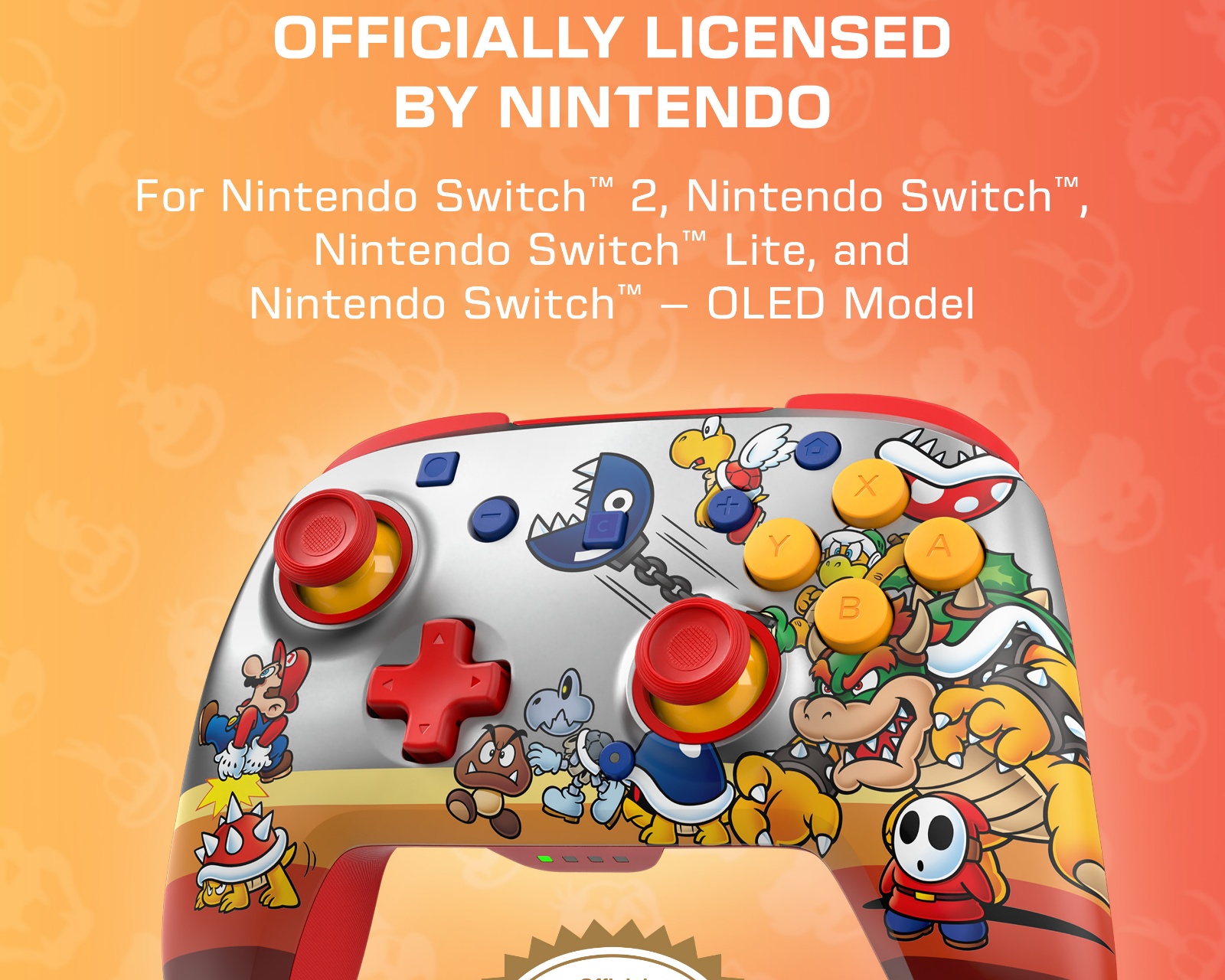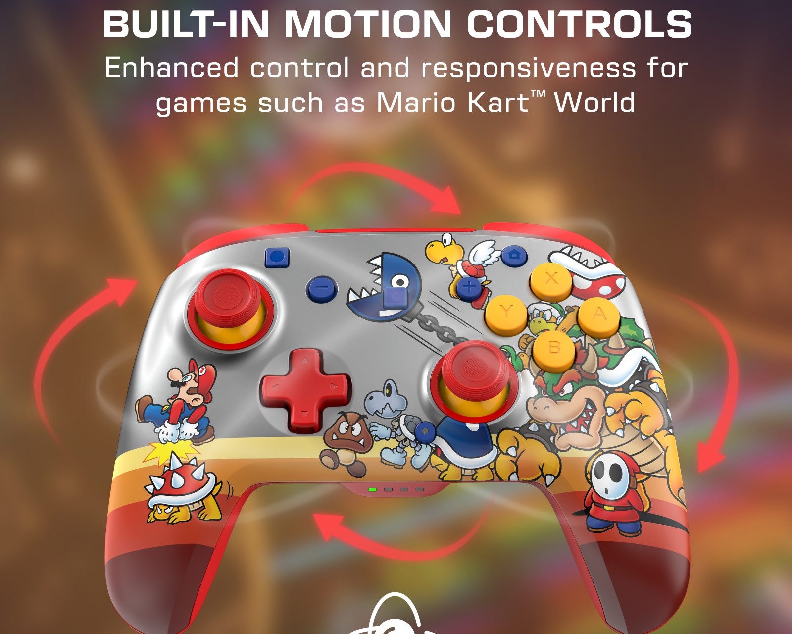 Rematch™ Koopa Troop är en trådlös spillkontroll fra Turtle Beach, designet for Nintendo Switch™ 2, og er også kompatibel med Nintendo Switch™, Switch™ Lite og OLED-modellen. Kontrollen har en imponerende trådlös rekkevidde på opptil 30 fot og tilbyr RGB-belysning med fire dynamiske moduser.Kontrollen er bygget med premium TMR (Tunneling Magnetoresistance) tommelspaker som forbedrer responsivitet og presisjon. Den integrerte bevegelseskontrollen lar spillere dra nytte av en mer interaktiv spillopplevelse. Med et innebygd, oppladbart batteri får du opptil 40 timers spiltid uten RGB-lys eller 12 timer med lyset på, noe som gir langvarig bruk.