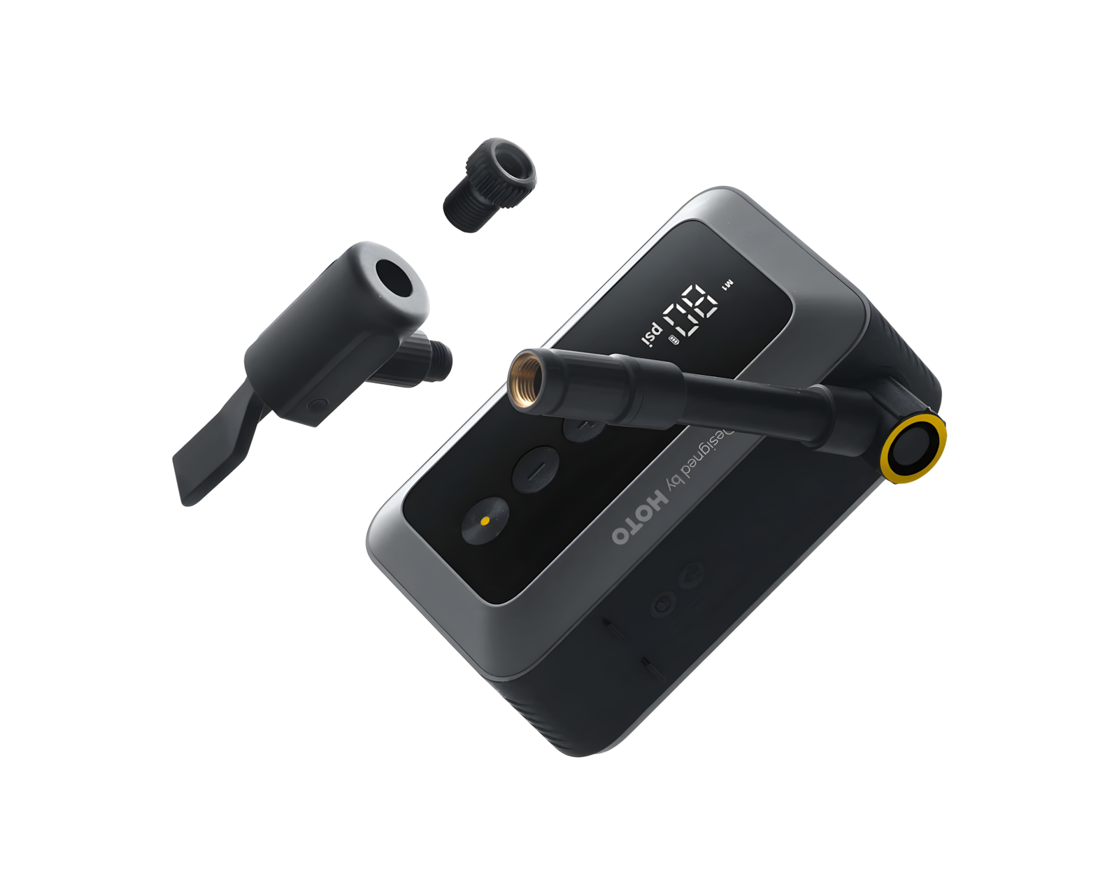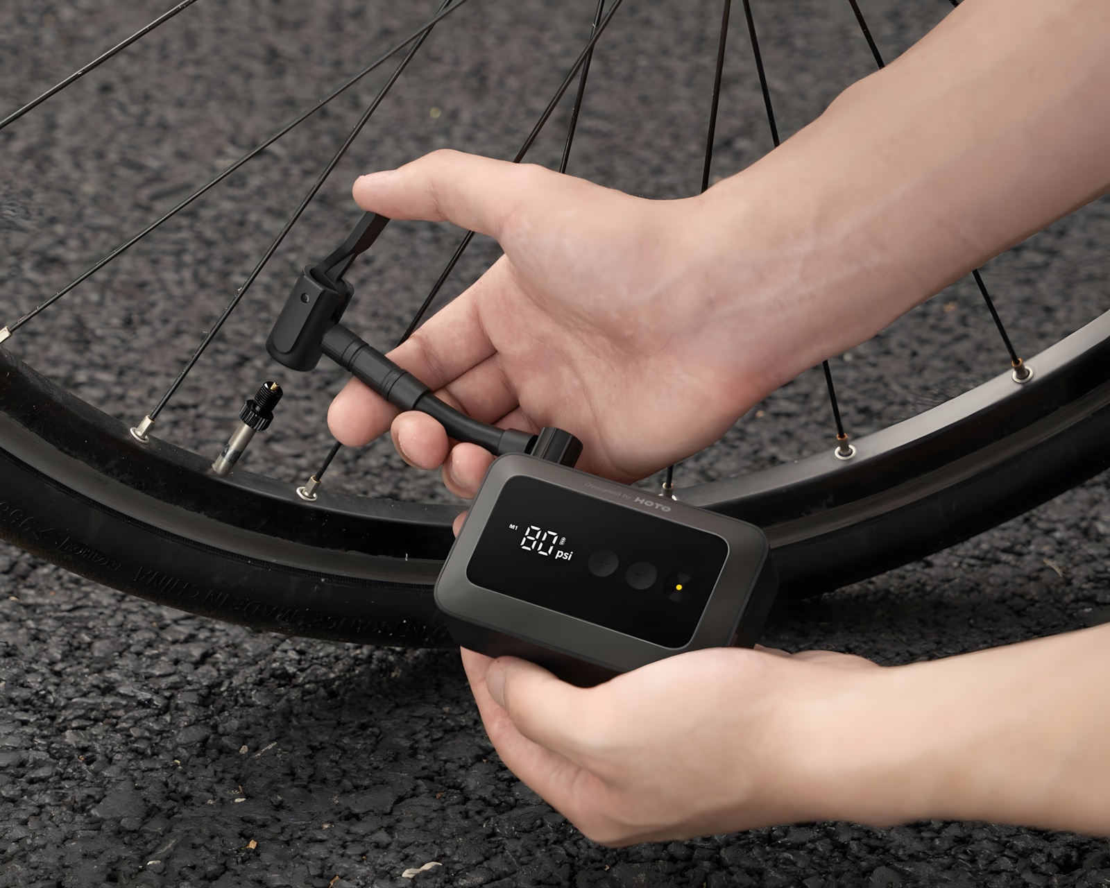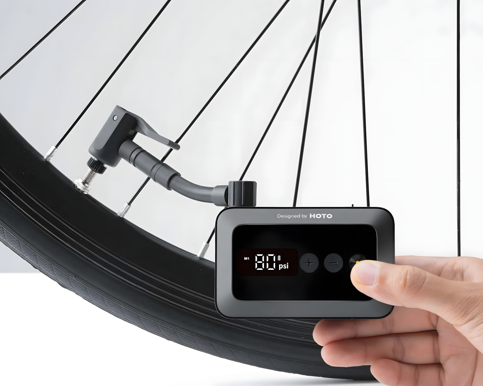 Luftpumpe Fickformat er en kompakt elektrisk luftpumpe fra HOTO. Den er designet for bruk med sykler, motorsykkeldekk og baller. Med en trykkinnstilling som kan justeres digitalt mellom 3 til 150 psi, slår pumpen seg automatisk av når det innstilte trykket er nådd og husker den siste innstillingen for rask gjenbruk. Den er egnet for landeveissykler, el-sykler, motorsykkeldekk samt små oppblåsbare gjenstander.Luftpumpens konstruksjon er både lett og kompakt, noe som gjør det enkelt å ta den med i en veske eller lomme. Det innebygde litiumbatteriet gir tilstrekkelig kraft til å pumpe opp til åtte sykler og kan raskt lades via USB-C. En indikator viser ladestatusen, og de medfølgende adapterne gir støtte for Schrader-, Presta- og Dunlop-ventiler samt for hurtigkobling og nålventiler. Med disse komponentene er pumpen allsidig og kan brukes til en rekke ulike oppblåsbare objekter.