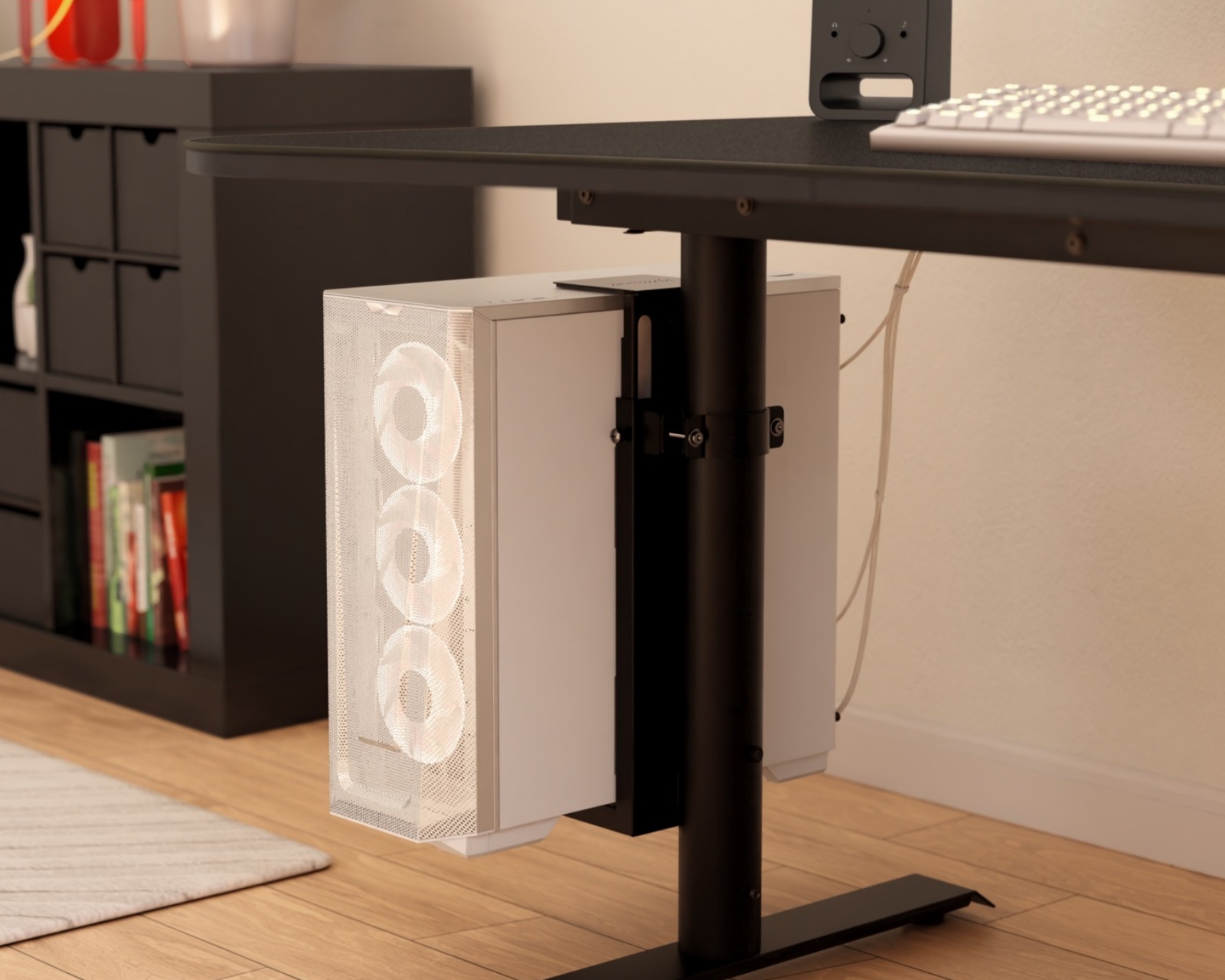 PC-feste er et produkt fra Arozzi som er designet for å montere en datamaskin på en sikker måte. Dens design frigjør gulv- og skrivebordsplass, noe som gjør det til en ideell funksjon for høyderegulerbare skrivebord som Arena Moto. Med en justerbar størrelse, sterk stålstruktur og beskyttende polstring tilbyr dette festet en funksjonell og beskyttende løsning for å holde oppsettet ditt organisert og rent. Høyeste høyde er 55,5 cm og minimum høyde er 34,5 cm, noe som gjør det fleksibelt nok til å passe ulike datastørrelser. Dette PC-festet er laget av robust stål som sikrer langvarig holdbarhet og stabilitet. Den beskyttende polstringen er designet for å forhindre riper og skader på datamaskinen din under bruk. En av dens nøkkelfunksjoner er 360° monteringsfleksibilitet som lar brukeren plassere enheten akkurat der den passer best i arbeidsområdet. Med en maksimal vektkapasitet på 30 kg kan det håndtere tyngre bygninger uten å kompromittere sikkerheten.Sammendrag
