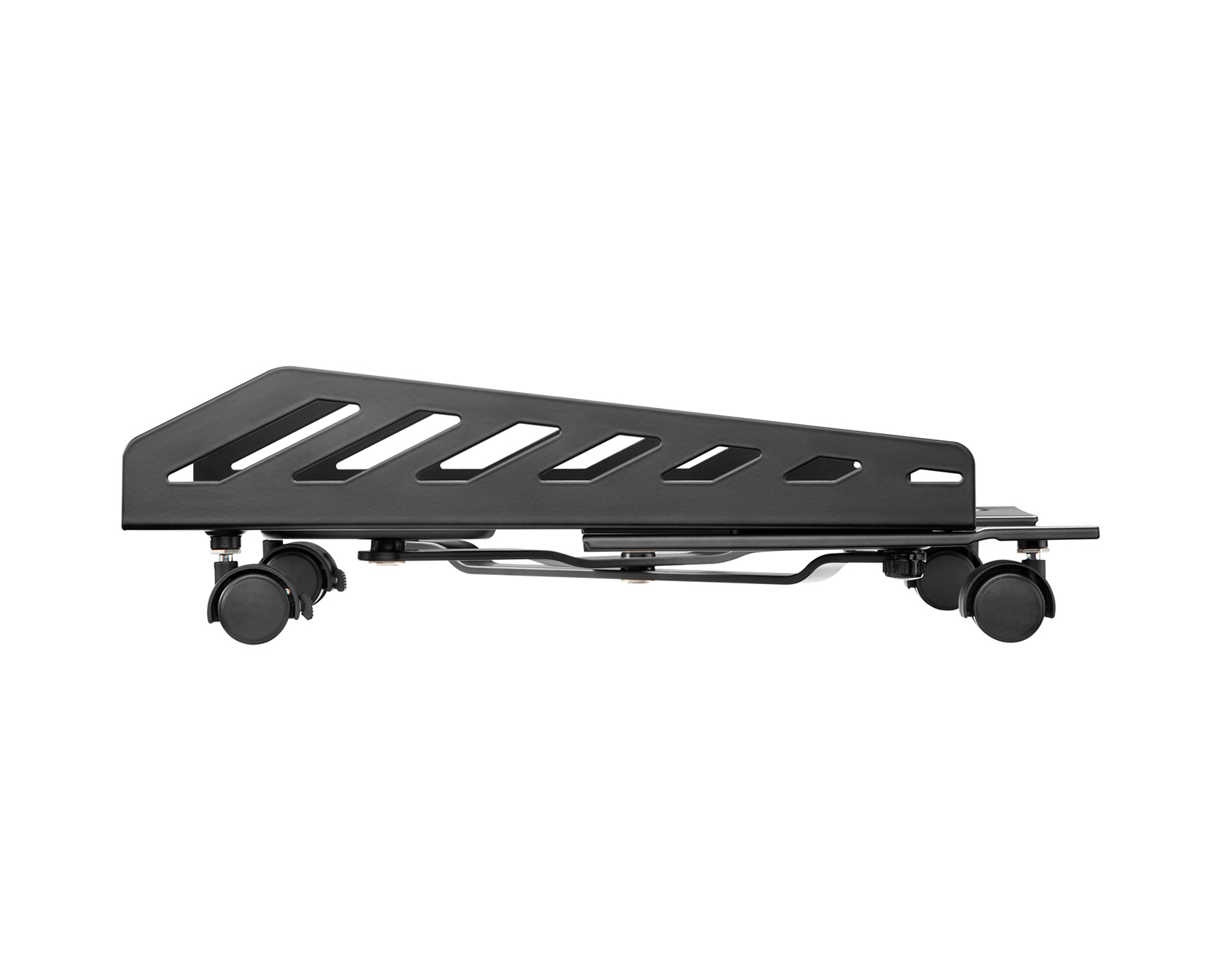 Byggekvaliteten er høy, og stativet er utstyrt med kraftige hjul inkludert to låsebare for økt stabilitet. Den unike designen gör at brukeren kan justere både bredde og längd for å passe forskjellige størrelser av datamaskiner. Beskyttelsesdekseldesignen säkerställer at enheten holdes säkert på plass under bruk, selv under intensive spillesesjoner. De robuste hjulene gör det enkelt å førflytte datamaskinen, noe som ytterligere forenkler rengjøring og håndtering rundt skrivebordet.