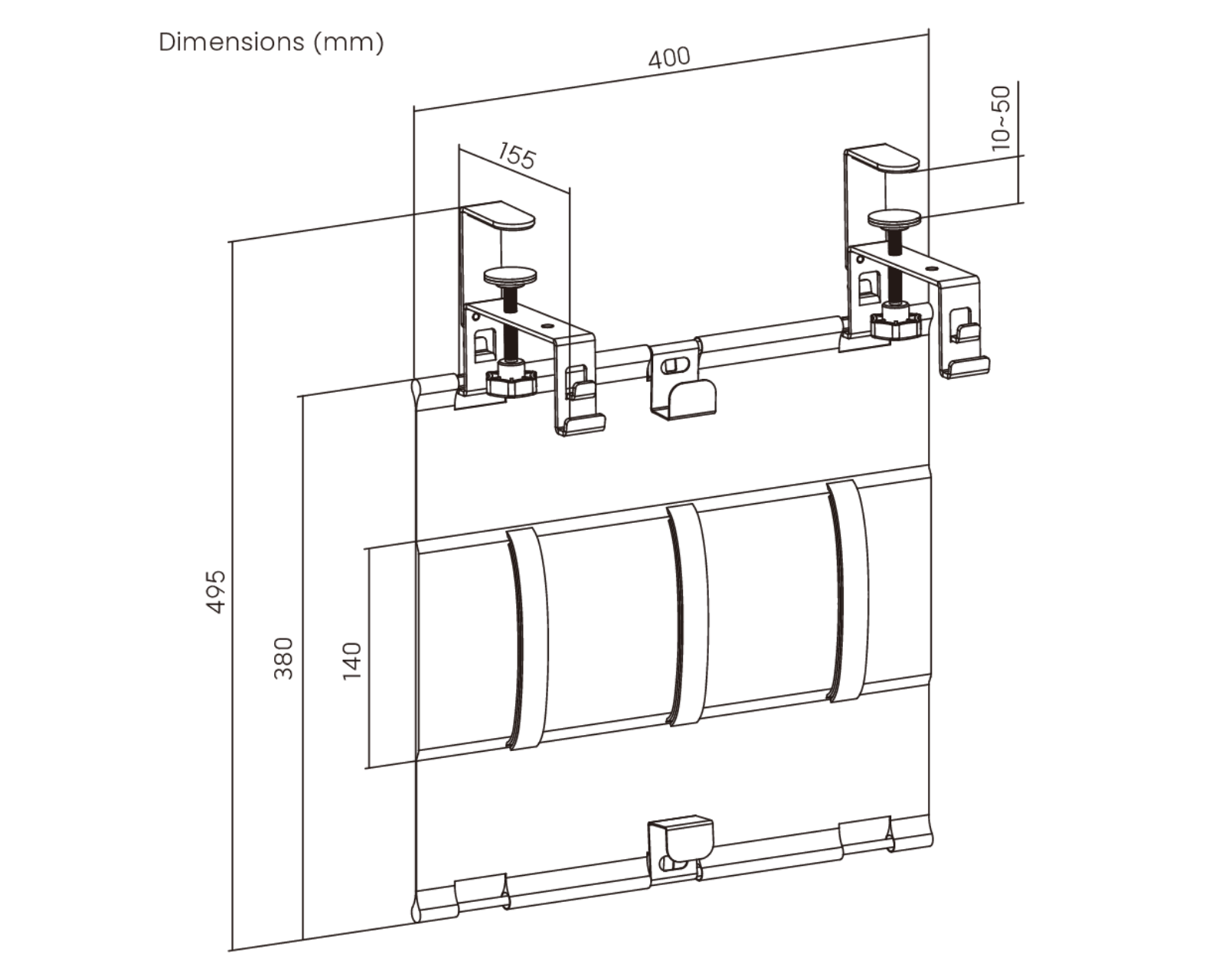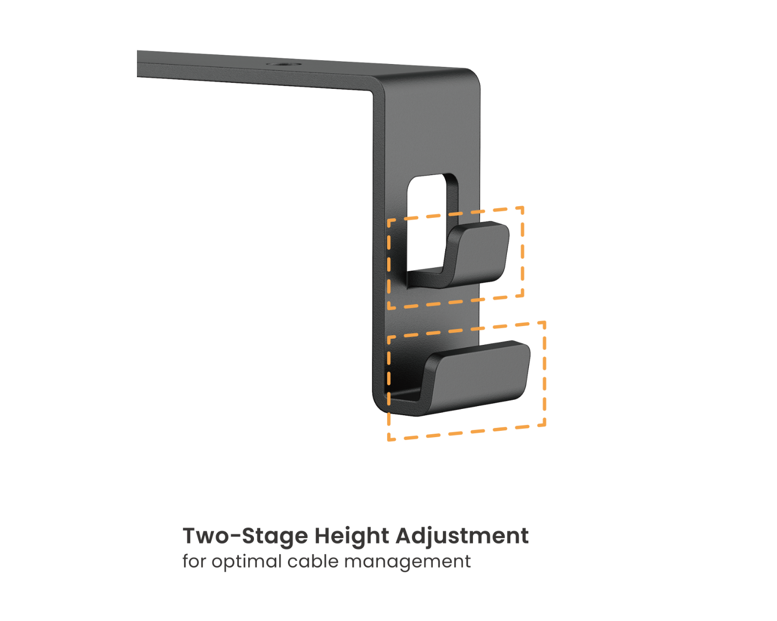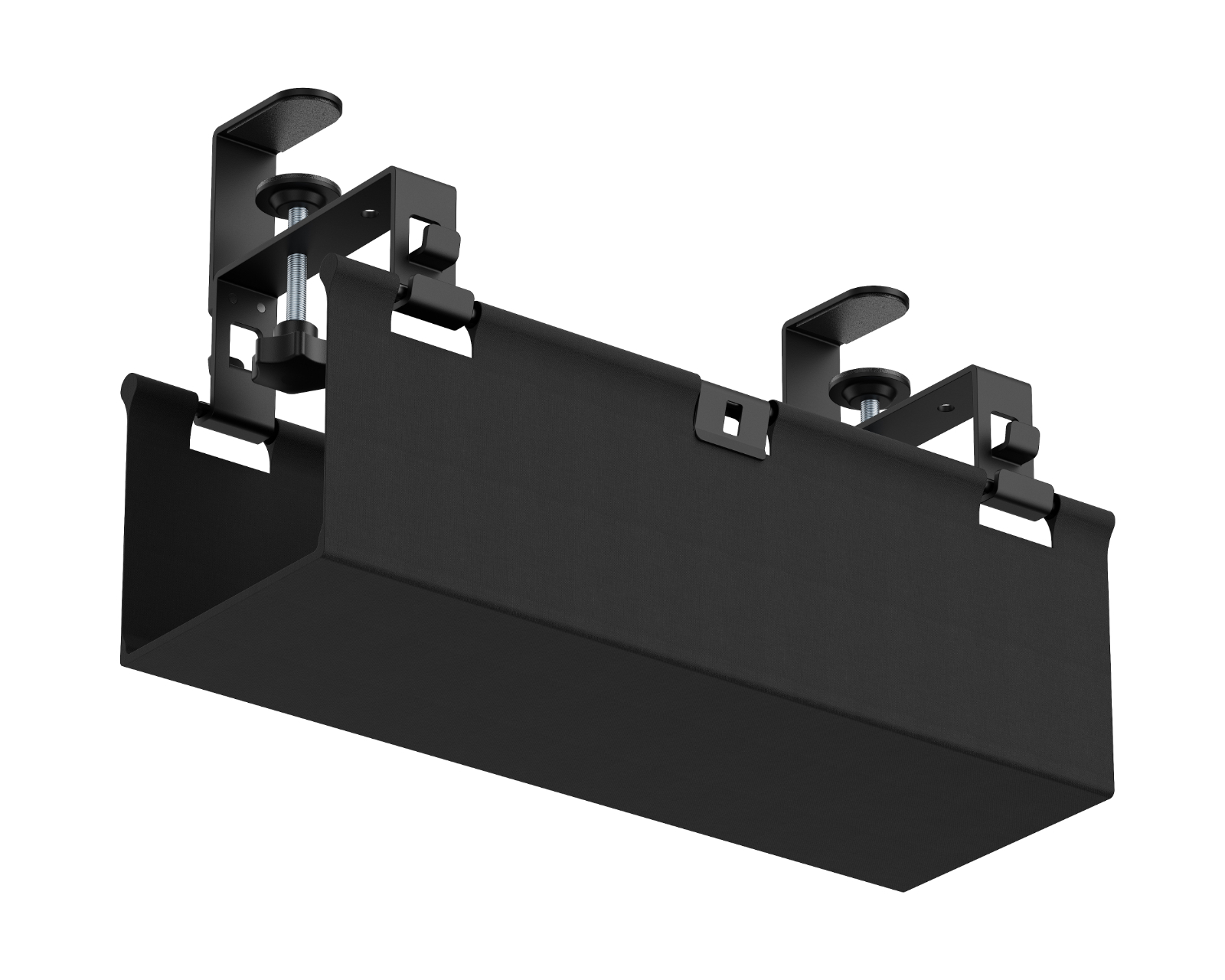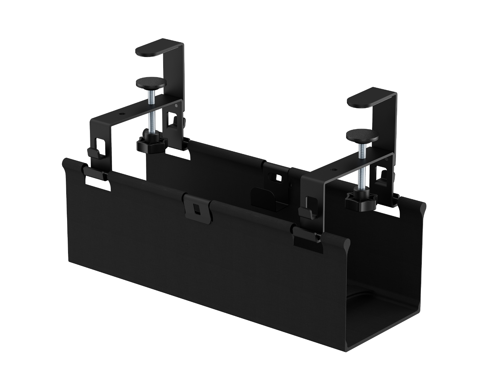 Kabelkanal med bordsfeste fra MaxMount skjuler kabler og ledninger effektivt under skrivebordet. Kabelkanalen installeres enkelt med bordsfeste og tilbyr en justerbar høyde med to nivåer, noe som gir fleksibilitet for ulike kabler og enheter. Kabelkanalen er konstruert av en kombinasjon av stål, plast og oxfordstoff med en pulverlakkert overflate, som gir både holdbarhet og et profesjonelt utseende.Kabelkanalen har innebygde fester for sikker kabelhåndtering og leveres med to kabelkroker samt en justerbar kabelbinding på 2 meter for optimal kabling. Med en vektkapasitet på opptil 5 kg sikres dens funksjonalitet og brukervennlighet på ulike arbeidsstasjoner.