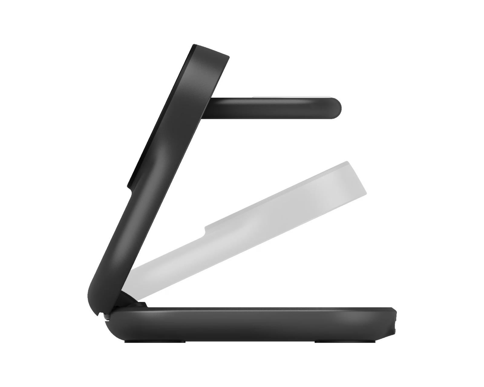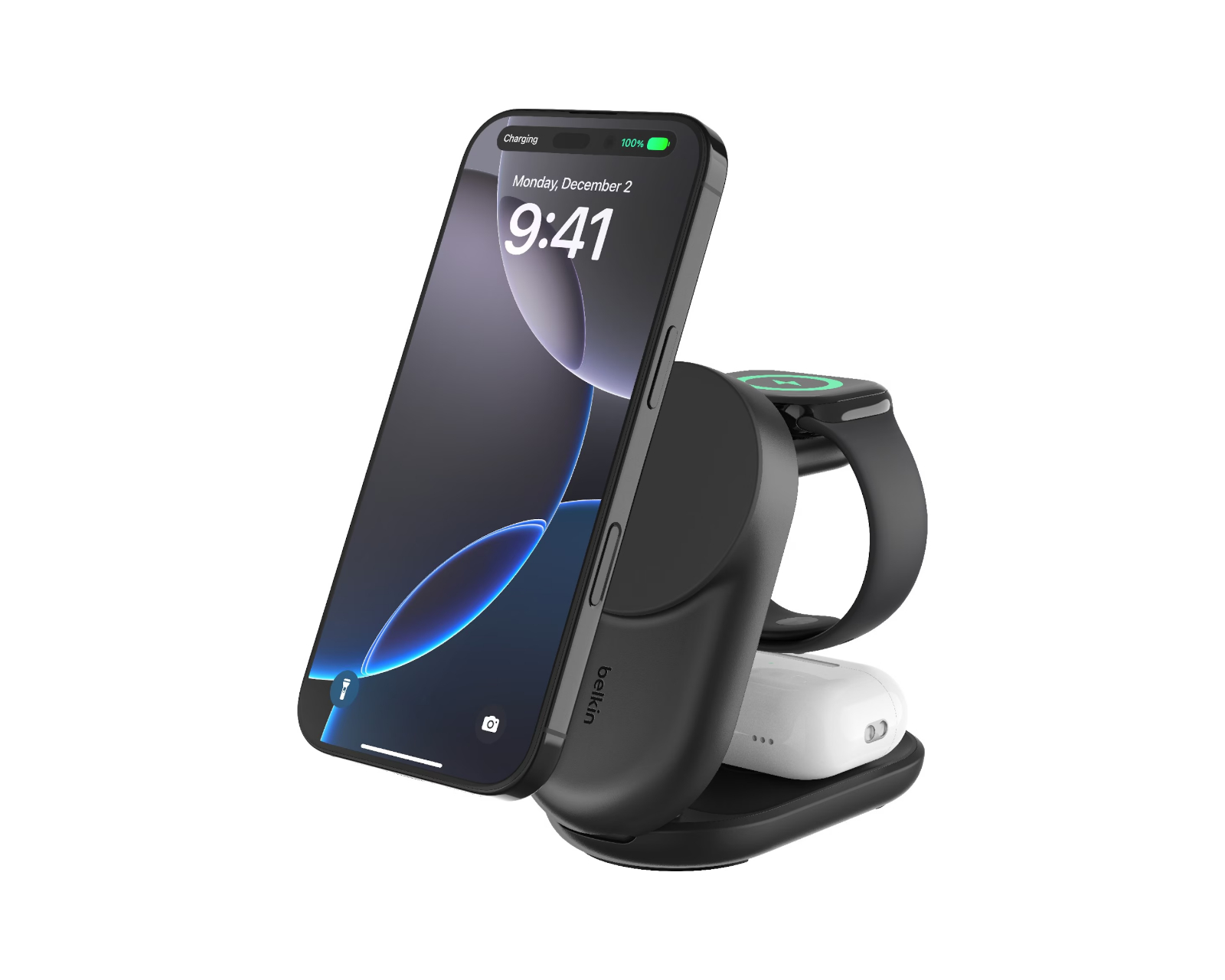 UltraCharge 3-i-1 Qi2 trådløs lader er en trådløs lader fra Belkin som tilbyr omfattende ladealternativer. Med en maksimal styrke på 25 W og en USB-C-strømforsyning på opptil 45 W, er den designet for å effektivt lade flere enheter samtidig. Laderen har en kabellengde på 1,5 m og en sammenleggbar, lett design som gjør den ideell for både hjemmet og reiser.Enheten drives av Qi2-teknologi, som muliggjør raskere trådløs ladning. Med ChillBoost, en passiv kjøleteknologi, reduseres varmeproduksjonen under hurtiglading, noe som beskytter batteriet på enhetene dine. Laderen kan for eksempel lade en iPhone fra 0-50 % på 29 minutter og en Apple Watch, serie 10, fra 0-80 % på 30 minutter. Den har også støtte for å lade AirPods med en effekt på opptil 5 W. Den halkfrie basen og den magnetiske snap-on-justeringen sikrer en stabil lading og en justerbar vinkel for å kunne vise enheten både liggende og stående.