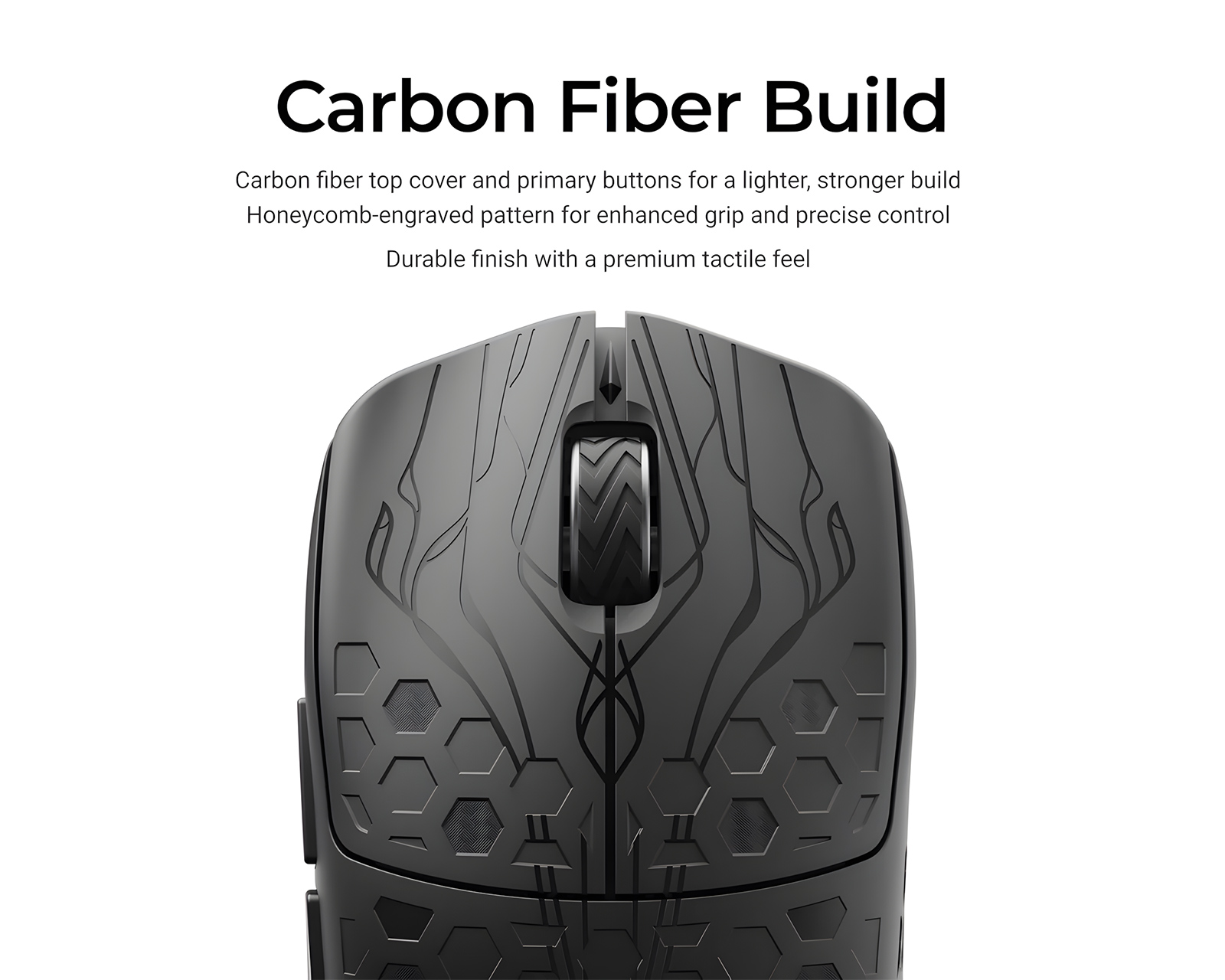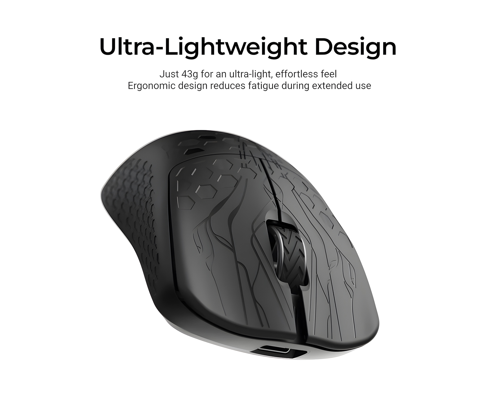 G5 8K Ultra Light Trådløs Mus er en mus fra Keychron som kombinerer en lettvektsdesign med overlegen ytelse. Den er utstyrt med en avansert PixArt 3950-sensor og tilbyr både 2,4 GHz og Bluetooth-tilkoblinger for fleksibel bruk. Med et ergonomisk utformet hylse gir den komfort under lange økter.Produkten veier kun 43 gram takket være sin karbonfiberkonstruksjon, noe som garanterer en robust og holdbar opplevelse uten å kompromisse med vekten. Tilkoblingen via 2,4 GHz gir lav latens og rask respons, som er avgjørende for både gaming og kontorarbeid. Den har en DPI på opptil 20 000, noe som muliggjør høy presisjon og raske bevegelser. G5 tilbyr opptil åtte forskjellige polling rates, inkludert 8000 Hz, som resulterer i en responstid på kun 0,41 ms i 2,4 GHz-modus.