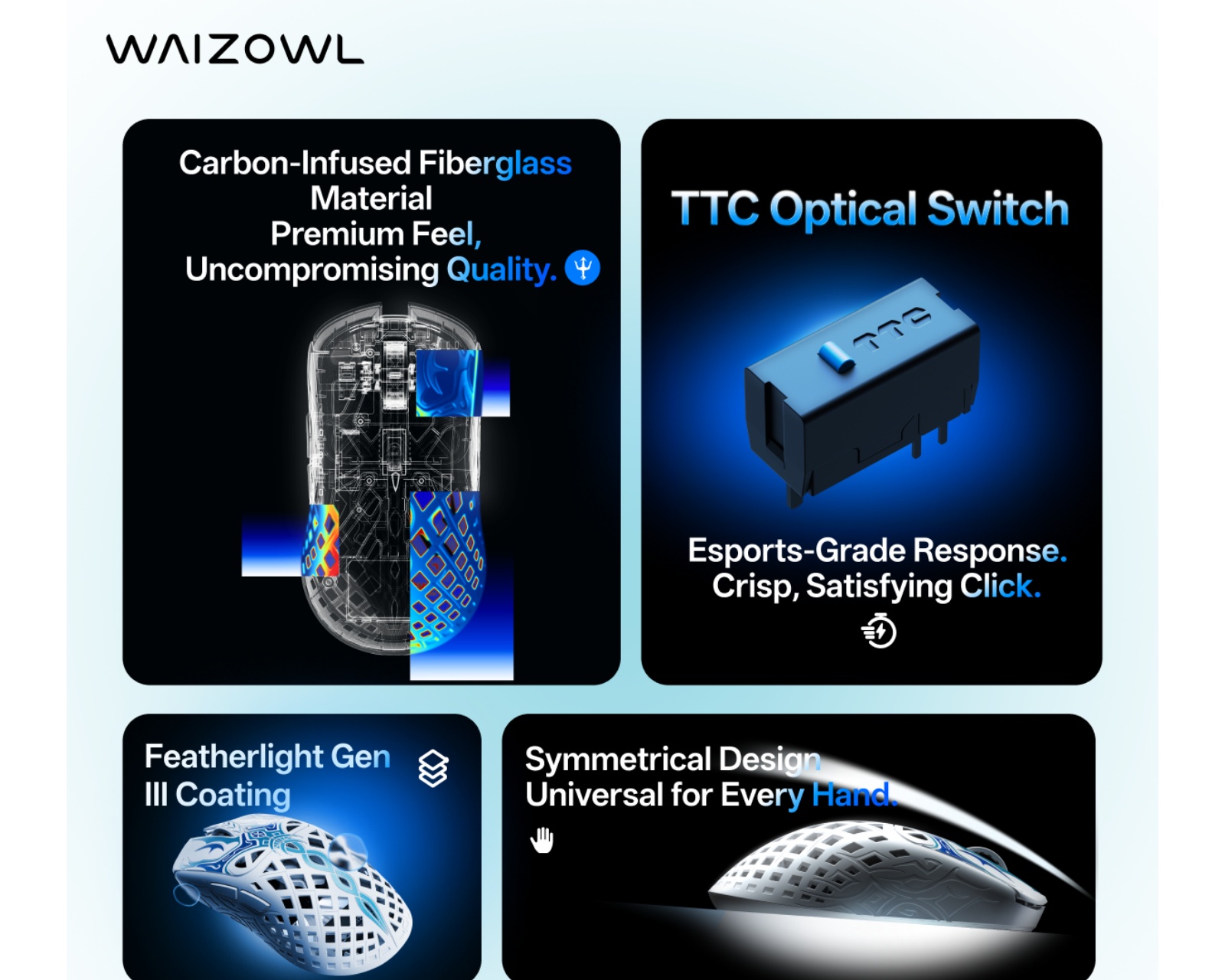 Waizowl tilbyr spilltilbehør for den entusiastiske gameren, med fokus på kvalitet og brukeropplevelse. Waizowl streber etter å flytte grensene for ytelse ved stadig å utvikle nye og innovative produkter. Hvert tilbehør er designet for å forbedre spillopplevelsen og gi spillerne et forsprang i både uformelle og profesjonelle miljøer. Med et team av lidenskapelige eksperter jobber Waizowl utrettelig for å gi spillmiljøet de verktøyene de trenger for å lykkes.