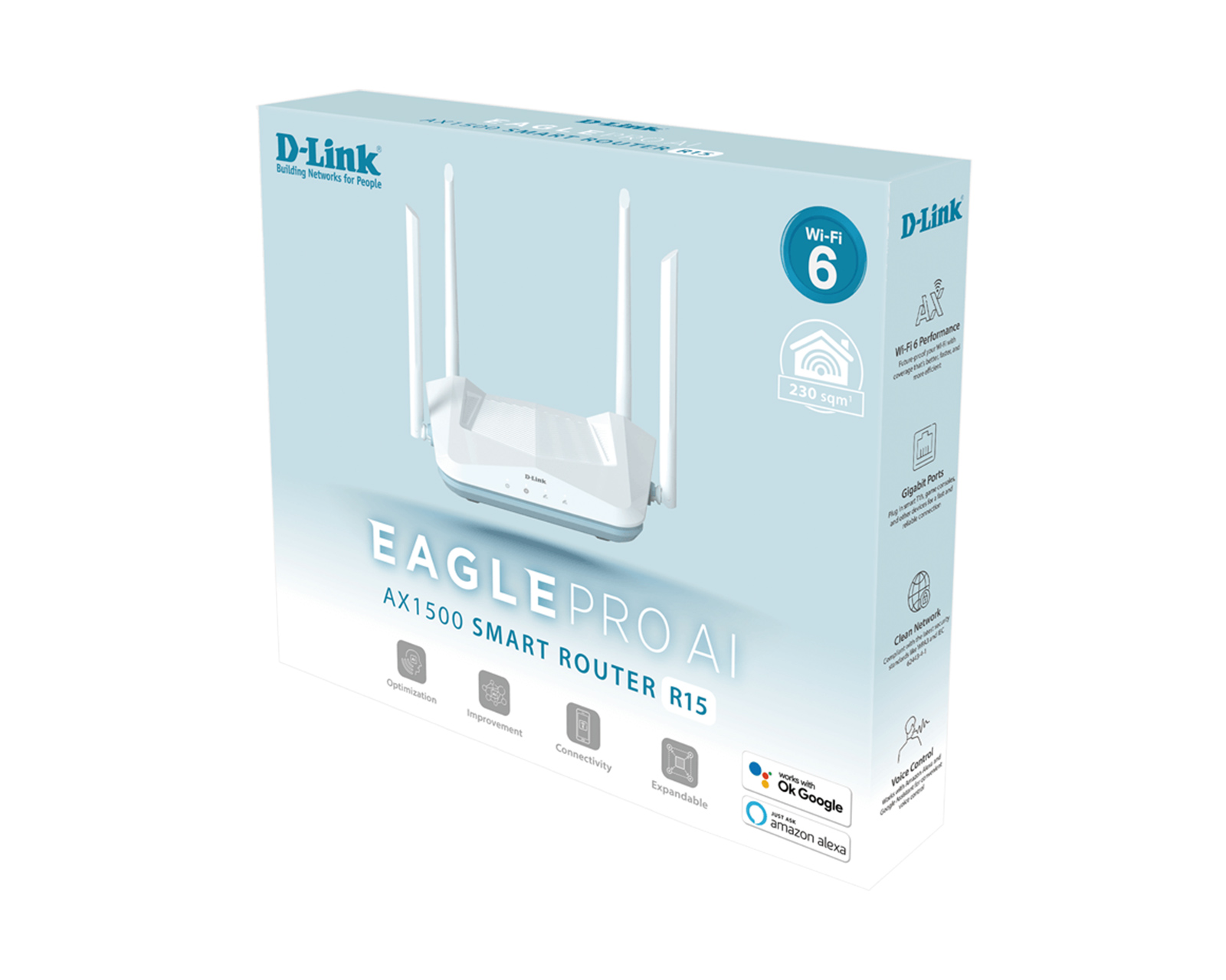 EAGLE PRO AI AX1500 Smart Router er en ruter fra D-Link som tilbyr avansert Wi-Fi-teknologi med støtte for Wi-Fi 6. Denne ruteren har en samlet datahastighet på 1500 Mb/s, fordelt mellom 1201 Mb/s på 5 GHz og 300 Mb/s på 2.4 GHz. Produktet er designet for å støtte flere enheter samtidig, noe som gjør den egnet for smarte hjem der flere brukere kan strømme, spille eller jobbe uten avbrudd. Ruteren håndteres enkelt via EAGLE PRO AI-appen og inneholder avanserte sikkerhetsfunksjoner som WPA3.EAGLE PRO AI AX1500 er utstyrt med dual-band-teknologi, noe som muliggjør en optimalisert nettverksopplevelse. Med funksjoner som MU-MIMO og OFDMA kan enheten effektivt håndtere flere samtidige tilkoblinger, noe som minimerer trafikkork. Talestyring via Google og Alexa tilbys også, noe som gir brukerne enda mer kontroll over sitt nettverk. Ruteren har AI-basert Mesh-funksjonalitet for å forbedre nettverksdekning. Foreldrekontroll og trafikkoptimalisering inngår for å ytterligere personalisere brukeropplevelsen.