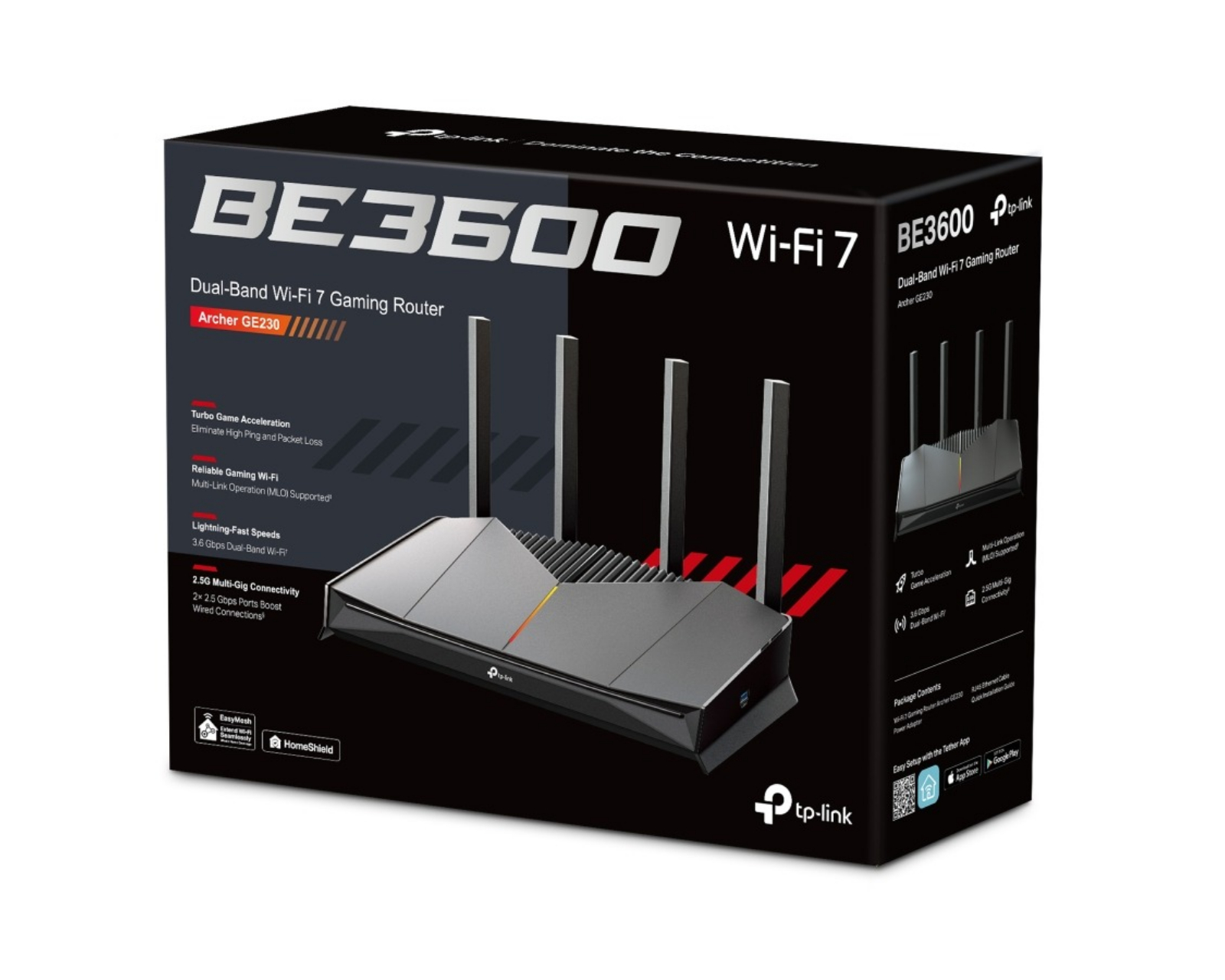 Archer GE230 er en dual-band Wi-Fi 7 gaming-router fra TP-Link som tilbyr enestående hastigheter og ytelse for krevende gamere. Med hastigheter på opptil 3600 Mbps kan brukere nyte raske og stabile tilkoblinger, noe som forbedrer spillopplevelsen betydelig. Routen har også to 2.5G LAN-porter som muliggjør raskere dataoverføring, noe som gir enda mer kraft til online gaming.Bygget for å støtte den nyeste teknologien, har Archer GE230 en quad-core CPU som håndterer flere dataflyt effektivt. Multi-Link Operation (MLO) tillater parallell dataoverføring, noe som reduserer latens og gir en smidigere opplevelse under intens spilling. Den dedikerte spillpanelet gir sanntidsinformasjon om nettverksstatus og ruterens ytelse, slik at brukere kan optimalisere sin tilkobling. Routen har dessuten RGB-belysning i et design inspirert av racerbiler, noe som gjør den til et visuelt tillegg til spillmiljøet. Med støtte for TP-Link EasyMesh kan routen enkelt integreres med andre enheter for å skape et enhetlig og pålitelig hjemmenettverk.