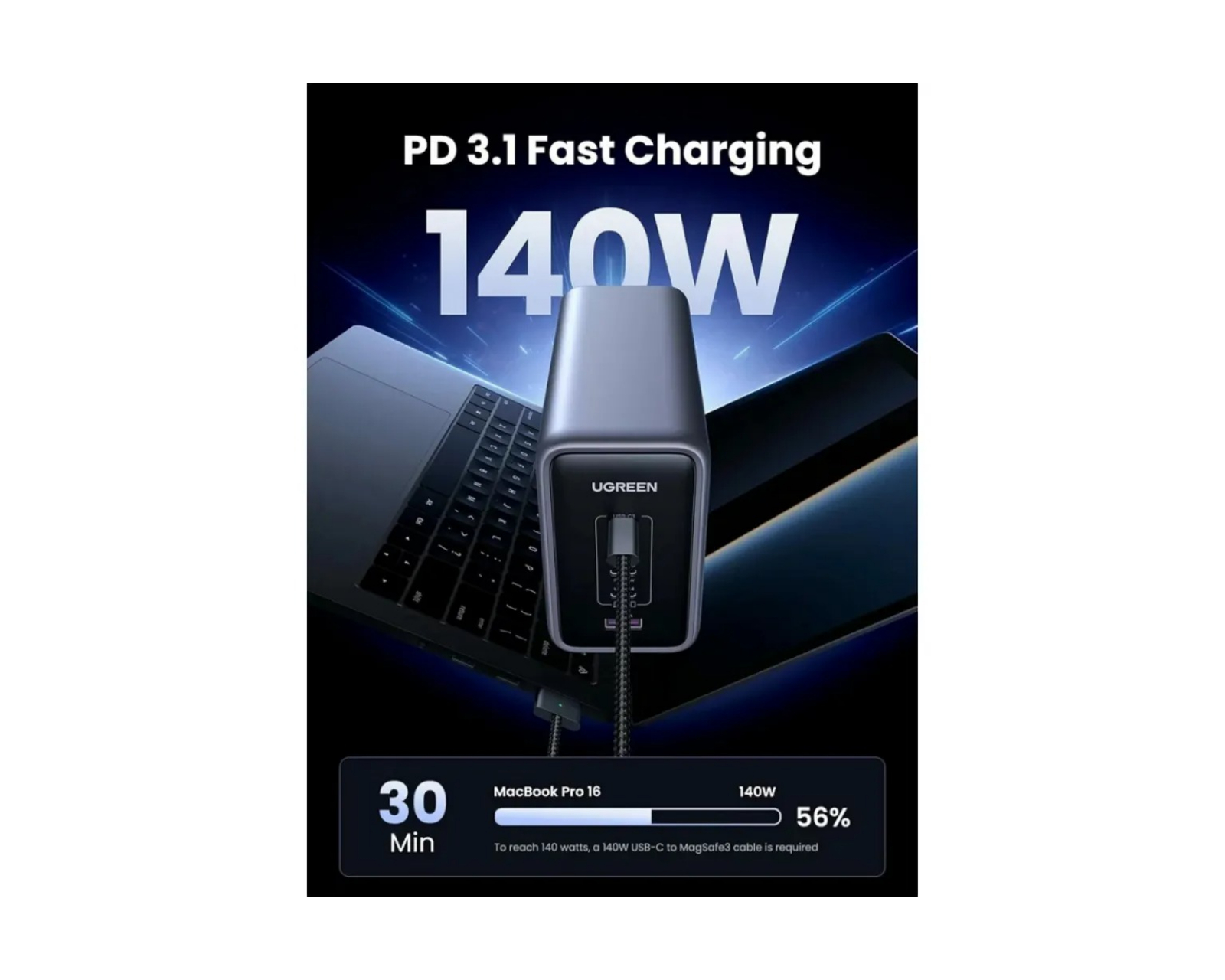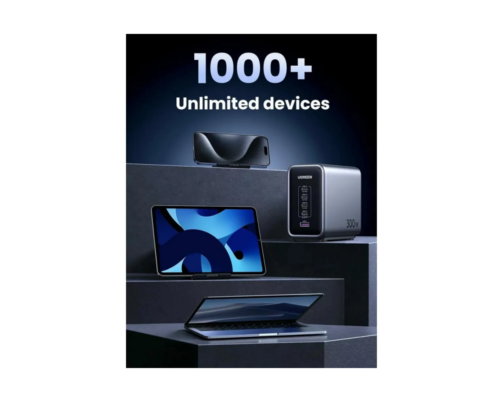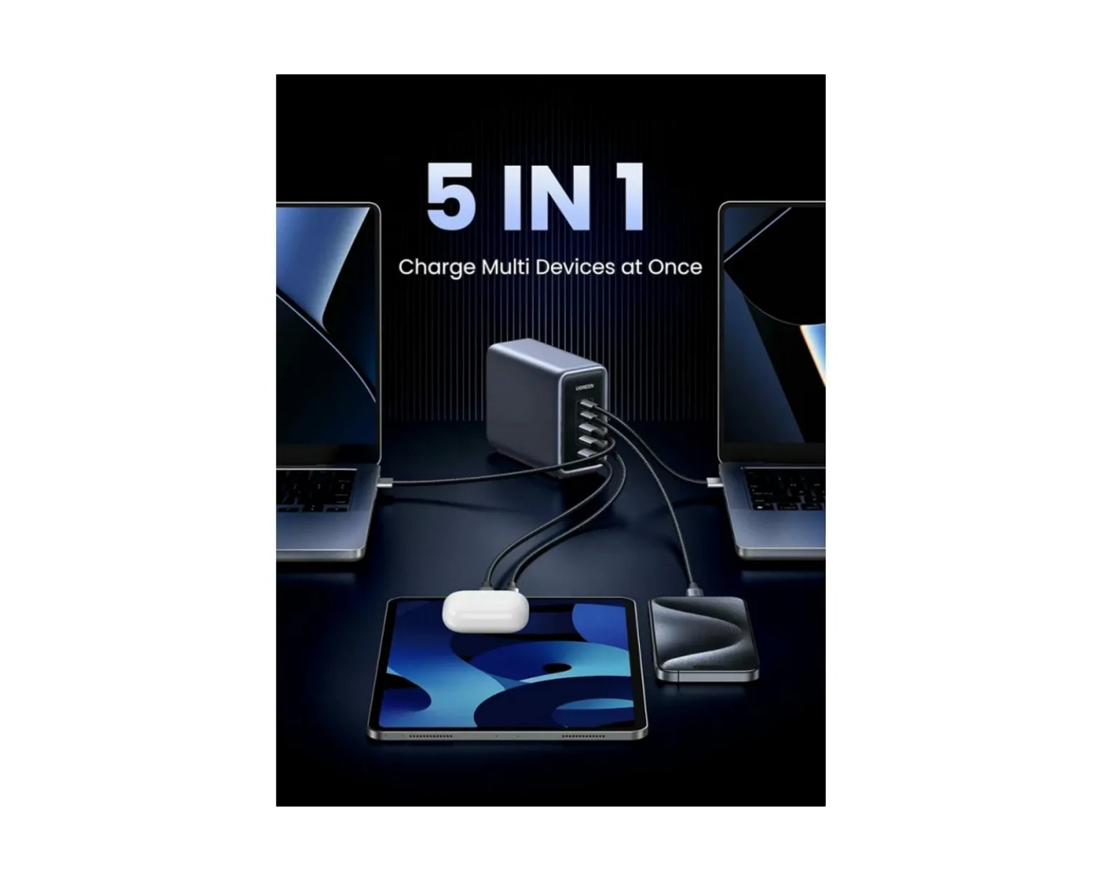 Vi introduserer UGREEN Nexode 300W 5-Port PD GaN bordlader, den kraftige laderen som vil revolusjonere måten du lader enhetene dine på. Laderen er designet for den moderne bærbare brukeren og har en imponerende supereffekt på 300 W, slik at du enkelt kan lade opptil 5 enheter samtidig. Si farvel til sammenfiltrede ledninger og langsomme ladetider - UGREEN Nexode er her for å levere hastigheten, effektiviteten og bekvemmeligheten du har lett etter.En av de fremtredende funksjonene til denne laderen er dens evne til å drive ikke bare én, ikke to, men tre bærbare datamaskiner samtidig. Med USB C1-porten på hele 140 W og USB C2- og C3-portene på henholdsvis 100 W og 60 W, kan du lade de bærbare datamaskinene dine lynraskt. Enten du er en travel profesjonell som jobber på flere enheter, en student som sjonglerer oppgaver eller en kreativ person som bruker ressurskrevende programvare, har UGREEN Nexode det du trenger.