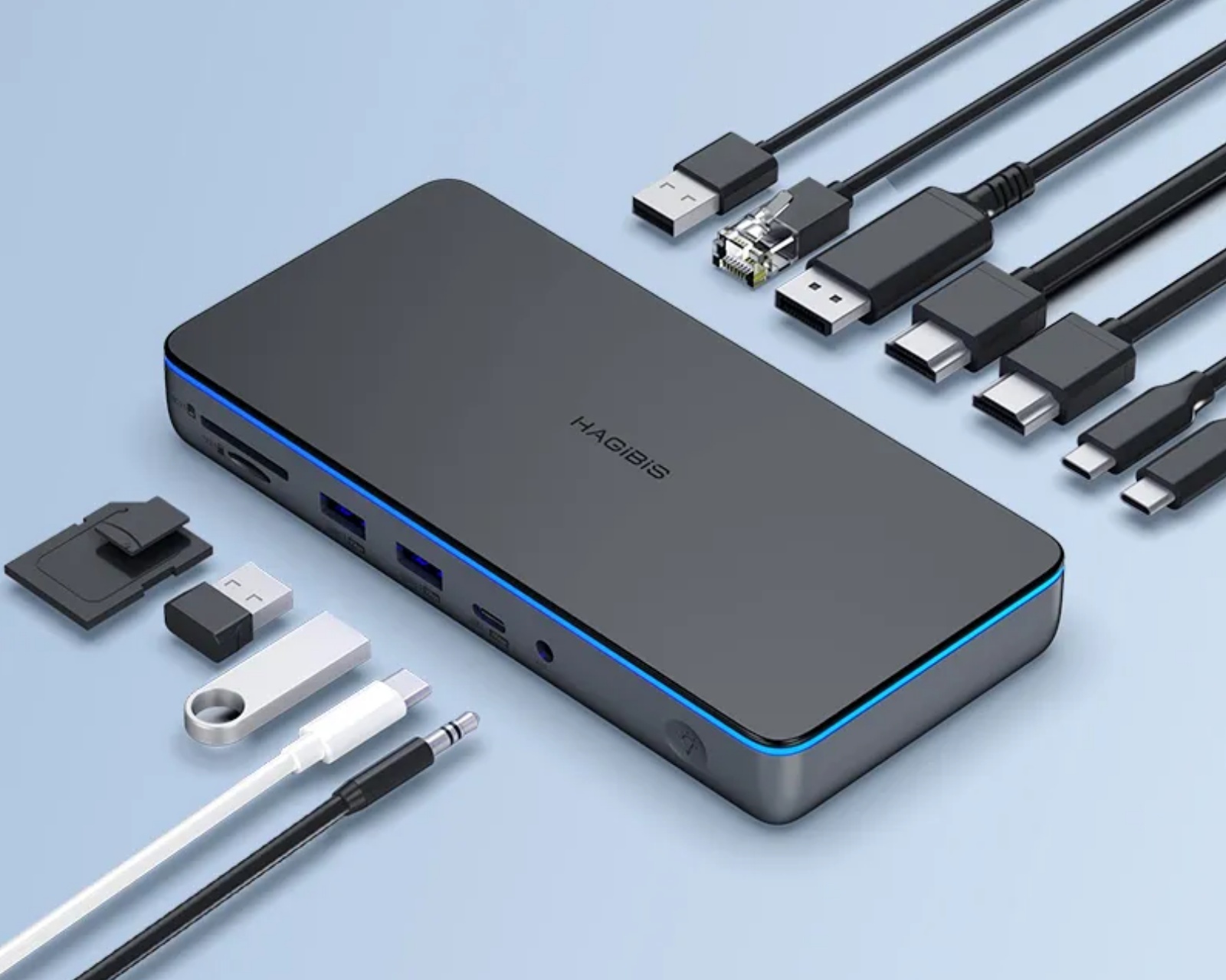 USB C Hub CD100 er en adapter fra Hagibis som tilbyr full funksjonalitet uten grenser. Den støtter samtidig tilkobling og bruk av flere grensesnitt, noe som gjør det mulig å ekspandere, koble til nettverk, lade og overføre data samtidig. Produktet er ment for brukere av Apple-datamaskiner, og kan koble tre skjermer for å vise forskjellig innhold, inkludert støtte for datamaskiner med M1- og M2-brikker.Hubens konstruksjon inkluderer en DisplayLink-brikke som løser begrensninger ved multi-skjermvisning og muliggjør friksjonsfri omkobling mellom speilingsmodus og utvidet modus. Hubben støtter 8K-oppløsning ved 30Hz og 4K ved 60Hz for et klart og detaljert bildekvalitet. Den har også 100W Power Delivery med beskyttelse mot overspenning. Det innebærer at hubben kan lade tilkoblede enheter raskt, selv om det faktiske forbruket alltid er ≤ 85W da hubben krever 15W til sin egen strømforsyning.