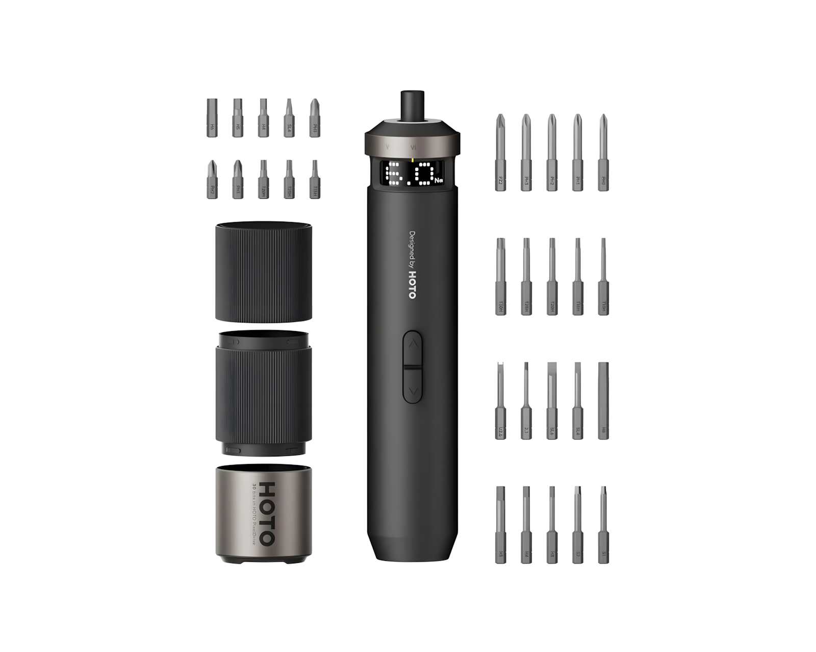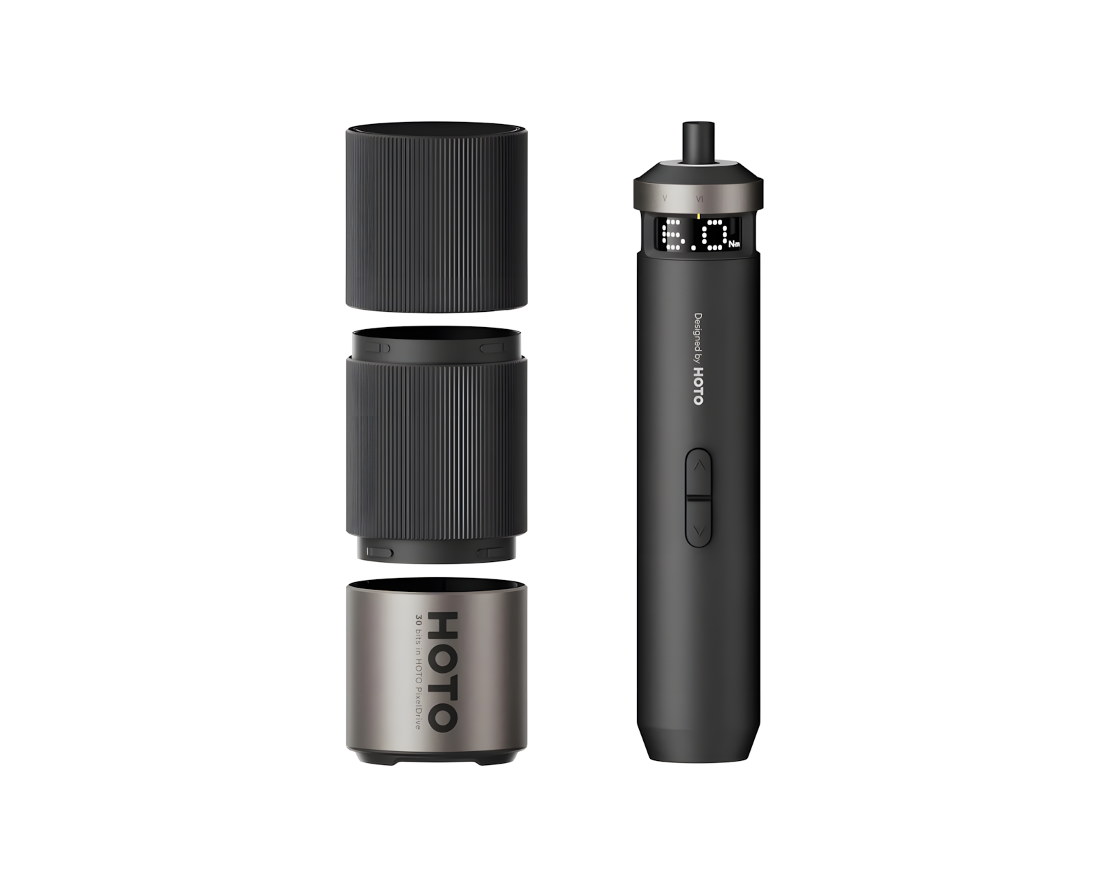 PixelDrive er en trådløs skrutrekker fra HOTO som tilbyr presisjonskraft og kontroll for brukere som søker nøyaktighet i sine DIY-prosjekter. Den er utstyrt med en digital samling funksjoner, inkludert en enknapps multifunksjonsknapp samt sanntidsavlesninger som gjør skruing til en eksakt oppgave. Enheten har en hastighetskontroll med to nivåer og tilbyr en maksimal kapasitet på 200 RPM for raskere arbeid.Skrutrekkeren bruker et smart visningssystem som tydelig viser aktuelle dreiemomentnivåer og batterinivå, noe som eliminerer usikkerhet rundt bruks effektivitet. Den har seks forskjellige dreiemomentinnstillinger fra 0,5 N·m til 6 N·m, noe som gjør den egnet for en mengde ulike materialer, fra myke plasttyper til harde treslag. Dens design er moderne og strukturert, med en trefoldig sylinder som effektivt oppbevarer opptil 30 biter for rask tilgang og bruk. Produktet er bygget for pålitelighet og enkel bruk, noe som garanterer stabil ytelse gjennom hele arbeidsprosessen.