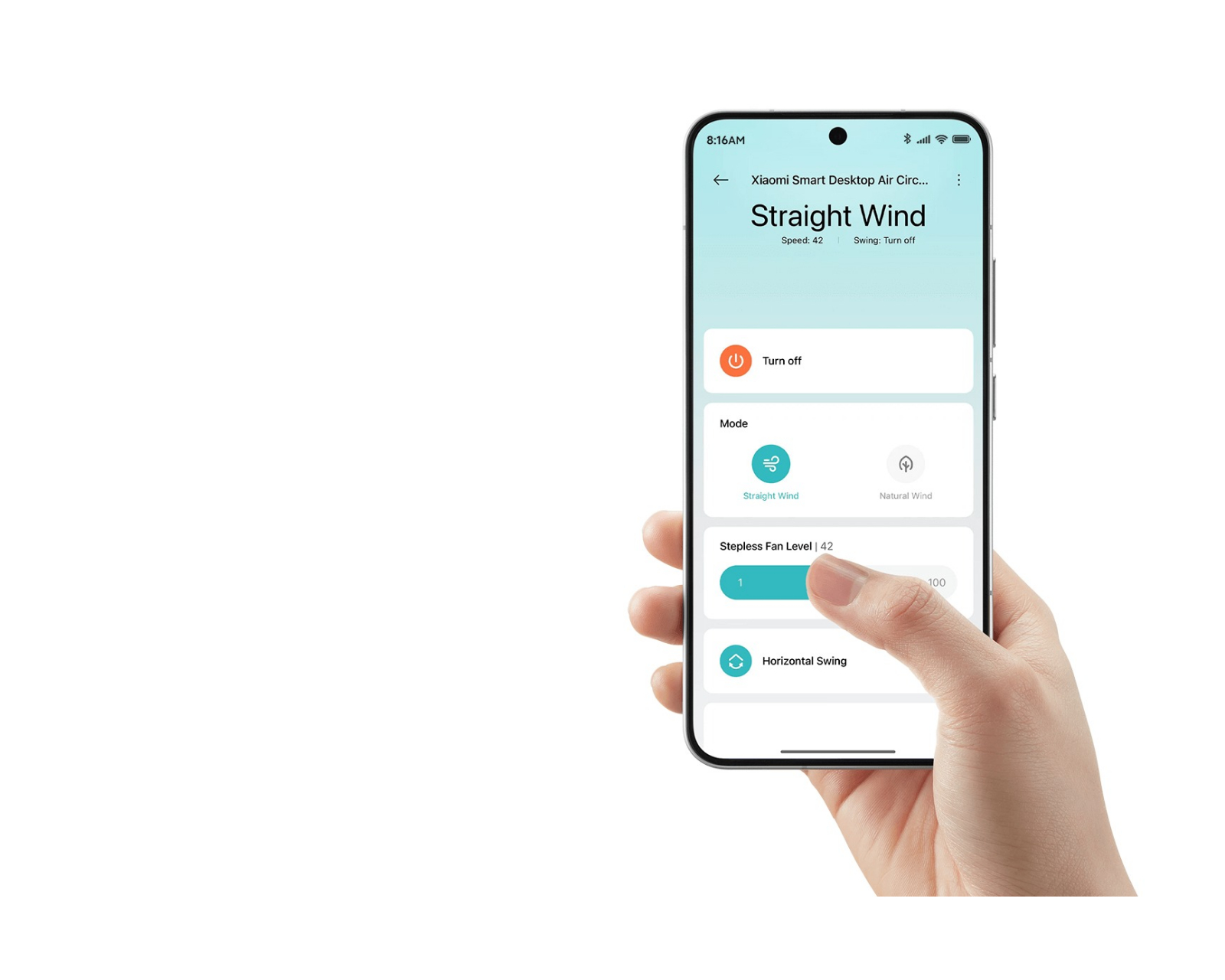 Xiaomi Smart Desktop Luftsirkulasjonsvifte er en kompakt vifte som tilbyr kraftig luftsirkulasjon og er designet for å passe inn i alle miljøer. Med et lydnivå på kun 28,4 dB(A) og 100 forskjellige hastighetsinnstillinger, gir viften en stille og effektiv løsning for å opprettholde et behagelig innemiljø. Den er utstyrt med en Type-C-port for bærbar lading, noe som gjør den egnet for bruk når som helst og hvor som helst.Viftens konstruksjon inkluderer en stabil base som er halvparten så stor som et A4-ark, noe som gjør den lett å flytte og plassere. Den tilbyr et sterkt luftstrøm på 1180 m³/t og kan sirkulere luft i et rom på opptil 20 m² på omtrent tre minutter. Med automatisk 3D-luftfordeling som gir 120° horisontal og 100° vertikal sving, sikres det at den kalde luften når hvert hjørne av rommet. Viften kan også drives av en Xiaomi power bank for fleksibilitet og bærbarhet.