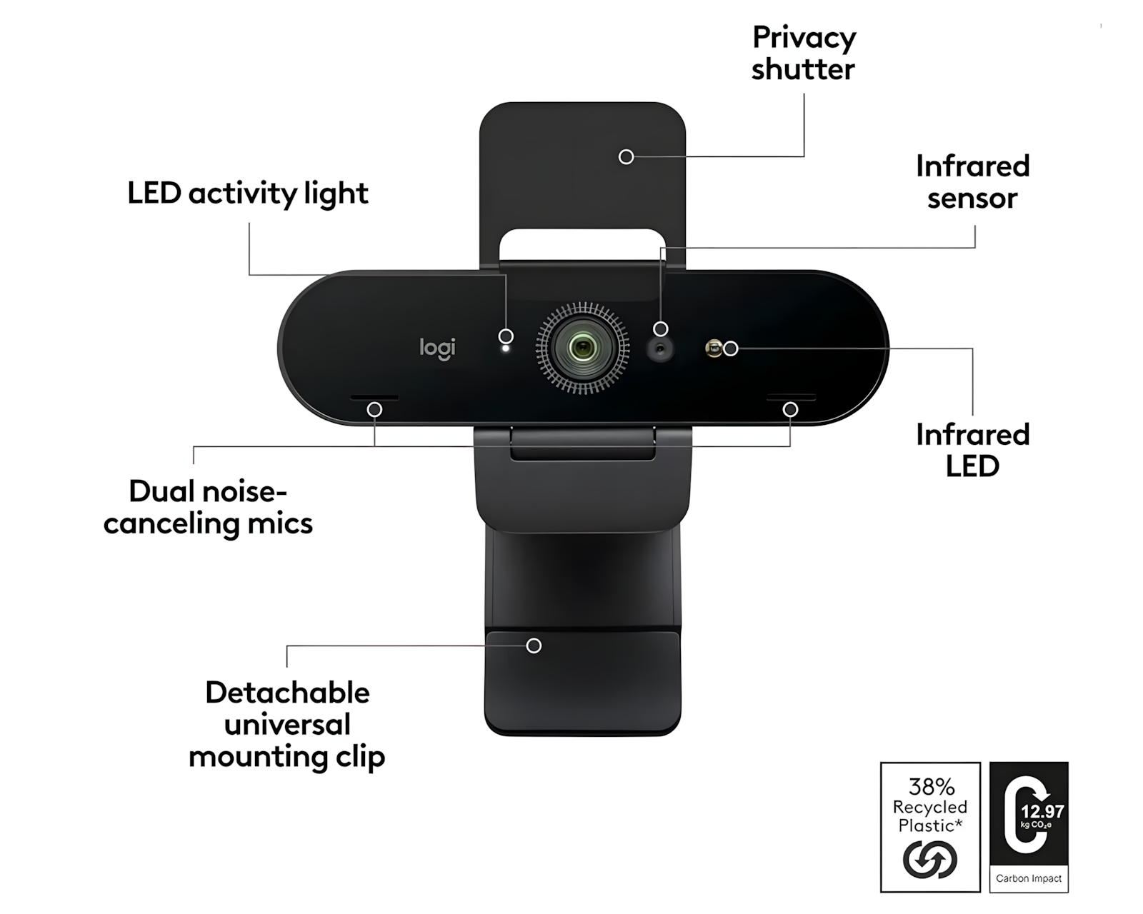 BRIO 4K er et profesjonelt webkamera fra Logitech som tilbyr enestående videokvalitet og er designet for forretningsbruk. Med en oppløsning på opptil 4K ved 30 fps, autofokus og 5x digital zoom sørger den for at hvert videokonferanse blir tydelig og detaljert. Den støtter også Windows Hello for sikker pålogging via ansiktsgjenkjenning.Kamerahuset er laget av lav-kullblatt aluminium, som gir en bærekraftig konstruksjon samtidig som det minimerer miljøpåvirkningen. Med avansert RightLight 3-teknologi justeres eksponeringen automatisk for å garantere optimal bildekvalitet, uansett lysforhold. I tillegg har den doble omnidireksjonale mikrofoner med støydemping som fanger opp lyden klart fra en radius på opptil 1,2 meter, noe som gjør den ideell for profesjonelle samtaler. Webkameraet er sertifisert for Zoom og Google Meet, noe som betyr enkel integrering med vanlige møteprogrammer.