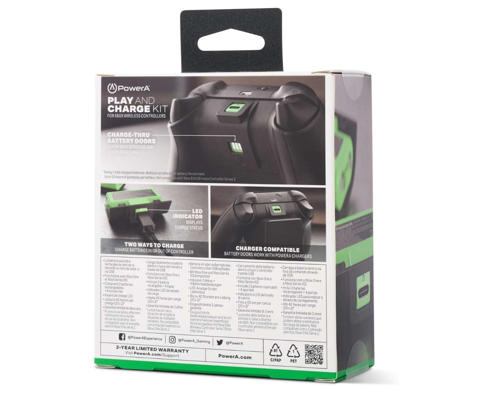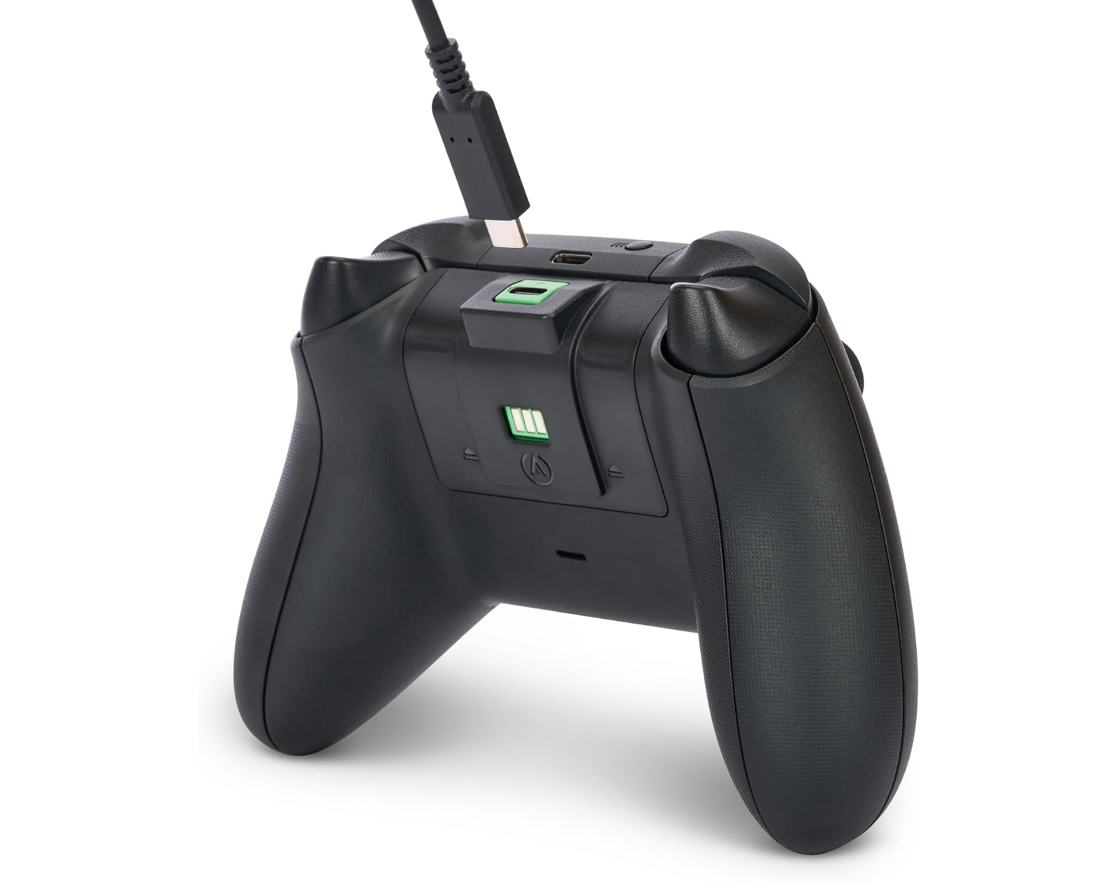 Play & Charge Kit for Xbox Series X|S er en energiløsning fra PowerA som kombinerer lading og spilling i én pakke. Kitet inneholder to oppladbare batterier og fire batterilokk, noe som gir fleksibilitet for gamere som ønsker å unngå å stadig bytte ut batterier. En LED-batteriindikator gir informasjon om ladestatus, noe som letter håndteringen av energinivåene.Kitet er kompatibelt med Xbox Series X|S og Xbox One trådløse kontroller. Materialvalget er plast, og hele kitet veier 167,83 gram, noe som gjør det lett å håndtere og transportere. Med en strømstyrke på 10 watt og en inngangsspenning på 240 volt, er det konstruert for å effektivt lade batteriene under spilling eller hvilemodus. USB Type A-tilkoblingen tillater en enkel tilkobling til enheten for lading.